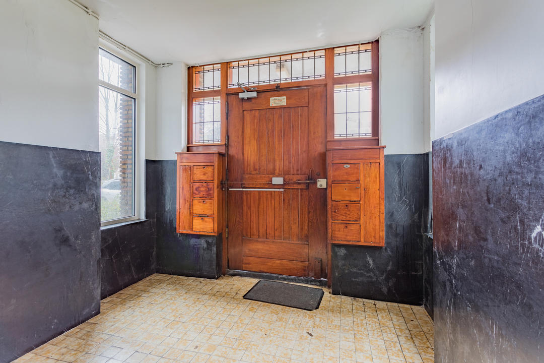Afgesloten entree met brieven- en bellentableau, lift en trap naar de 2e verdieping.