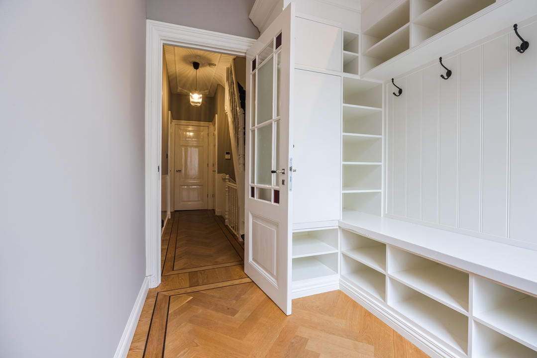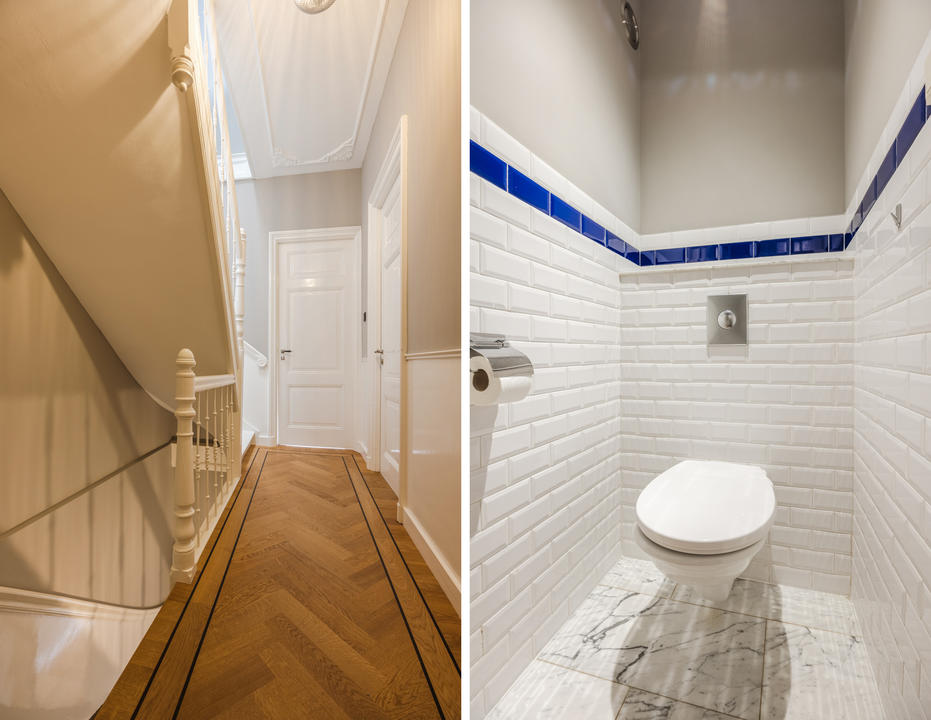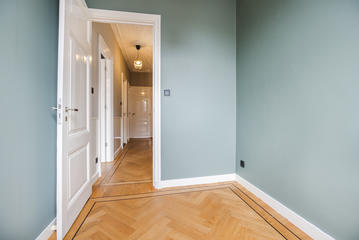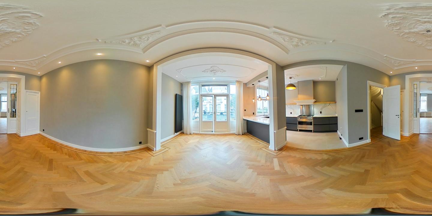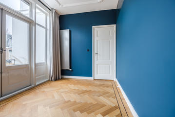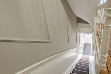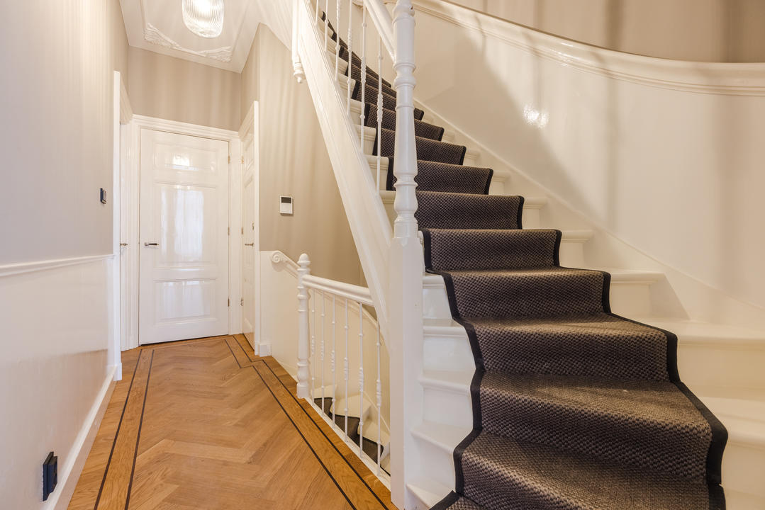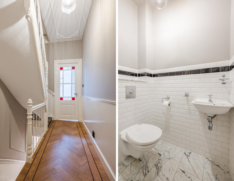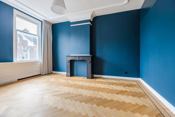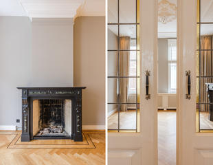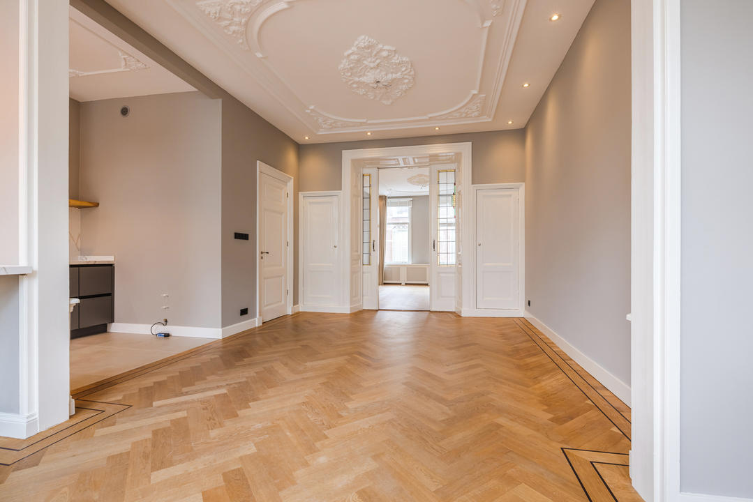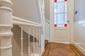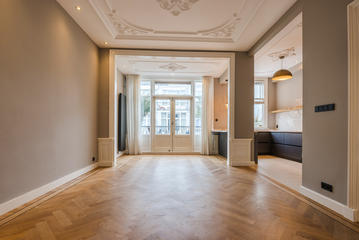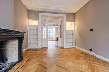 - De woning is zeer fraai afgewerkt met visgraat parketvloer met bies op de 1e en 2e verdieping, originele paneeldeuren en schouwen, ornamenten plafonds, op maat gemaakte radiatorombouwen