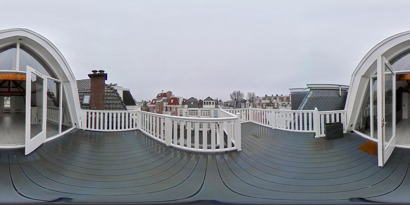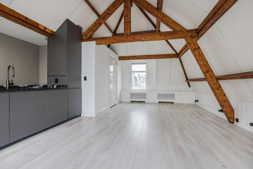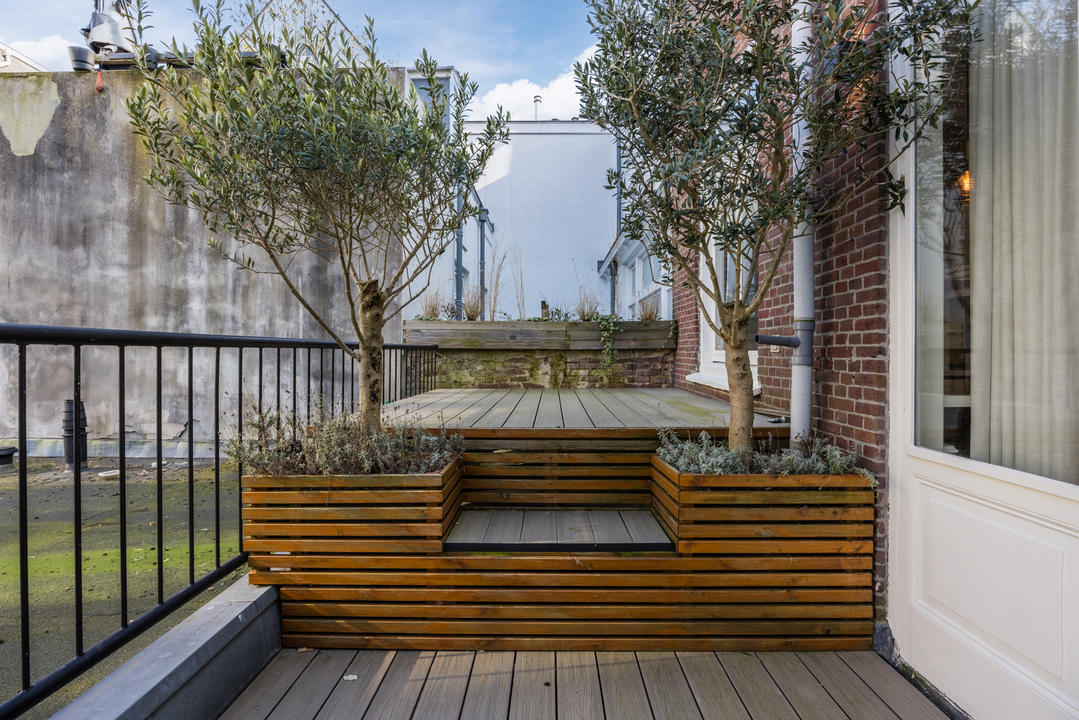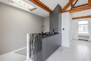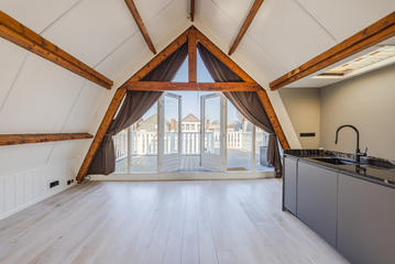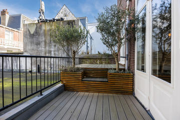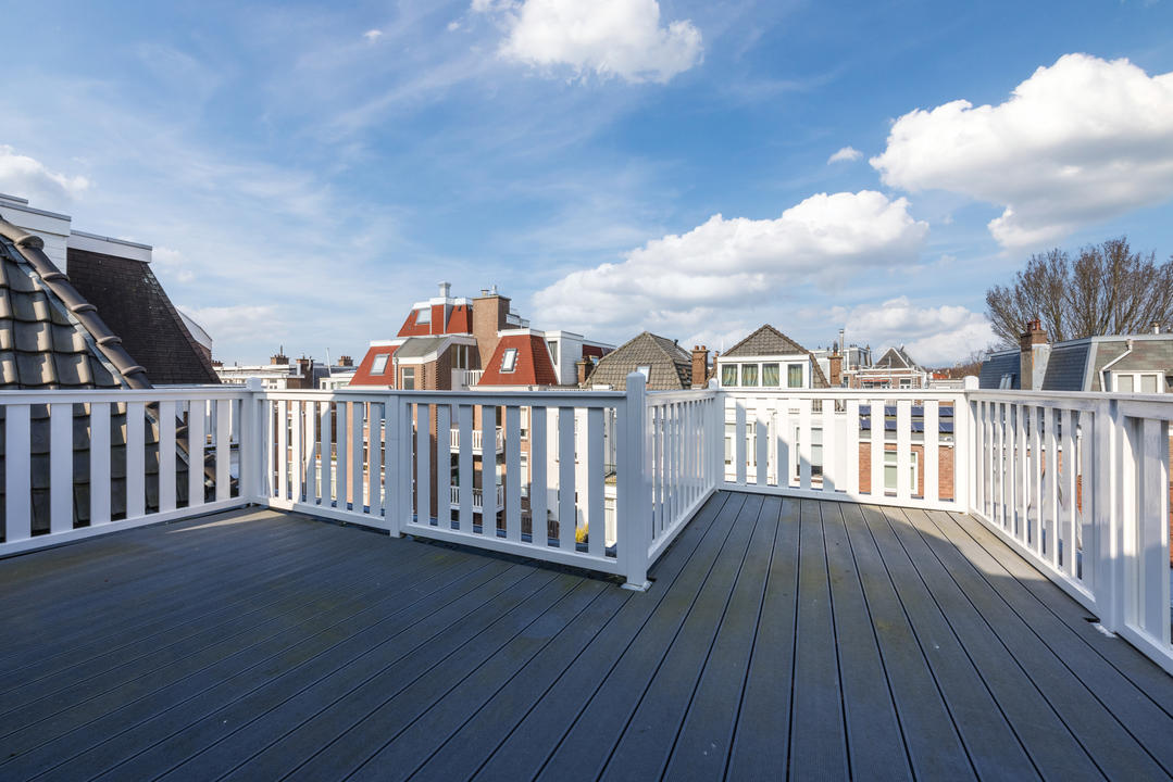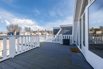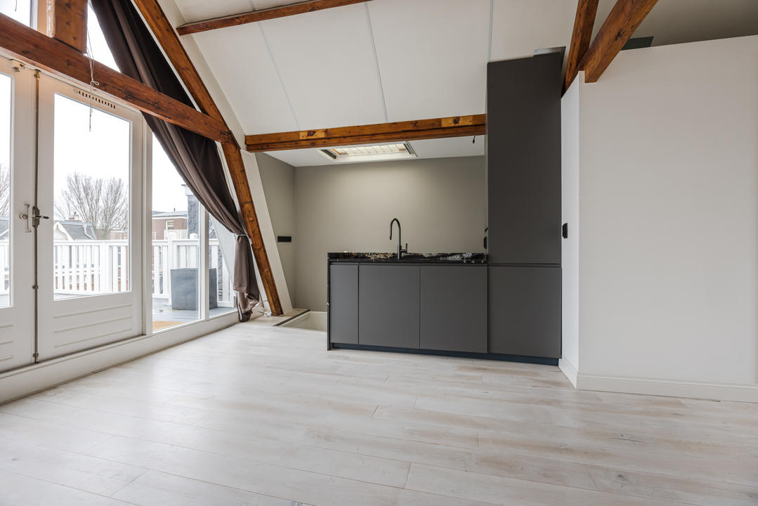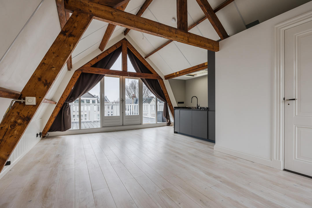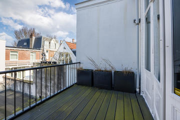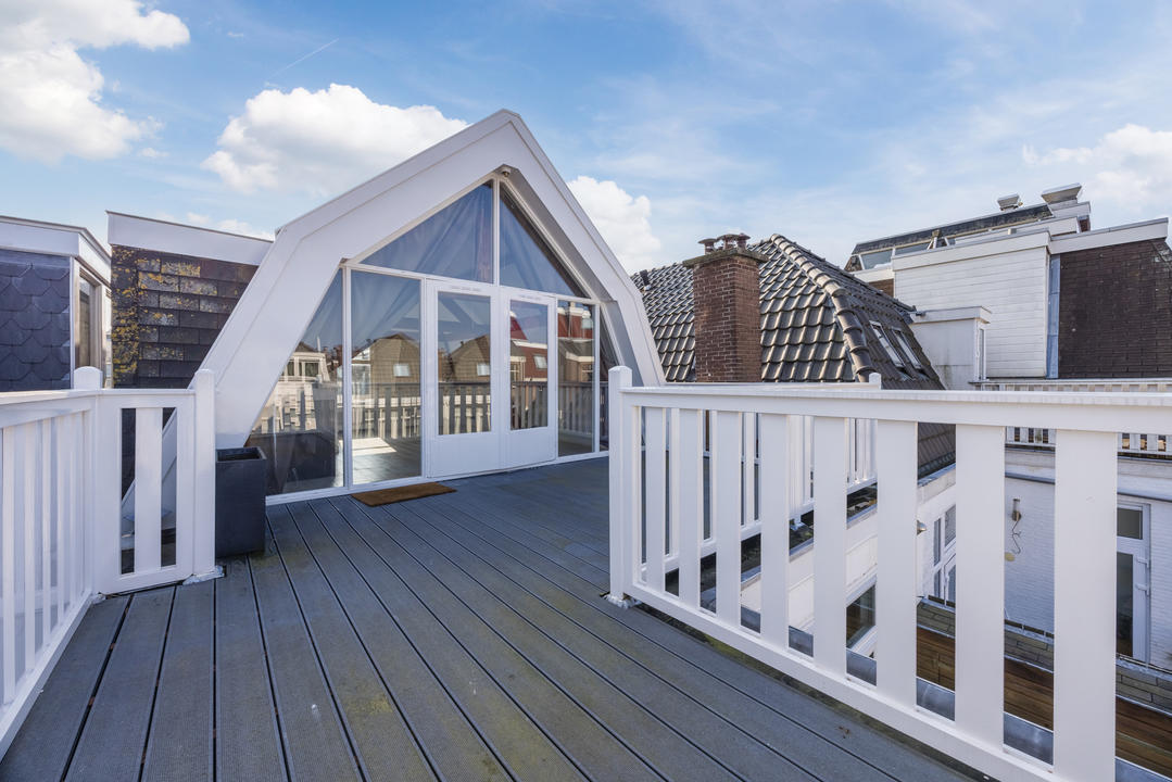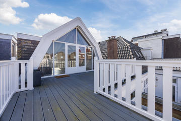 Terug op de overloop leidt de trap naar de bovenste etage, met bovenin een karakteristiek daklicht met glas-in-lood. Deze verdieping is werkelijk uniek. Aan de achterzijde is een deel van de gevel teruggelegd en voorzien van een grote glazen pui, waardoor een zee aan licht binnenvalt. De originele balken zijn in het zicht gelaten, dat zorgt voor karakter en warmte. De ruimte kan uitstekend functioneren als zelfstandig appartement voor inwonende kinderen, gasten of als werkruimte. Er is een kitchenette met wasbak en koelkast, een kast met opstelplaats voor de c.v.-combiketel en een moderne tweede badkamer met douche, wastafel en vrijhangend toilet. Openslaande deuren geven toegang tot het heerlijke dakterras. Door het formaat en de ligging kan hier in de zomer van circa 07.00 tot 21.00 uur van de zon worden genoten.