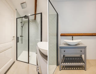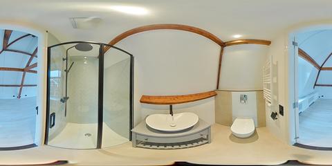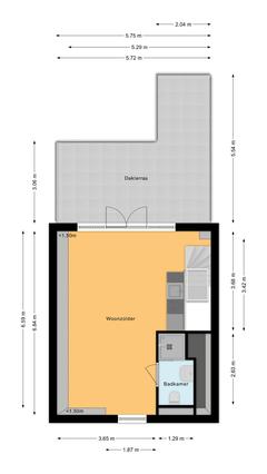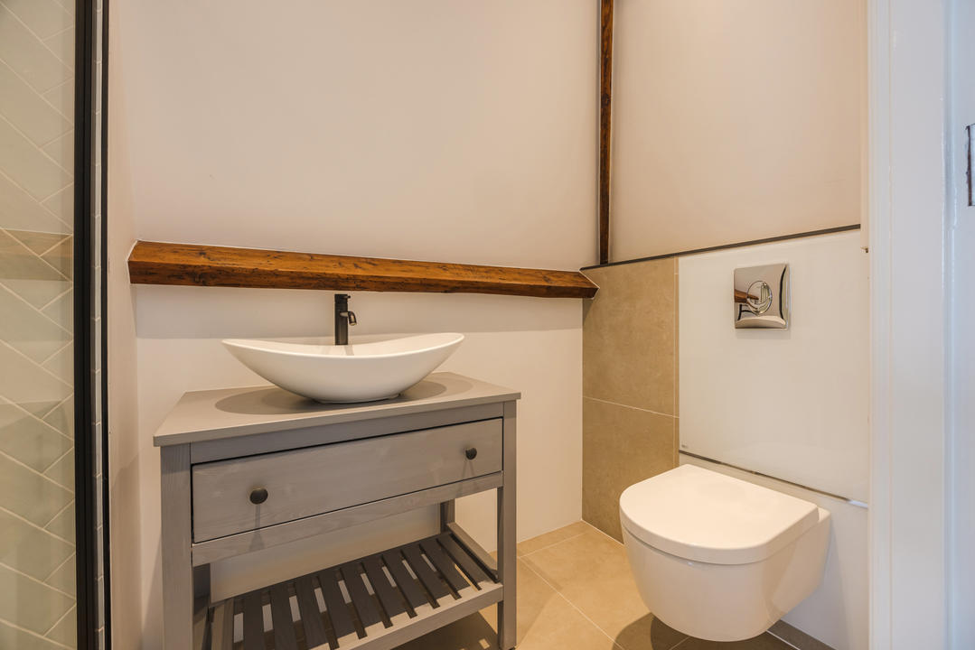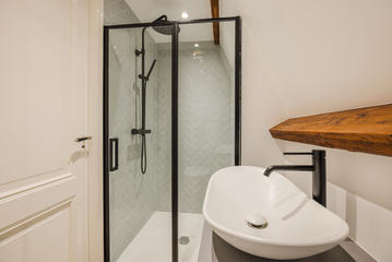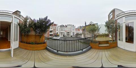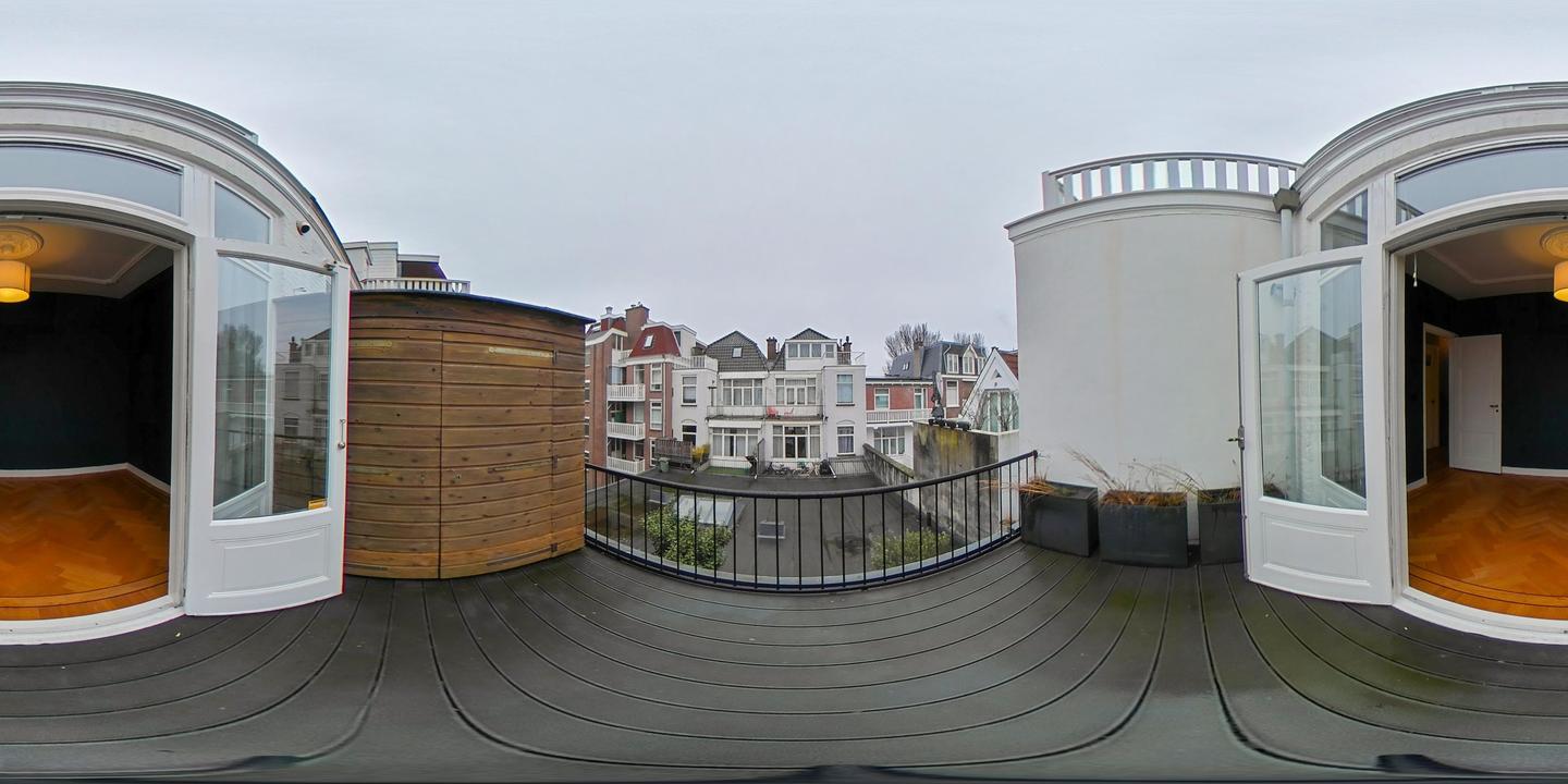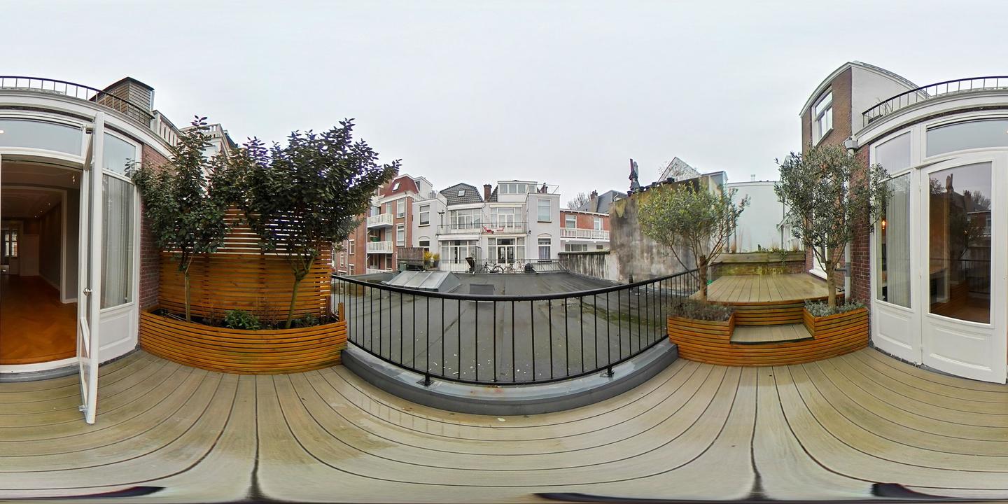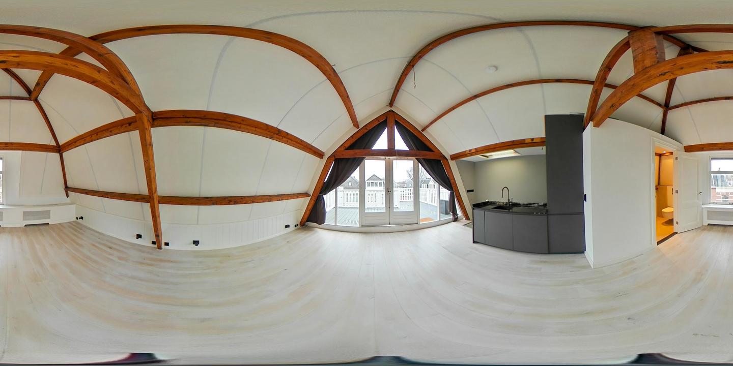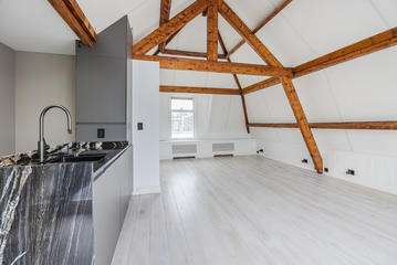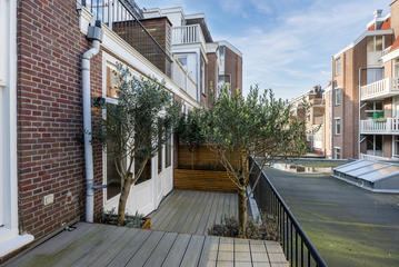 Terug op de overloop leidt de trap naar de bovenste etage, met bovenin een karakteristiek daklicht met glas-in-lood. Deze verdieping is werkelijk uniek. Aan de achterzijde is een deel van de gevel teruggelegd en voorzien van een grote glazen pui, waardoor een zee aan licht binnenvalt. De originele balken zijn in het zicht gelaten, dat zorgt voor karakter en warmte. De ruimte kan uitstekend functioneren als zelfstandig appartement voor inwonende kinderen, gasten of als werkruimte. Er is een kitchenette met wasbak en koelkast, een kast met opstelplaats voor de c.v.-combiketel en een moderne tweede badkamer met douche, wastafel en vrijhangend toilet. Openslaande deuren geven toegang tot het heerlijke dakterras. Door het formaat en de ligging kan hier in de zomer van circa 07.00 tot 21.00 uur van de zon worden genoten.
