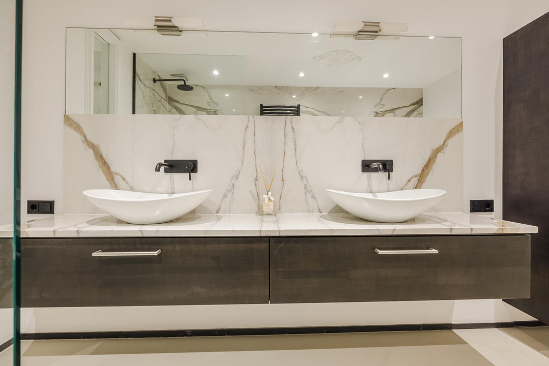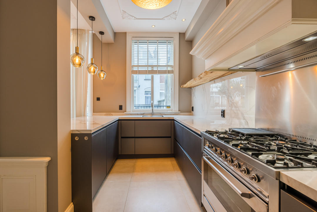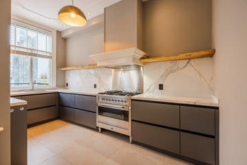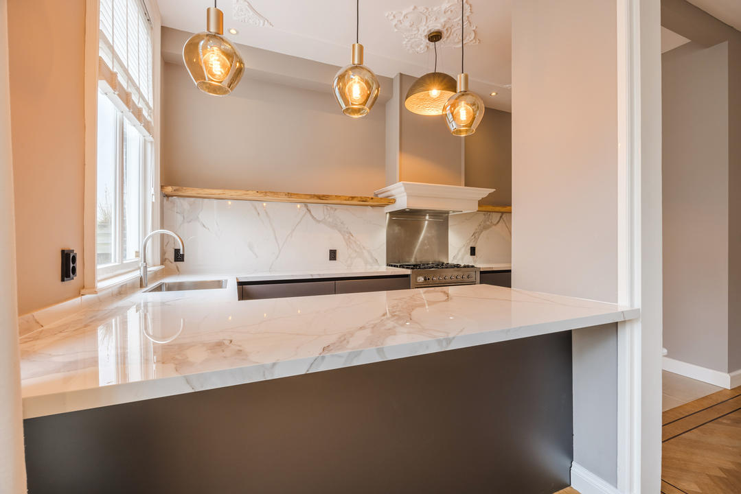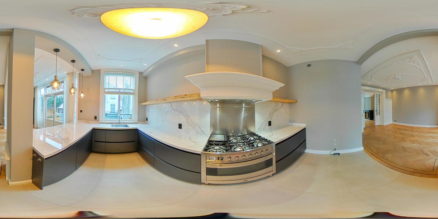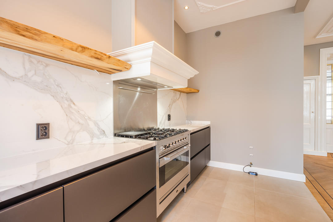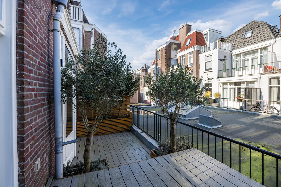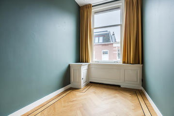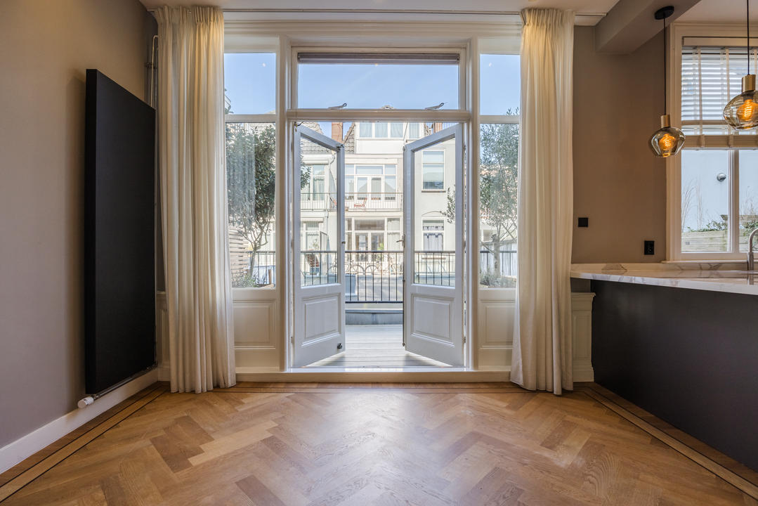 Overloop met vaste opbergkast en modern toilet met vrijhangend closet en fonteintje. Op de vloer ligt een prachtige visgraat parketvloer met bies en band, welke is doorgelegd in nagenoeg de gehele verdieping. Aan de voorzijde bevindt zich een separate voorzijkamer, thans ingericht als garderobekamer met een fraaie op maat gemaakte kastenwand. De woon- en eetkamers en suite vormen een indrukwekkende leefruimte. De originele schuifseparatie met glas-in-lood schuifdeuren wordt omlijst door vier vaste kasten en zorgt voor sfeer én praktische bergruimte. De woonkamer aan de voorzijde beschikt over een originele schouw met gashaard en een rijk gedetailleerd ornamentenplafond met geďntegreerde verlichting, die de kamer extra uitstraling geeft. Aan de achterzijde ligt de riante eetkamer, waarbij de serre is betrokken en de ruimte over de volledige breedte is doorgebroken richting de keuken. Dit heerlijke vertrek vormt het hart van de woning. Openslaande deuren halen ’s zomers buiten naar binnen en geven toegang tot het beschutte terras met op maat gemaakte plantenbakken en een zitje. Het terras ligt gunstig op de namiddag- en avondzon (circa 16.00 tot 20.00 uur in de zomer). De luxe keuken is in 2021 vernieuwd en uitgevoerd in een L-opstelling met een gezellige bar aan de kamerzijde. De combinatie van strakke lijnen en hoogwaardige apparatuur geeft de keuken een moderne en tegelijk sfeervolle uitstraling. Voorzien van onder andere een 6-pits fornuis met wokbrander en oven, afzuigschouw, vaatwasser, Quooker en veel werk- en bergruimte.