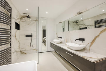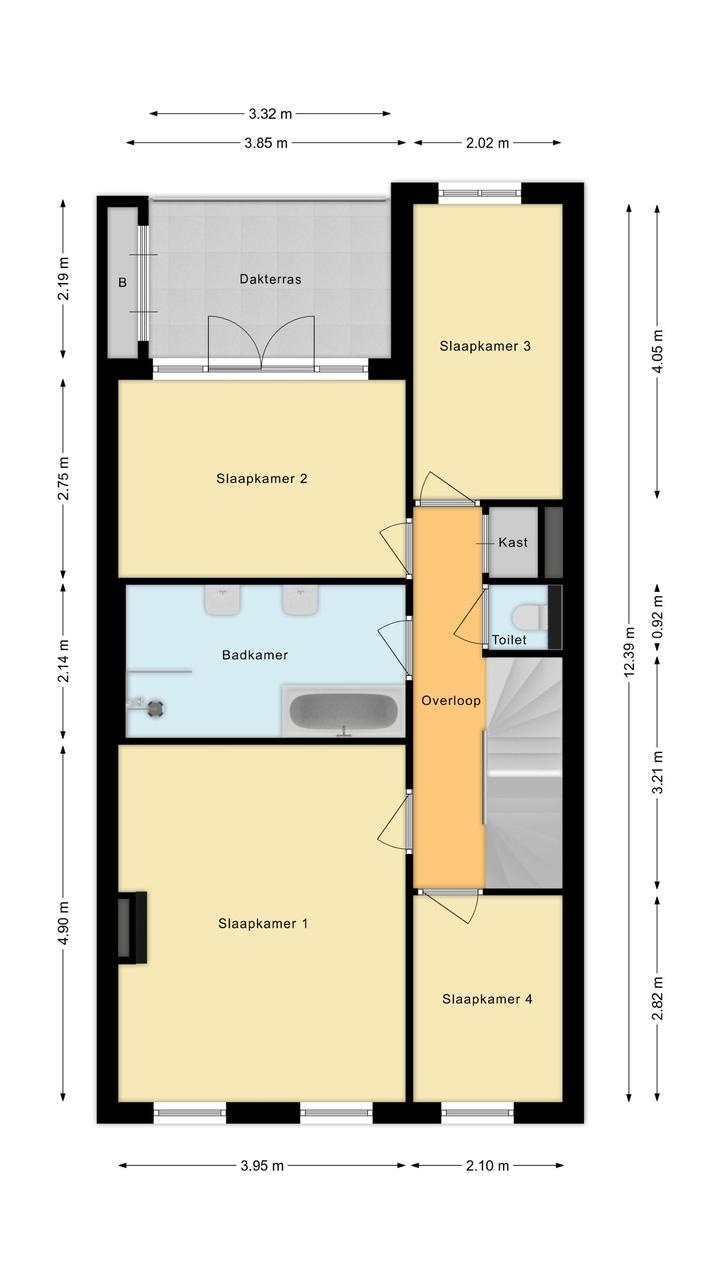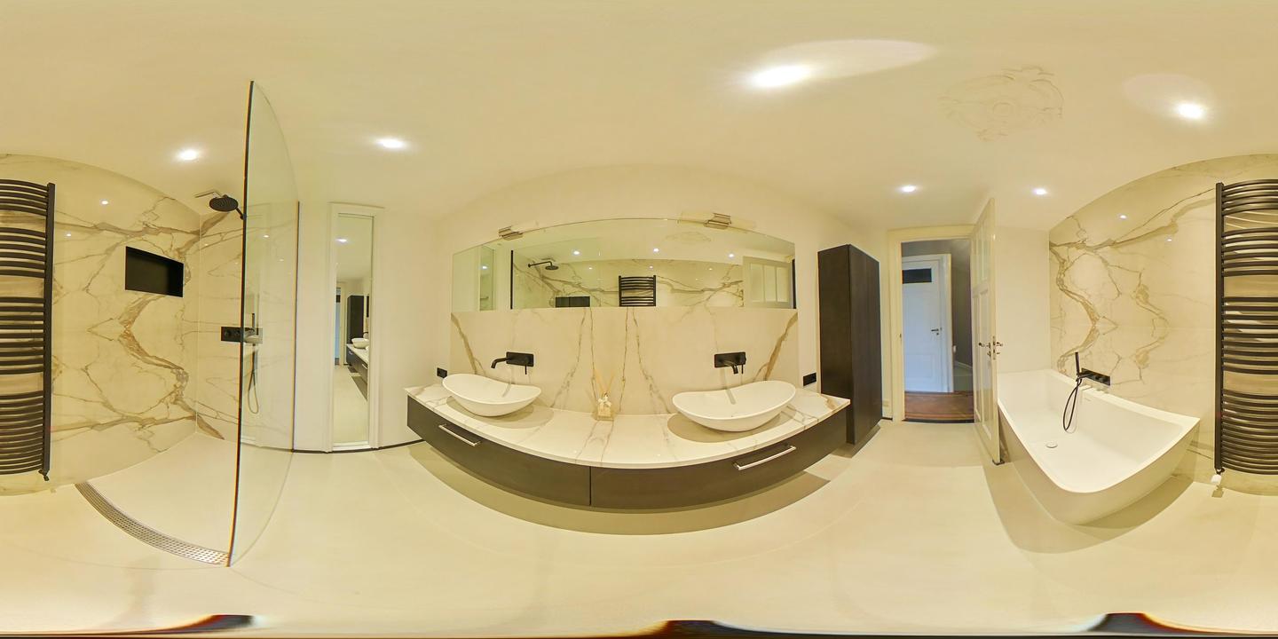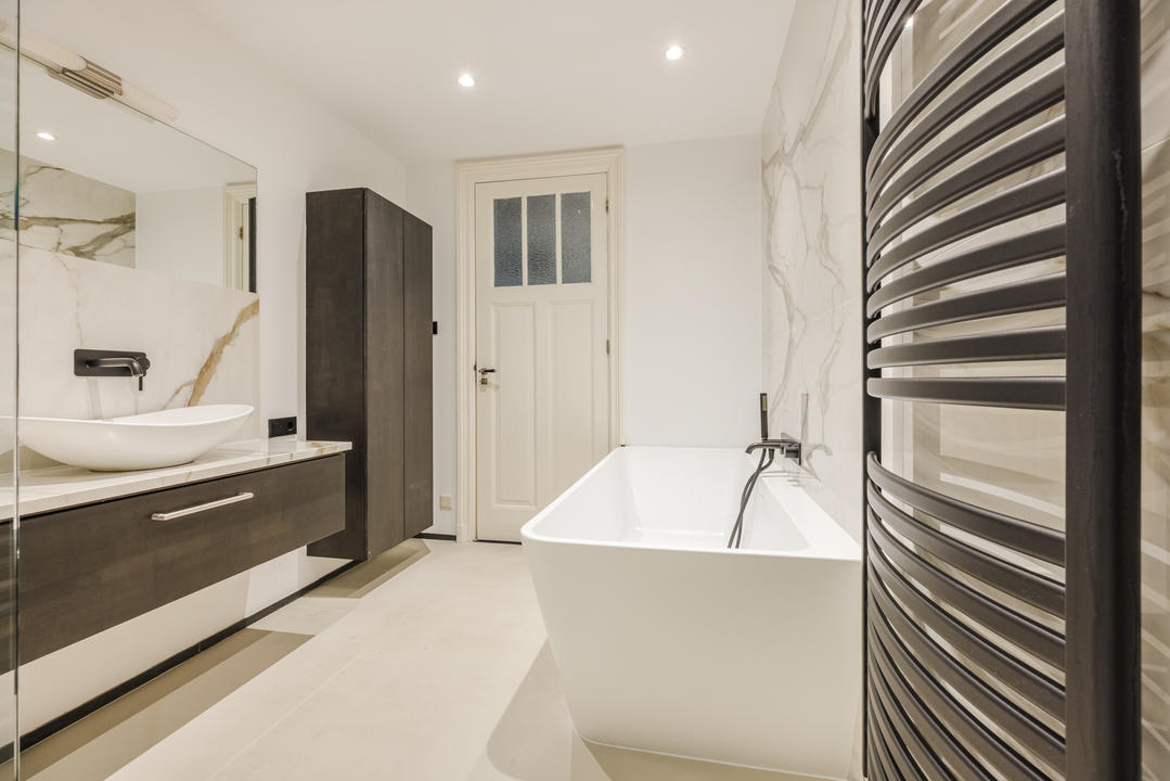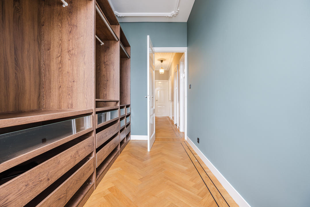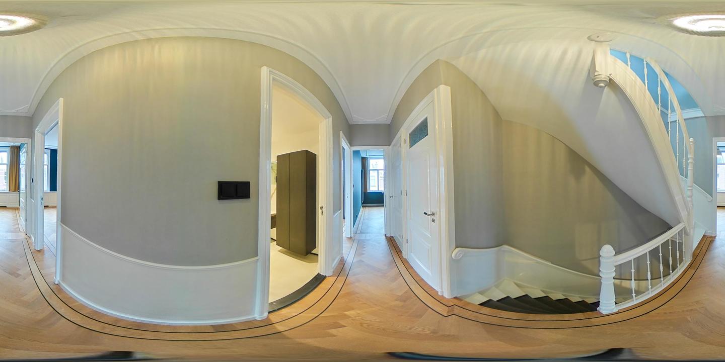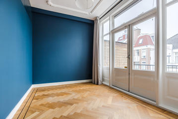 Via een prettig lopende brede trap met stijlvolle originele balusters wordt de tweede verdieping bereikt. Overloop met tweede modern toilet (vrijhangend) en een separate kast met wasmachine- en drogeraansluiting. Op deze verdieping bevinden zich vier slaapkamers. Aan de voorzijde liggen twee kamers, waarvan één is voorzien van een originele schouw en toegang tot extra bergruimte boven het verlaagde plafond van de badkamer. Tussen de voor- en achterkamers in ligt de moderne badkamer, compleet uitgevoerd met ligbad, inloopdouche met hand- en regendouche, glazen douchescherm, dubbele wastafel geďntegreerd in wastafelmeubel, designradiator en mechanische ventilatie. Aan de achterzijde bevinden zich nog twee ruime slaapkamers. De grootste slaapkamer beschikt over openslaande deuren naar het eveneens beschutte tweede balkon. Ook deze slaapkamer heeft extra bergruimte boven het verlaagde plafond van de badkamer. De naastgelegen achterzijkamer is momenteel ingericht als riante kledingkamer. Ook deze verdieping is voorzien van een visgraat parketvloer met bies en fraaie ornamentenplafonds.