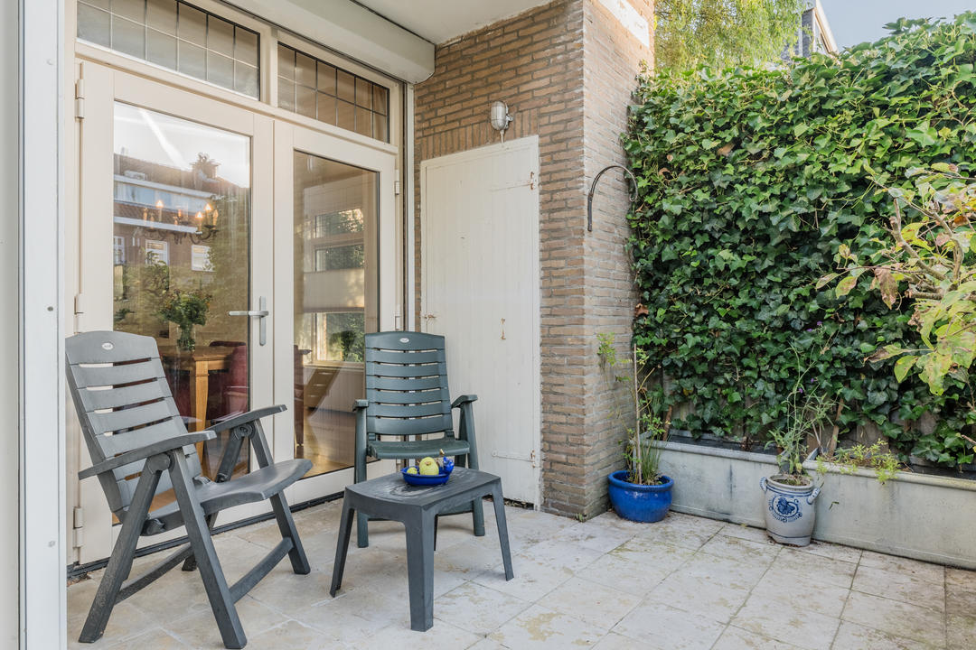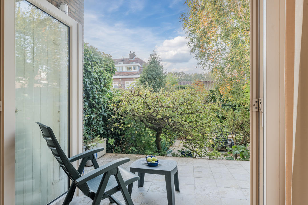 Gesloten entree met drie treden naar de verhoogde parterre en de entree van het appartement. Ruime hal met meterkast en toilet met fontein. De woonkamer heeft een royale, L-vormige indeling doordat de voormalige slaapkamer aan de voorzijde bij de leefruimte is betrokken. Indien gewenst is deze eenvoudig weer als tweede slaapkamer in te delen. Dankzij de hoekligging en de extra ramen in de zijgevel geniet de woning van veel natuurlijke lichtinval. De woonkamer beschikt over een allesbrander, 2 vaste kasten, glas in lood bovenlichten en openslaande deuren naar de tuin. De tuin, gelegen op het zuidoosten, bestaat uit twee gedeelten: een terras op gelijke hoogte met de woning, met bergkast met opstelplaats c.v.-combiketel, en een iets lager gelegen deel met een zij-ingang en een berging. Door de gunstige ligging is er in de zomermaanden van circa 7:00 tot 19:00 uur direct zonlicht.
