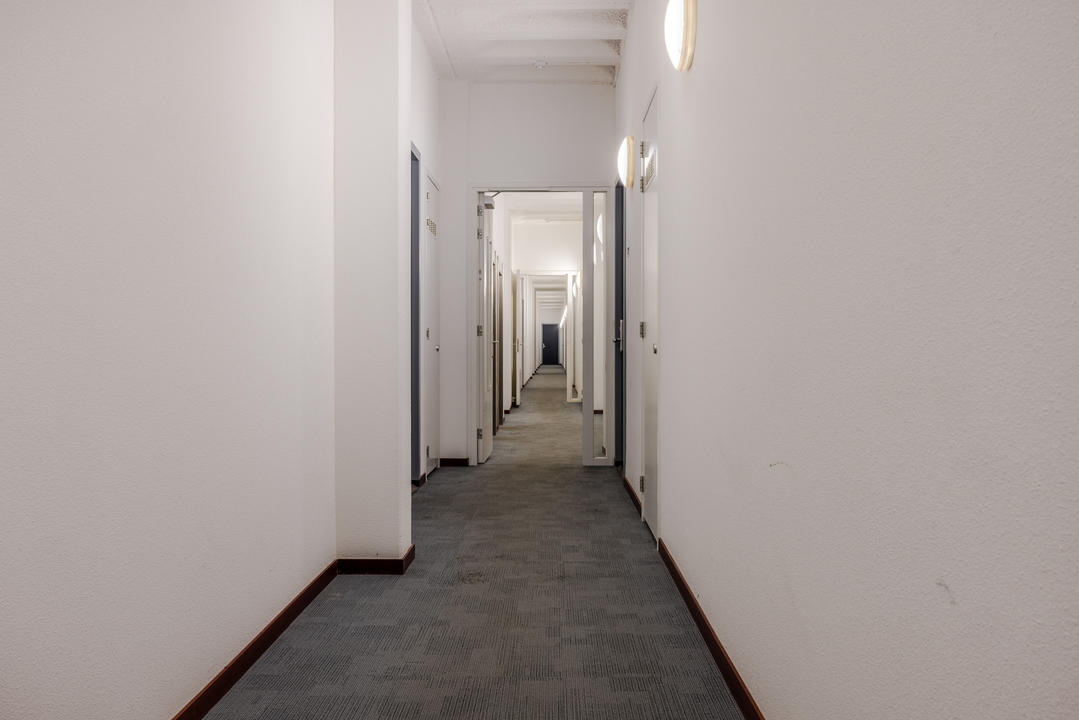 Op straatniveau een bijzondere entree met hoge glazen panelen en schuifdeuren. Met lift en of trap naar vierde verdieping; gezamenlijke hal naar voordeur;