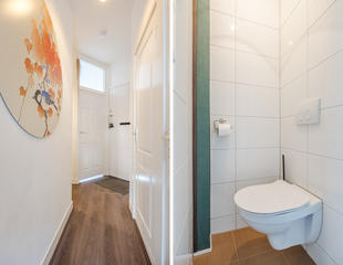 Via de voortuin met pad naar het portiek is de entree tot het appartement bereikbaar. Bij binnenkomst de hal met een vaste bergkast die momenteel dient als garderobe en een tweede vaste kast met wasmachineaansluiting. Daarnaast is er een modern betegeld toilet.