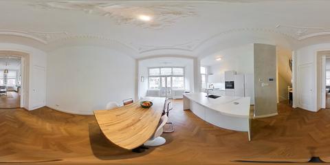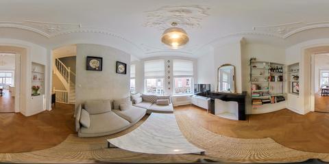 De eerste woonlaag vormt één stijlvol en samenhangend geheel. De verhouding tussen modern wooncomfort en klassieke elementen komt hier bijzonder goed tot zijn recht, met onder meer gerestaureerde plafondornamenten, karakteristieke en-suite deuren en een visgraat parketvloer met zwarte bies die de vertrekken drempelloos met elkaar verbindt. Deze combinatie onderstreept het luxe afwerkingsniveau, terwijl het karakter en de uitstraling behouden zijn gebleven.