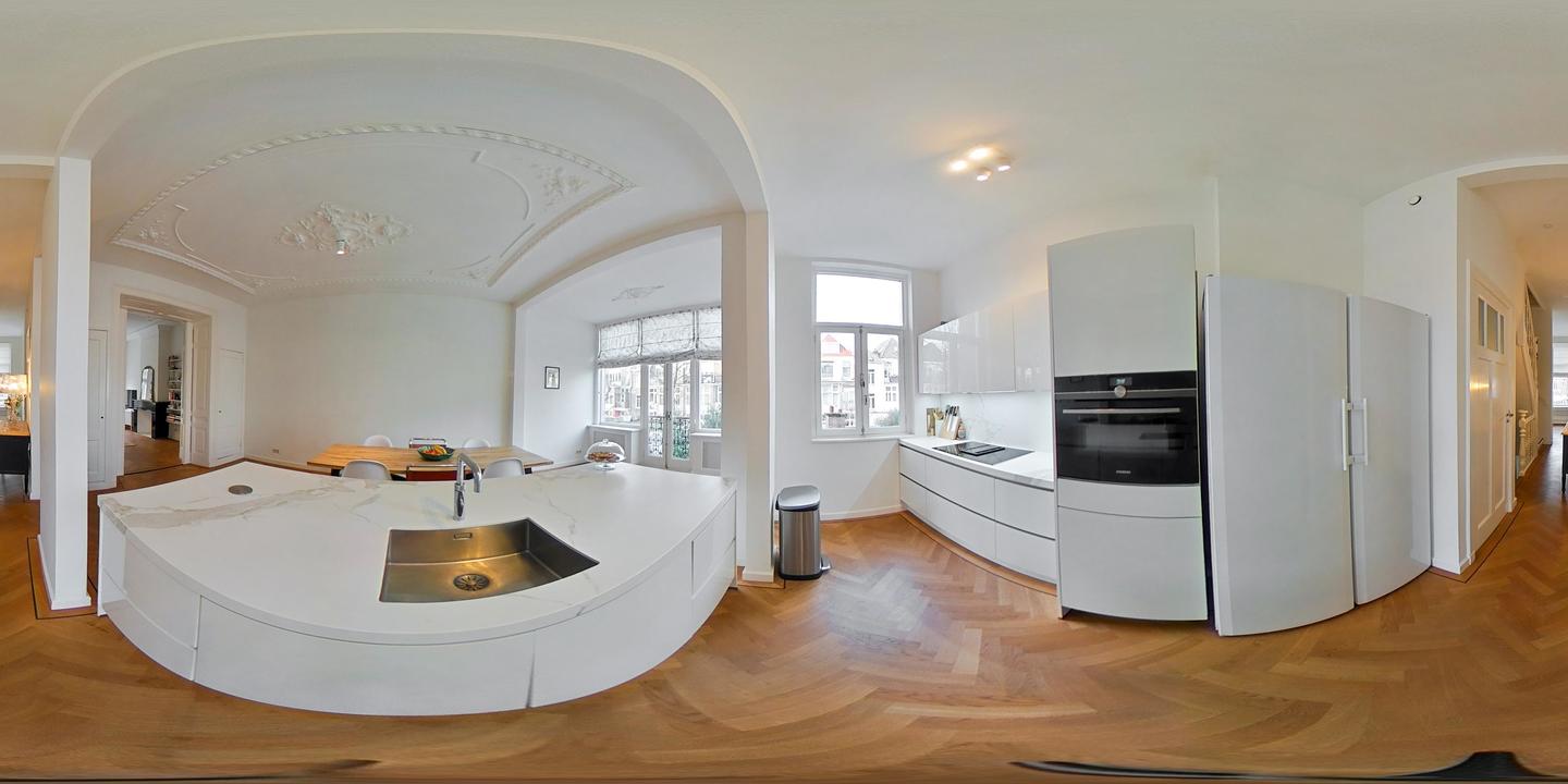 Aan de voorzijde bevindt zich de woonkamer met grote, hoge raampartijen die zorgen voor een overvloed aan daglicht. De bekende voorzijkamer is deels open uitgevoerd, wat bijdraagt aan een extra lichte en ruimtelijke woonkamer. Via de suiteseparatie met vaste kasten en schuifdeuren is de eetkamer aan de achterzijde bereikbaar, waar zich de luxe open keuken bevindt. De keuken is uitgevoerd met een royaal spoel- en kookeiland voorzien van een marmerlook werkblad en hoogwaardige Siemens inbouwapparatuur: inductiekookplaat met geďntegreerde afzuiging, vaatwasser, koelkast, vriezer, inbouwoven en inbouw koffiezetapparaat. Aan de achterzijde geven openslaande deuren toegang tot een Frans balkon. Vanuit de gang is een separaat zwevend toilet bereikbaar.