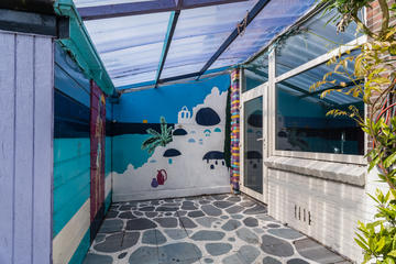 Aan de achterzijde bevindt zich de keuken met een eenvoudig keukenblok in L-opstelling, uitgerust met een koelkast, vriezer, 4-pits gaskookplaat, afzuigkap en oven, alsmede de opstelplaats voor de wasmachine. Vanuit de keuken is er toegang tot de zonnige achtertuin gelegen op het zuidoosten, waar van ’s ochtends tot in de vroege avond (ca. 07:00 – 19:00 uur) van de zon kan worden genoten, met houten berging.