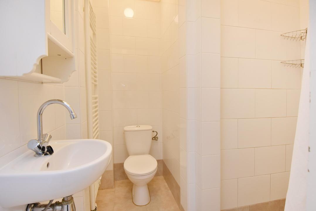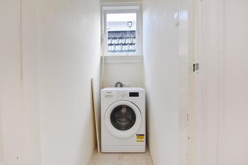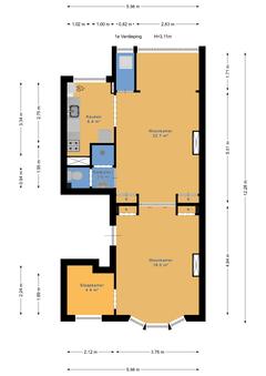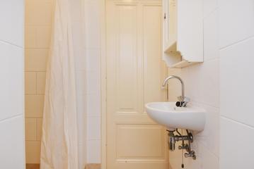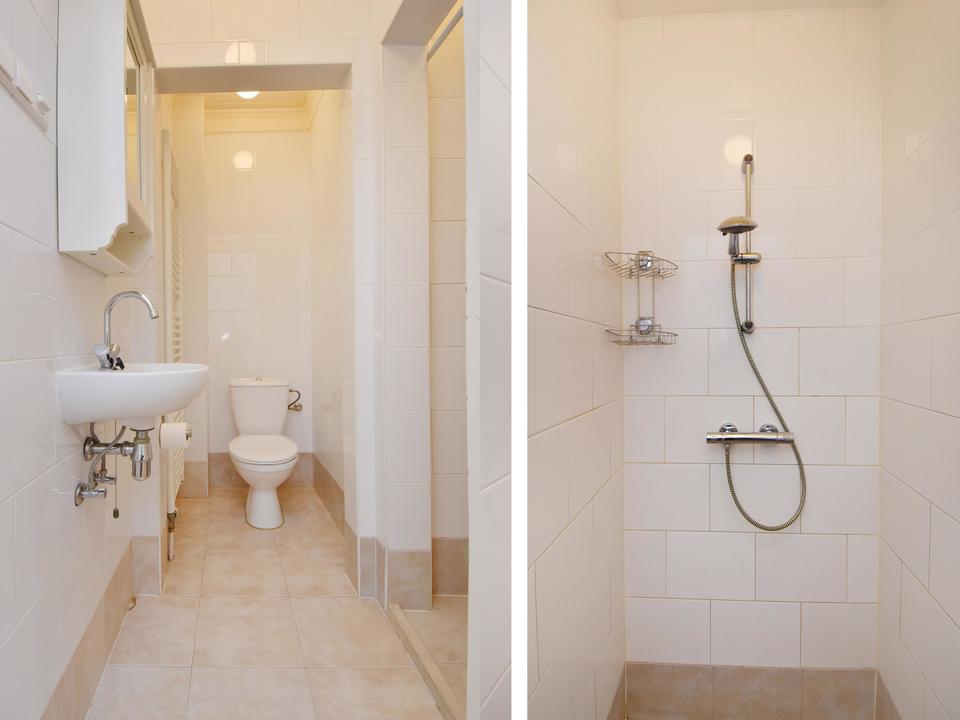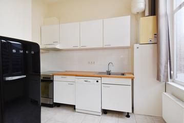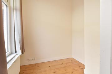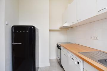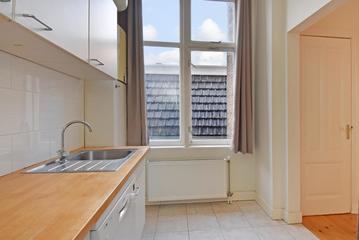 De ruime achterkamer is eveneens voorzien van een schouw en een vaste kast met bergruimte en wasmachineaansluiting. Deze kamer biedt voldoende ruimte voor een comfortabele zit- en eetopstelling. De half open keuken is uitgerust met een keukenblok, losse vaatwasser, fornuis met vier gaspitten en oven, afzuigkap en een losse Smeg koelkast. Tevens bevindt zich hier de opstelplaats van de cv-combiketel. Vanuit de achterkamer is tevens de badkamer bereikbaar. Deze is voorzien van een toilet, douche, wastafel, designradiator en mechanische ventilatie.