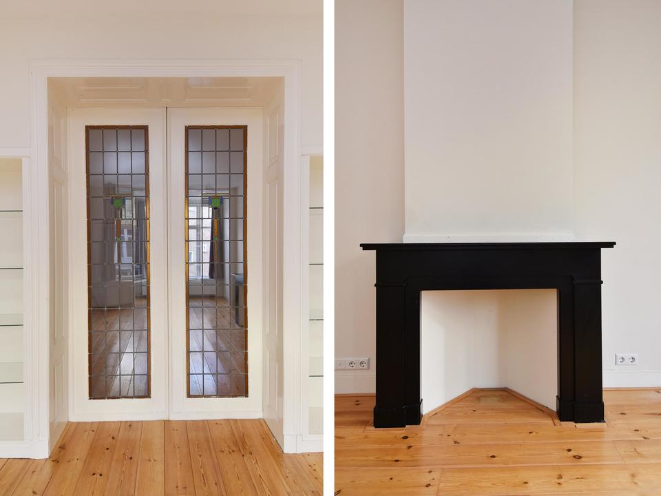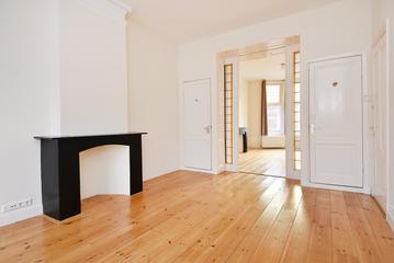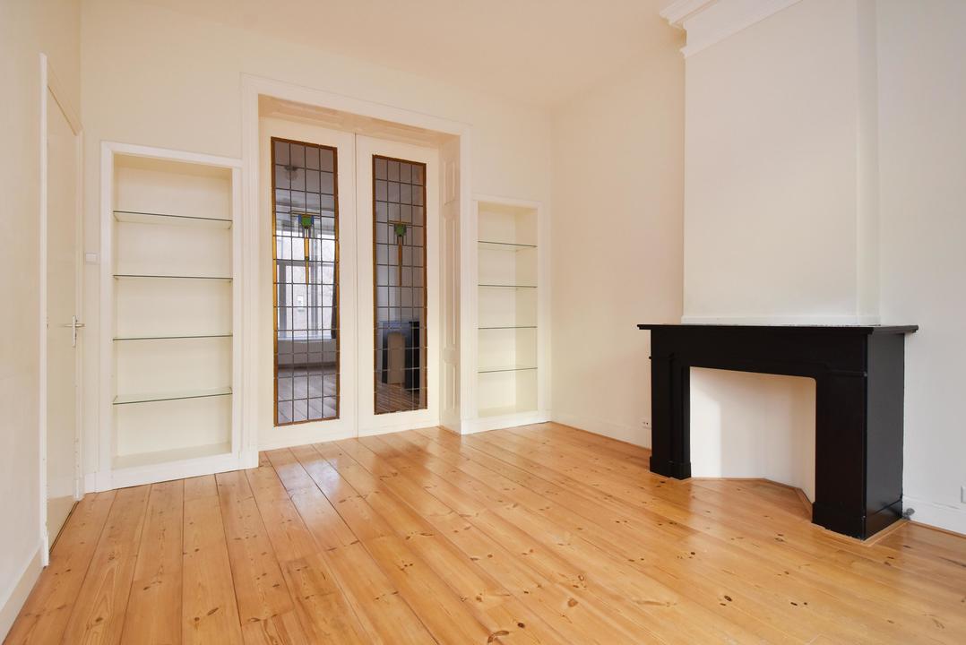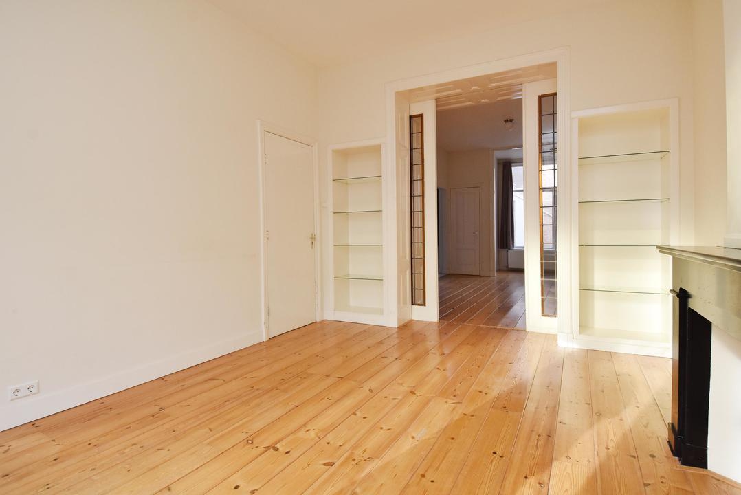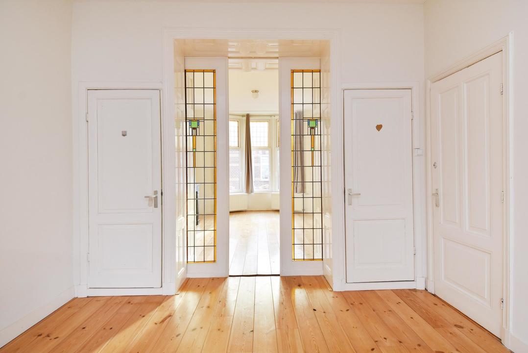 De woning beschikt over een woonkamer en suite met originele schuifseparatie voorzien van schuifdeuren met glas-in-lood en vier vaste kasten, wat zorgt voor zowel sfeer als praktische bergruimte. De voorkamer aan de voorzijde is licht dankzij de erker en de grote raampartijen (met glas in lood bovenlichten) en beschikt over een karakteristieke schouw. Vanuit deze ruimte is de zij(slaap)kamer aan de voorzijde bereikbaar.