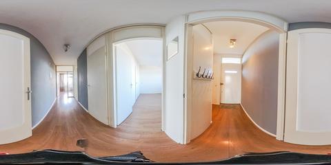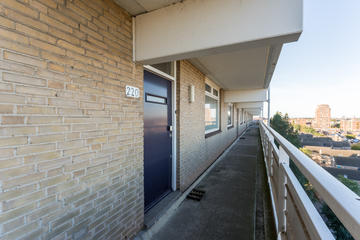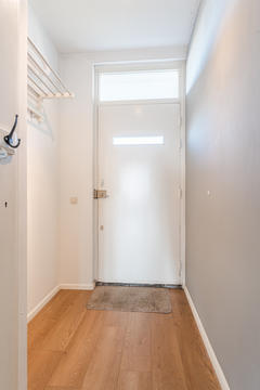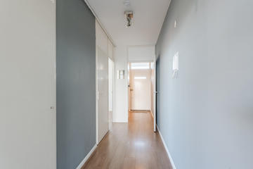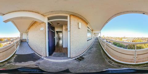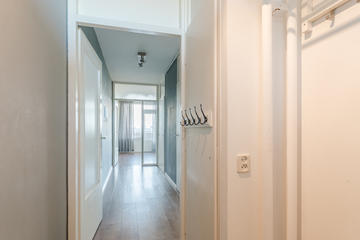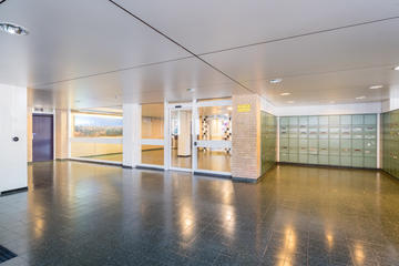 Centrale entree met bellen- en brievenbussentableau en toegang tot de afgesloten hal met trap en lift naar de 9e verdieping. Vanaf de galerij toegang tot het appartement. Tochtportaal met meterkast en toegang tot de hal.