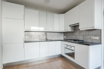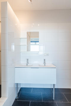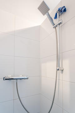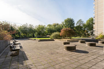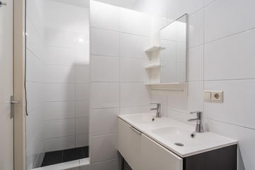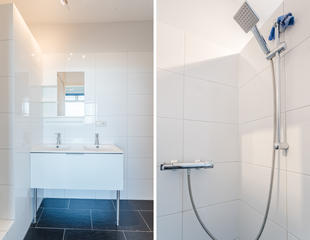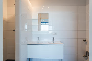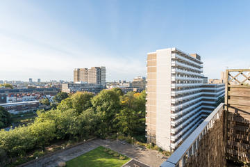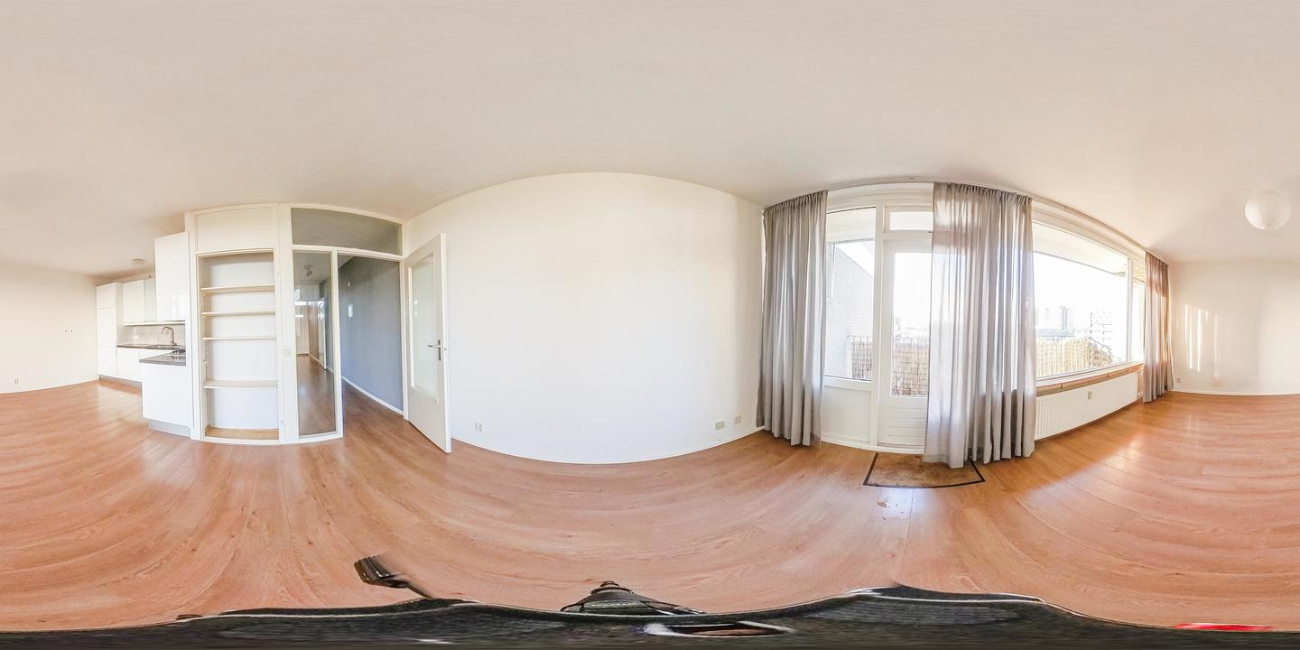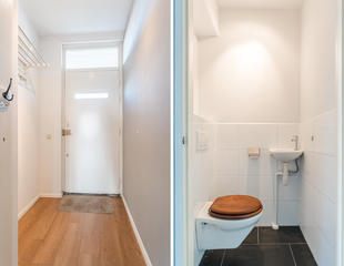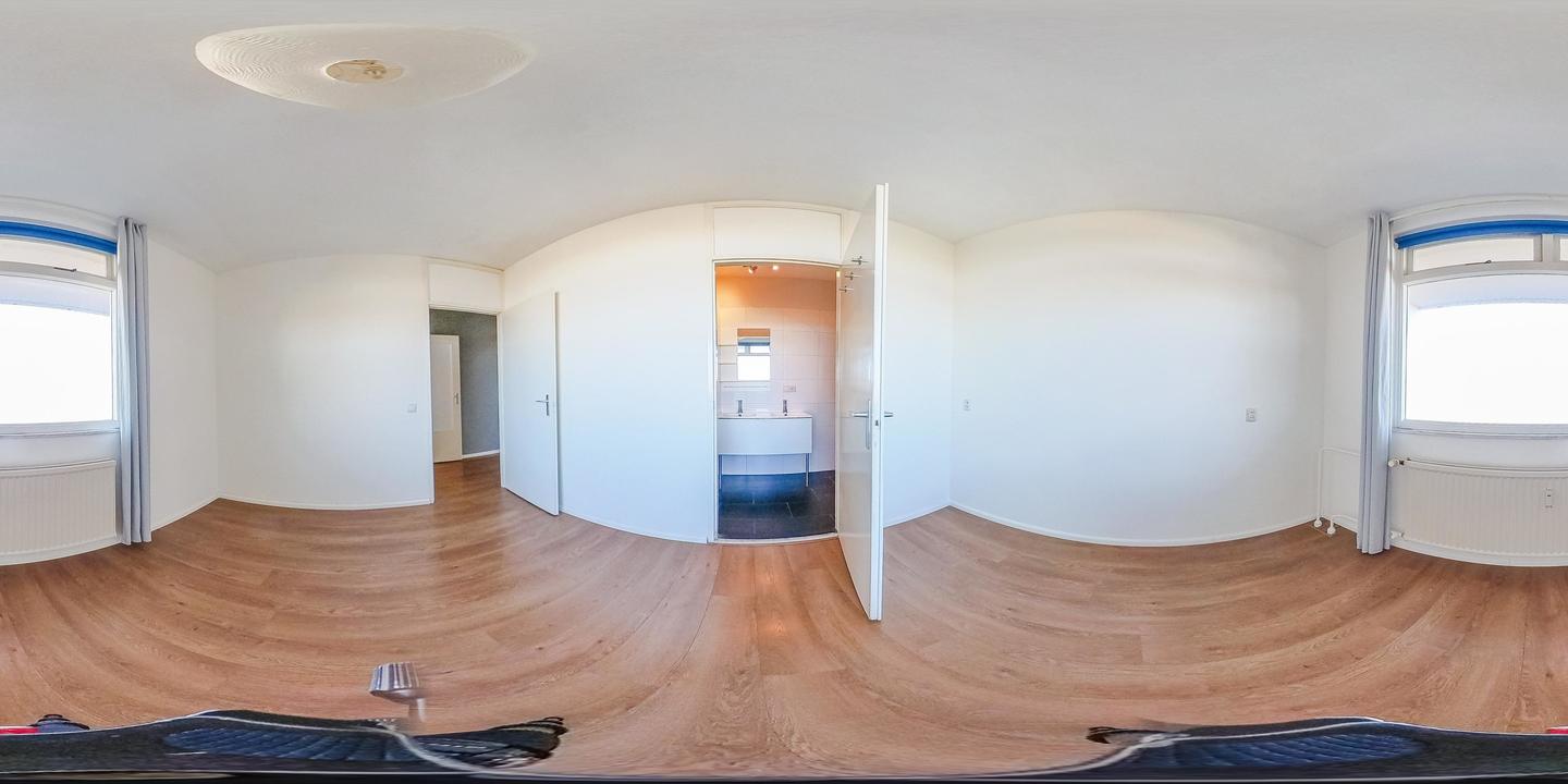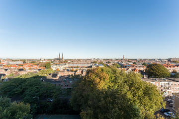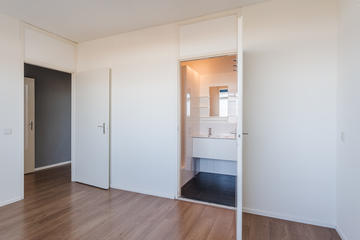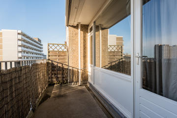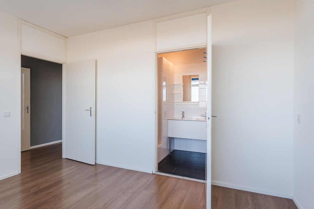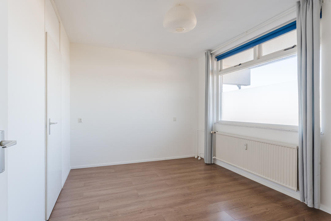 Aan de galerijzijde ligt de slaapkamer met prachtig uitzicht richting Scheveningen en directe toegang tot de moderne badkamer met douche, wastafelmeubel en wasmachineaansluiting. Verder in de hal een separaat toilet met fontein en een handige bergkast.