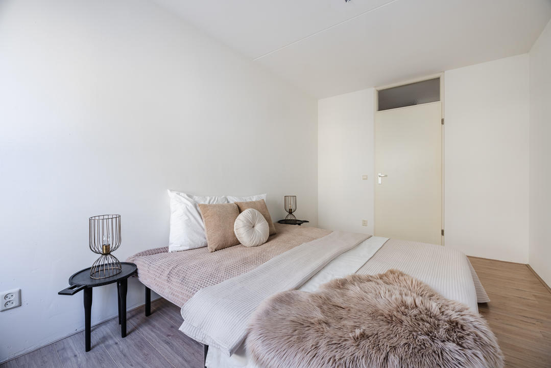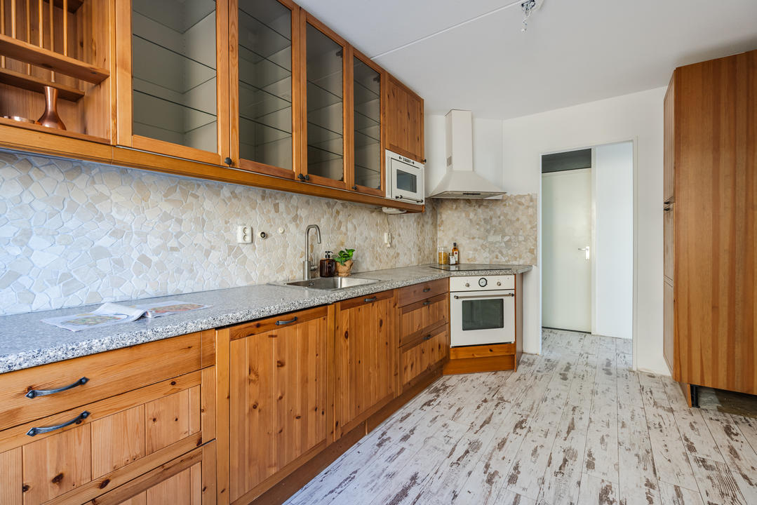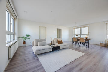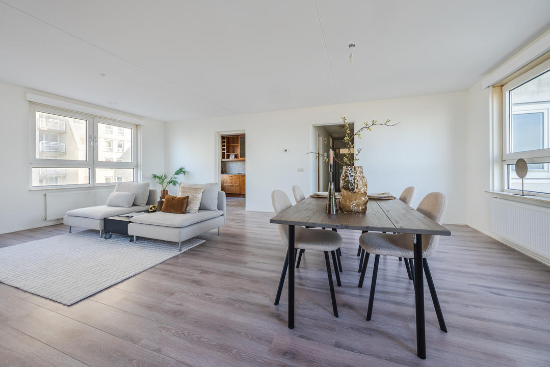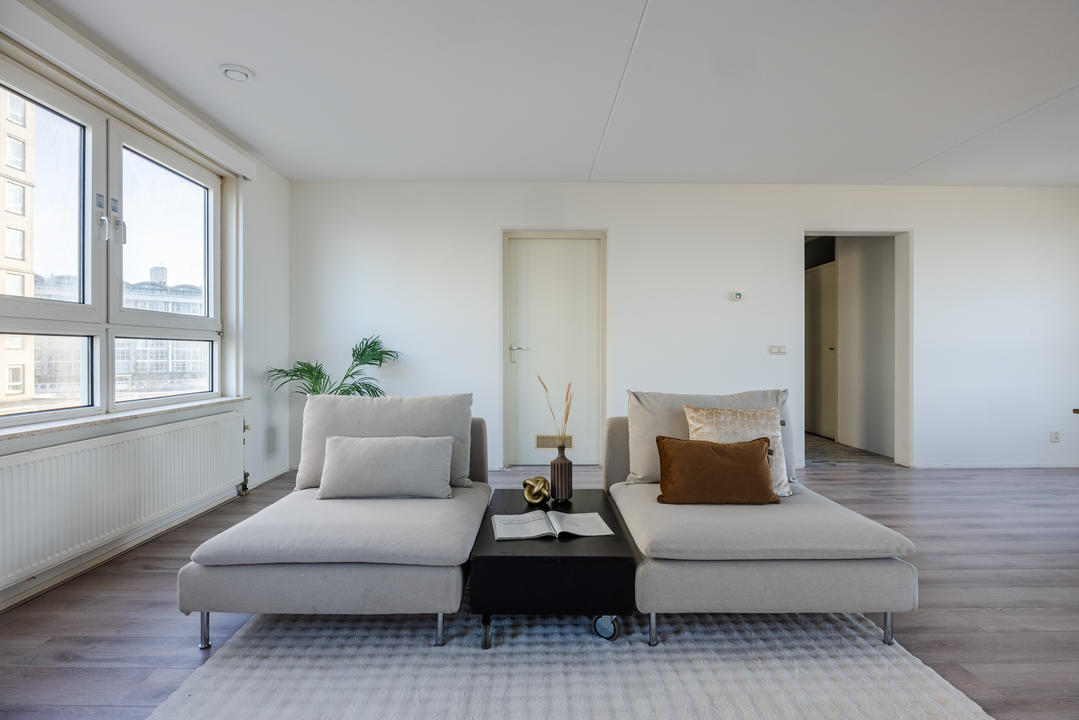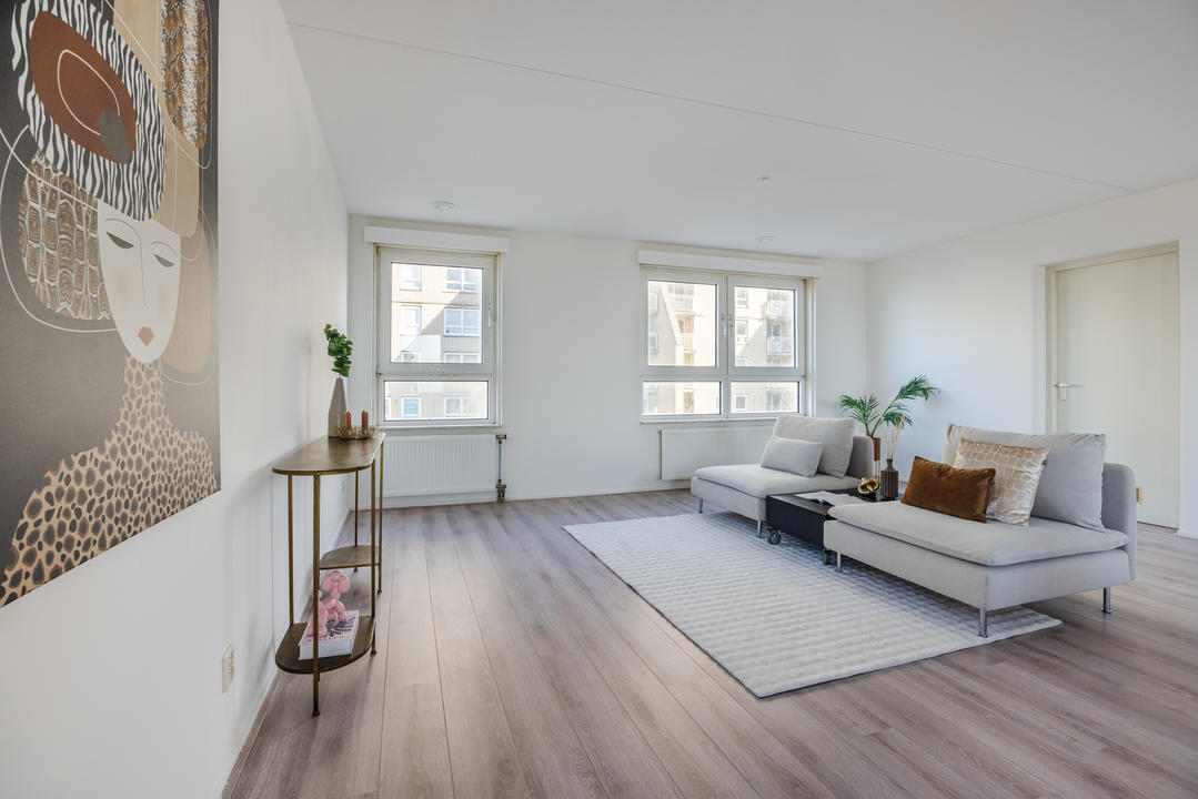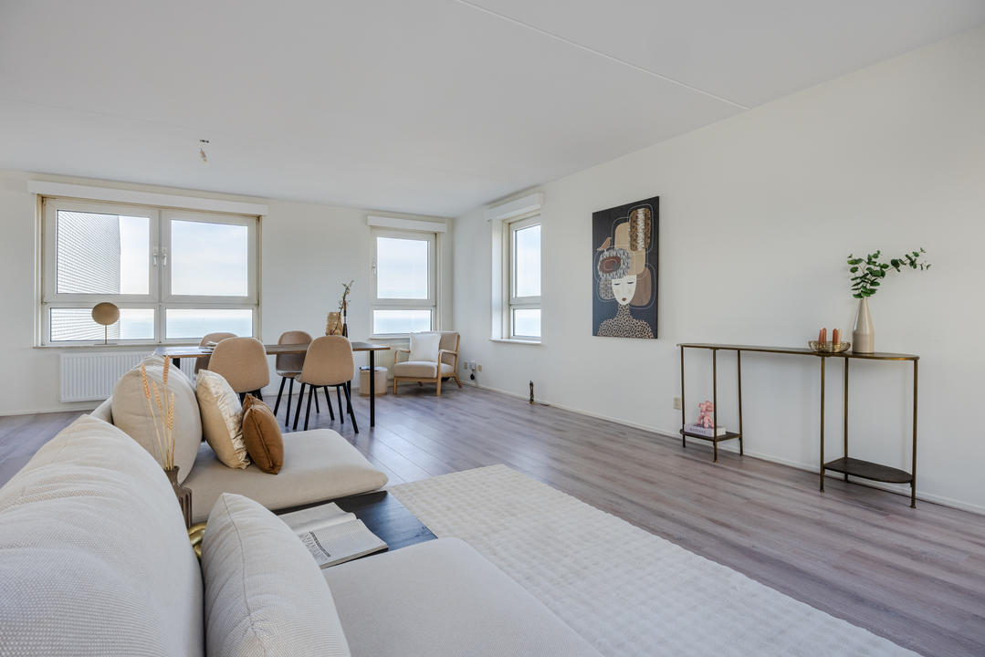 Via de afgesloten, centrale entree met video-intercom bereik je de tweede verdieping per lift of trap. Vanuit de corridor kom je bij de entree van het appartement, waar een ruime T-vormige hal toegang biedt tot alle vertrekken. De royale woonkamer met grote raampartijen laat je eindeloos genieten van het panoramische uitzicht. De aangrenzende keuken is bereikbaar vanuit zowel de hal als de woonkamer en voorzien van een net keukenblok met houten fronten en diverse inbouwapparatuur, waaronder een oven, 4-pits inductiekookplaat, afzuigkap, magnetron en vaatwasser. In de hal bevinden zich een praktische berging met wasmachineaansluiting en een aparte kast met opstelplaats voor de CV-ketel (2008), boiler en mechanische ventilatie. Het appartement beschikt over drie slaapkamers. De ruime hoofdslaapkamer is rustig gelegen. Slaapkamer twee is ideaal als logeerkamer of werkkamer. De derde slaapkamer biedt toegang tot het balkon met ochtendzon – de perfecte plek voor een kop koffie in de ochtend. De badkamer is uitgerust met een hoekbad/jacuzzi, dubbele wastafel in meubel, royale inloopdouche met regendouche en extra jets, vloerverwarming en mechanische ventilatie. Het separate toilet is voorzien van een modern vrijhangend closet en fonteintje.