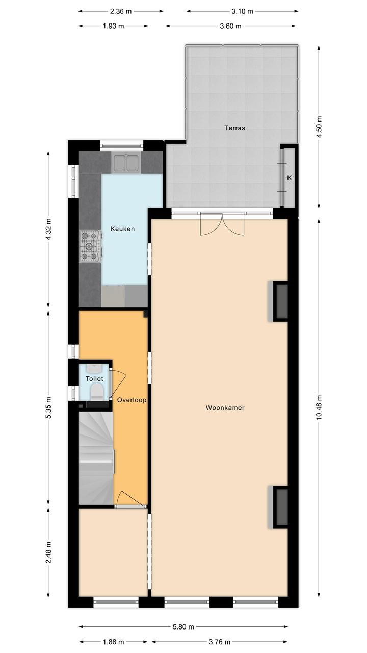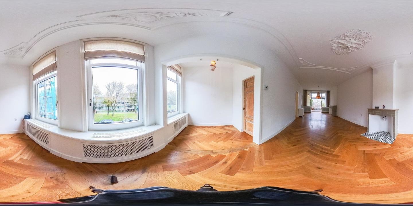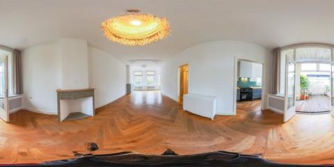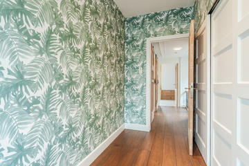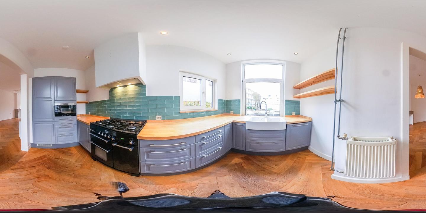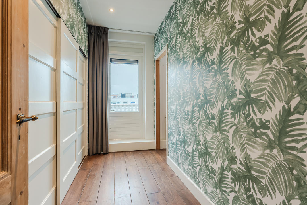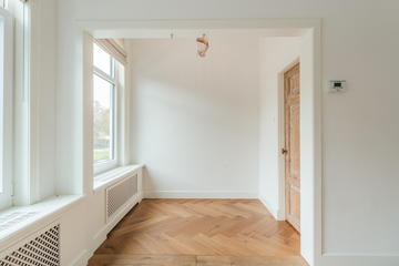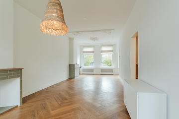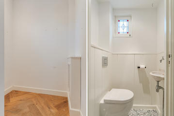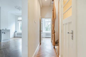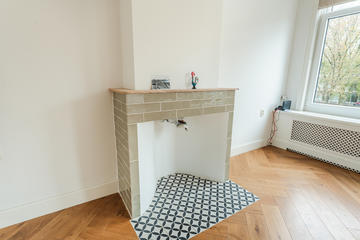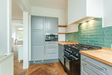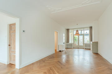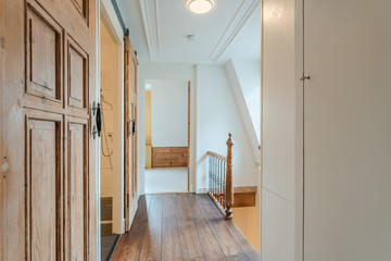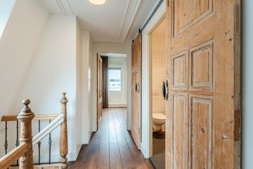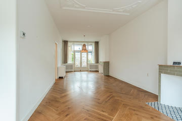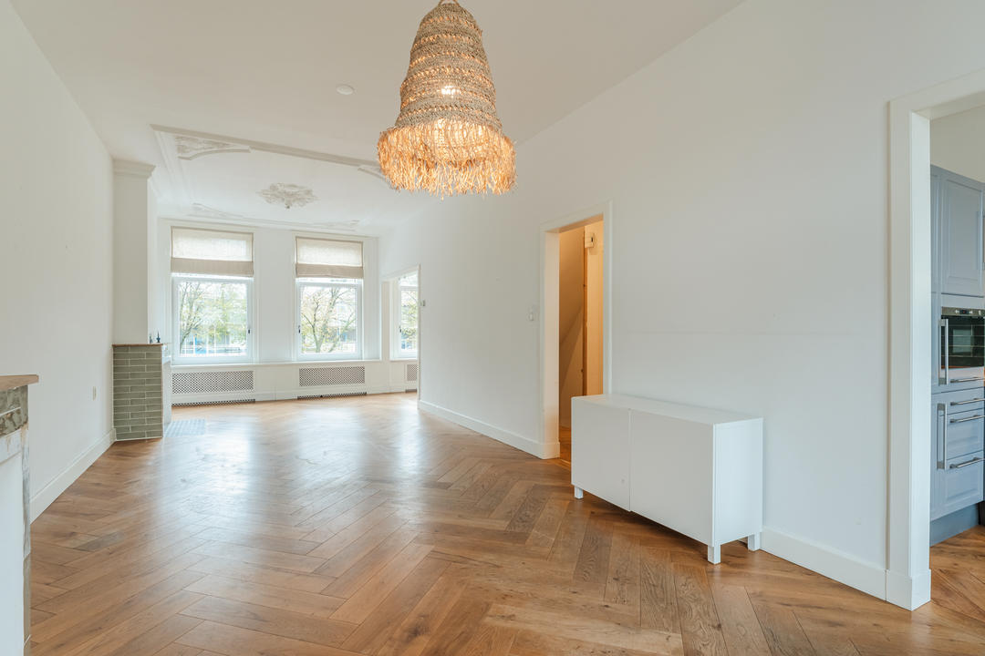 Ruime overloop met garderobe nis en modern toilet. De sfeervolle woon-/eetkamer is een heerlijke ruimte met visgraat eiken parketvloer, ornamentenplafond, twee originele schouwen en een bijgetrokken voorzijkamer die zorgt voor extra lichtinval en een gevoel van ruimte. Via de openslaande deuren stap je zo het zonnige en beschutte terras op het zuidwesten op – een ideale plek om van de middag- en avondzon te genieten. De moderne, halfopen keuken sluit naadloos aan op de eetkamer en is voorzien van diverse inbouwapparatuur, waaronder een 5-pits fornuis met twee ovens, grill en bakplaat, afzuigkap, koel-/vriescombinatie, magnetron en vaatwasser.
