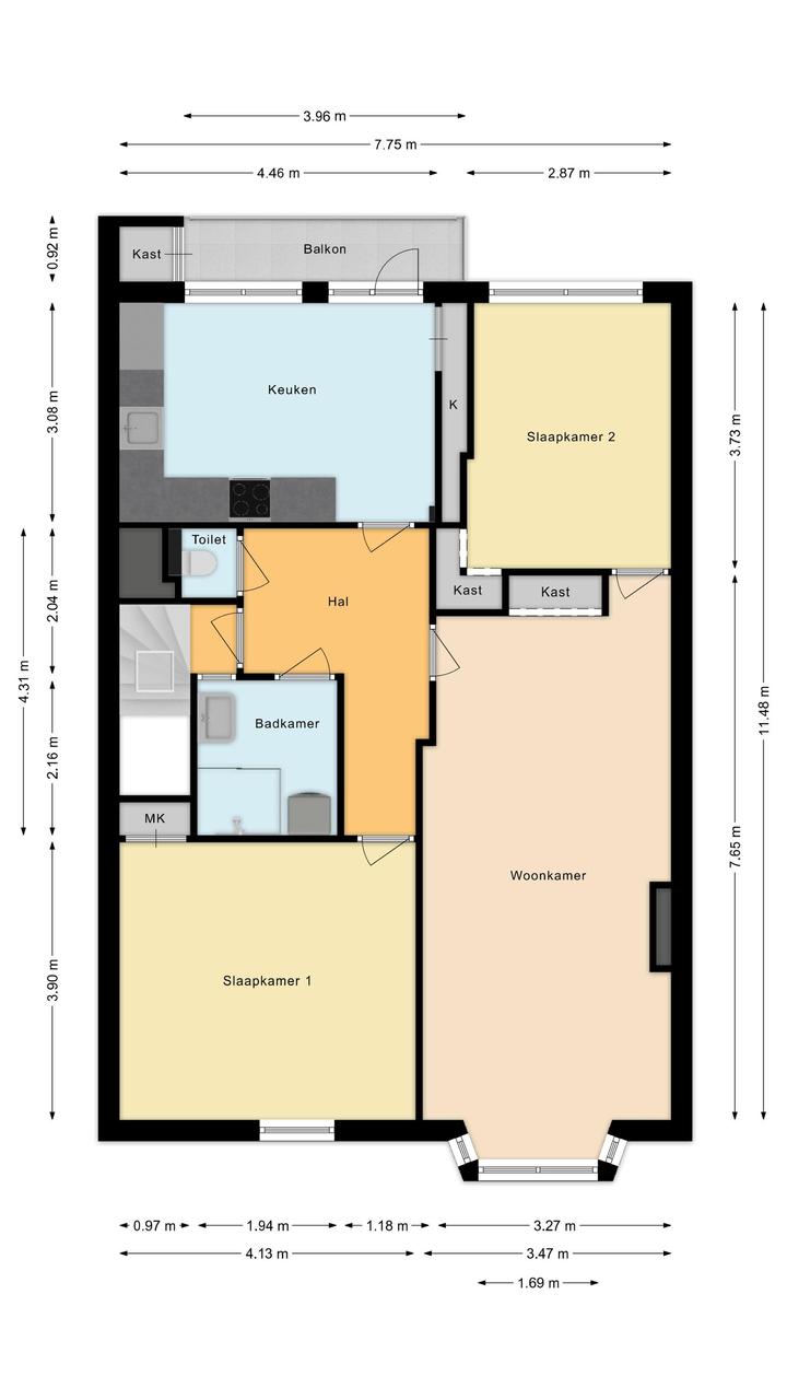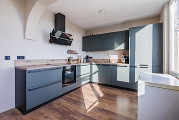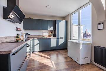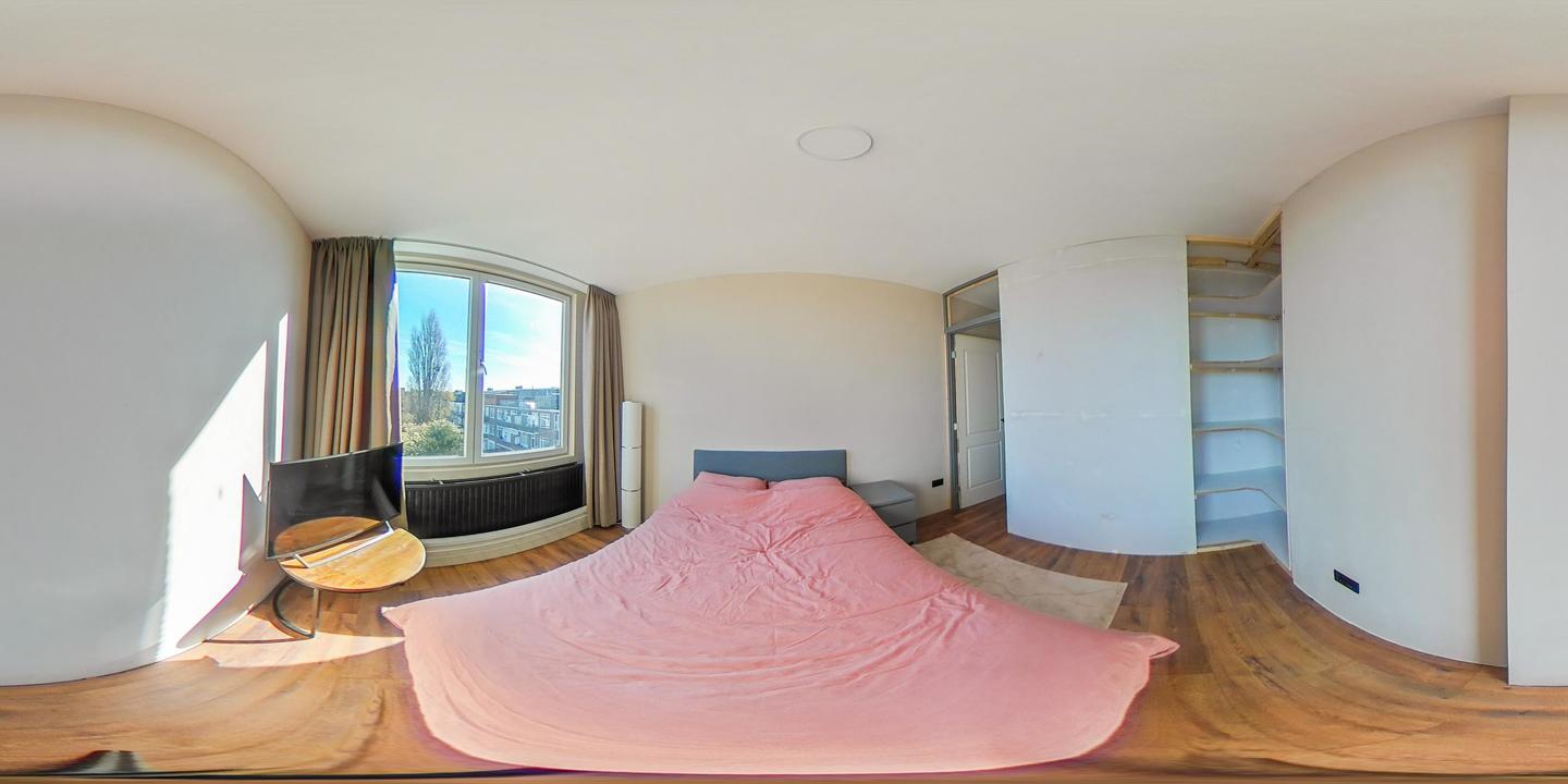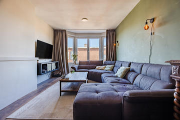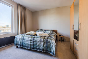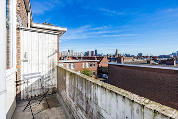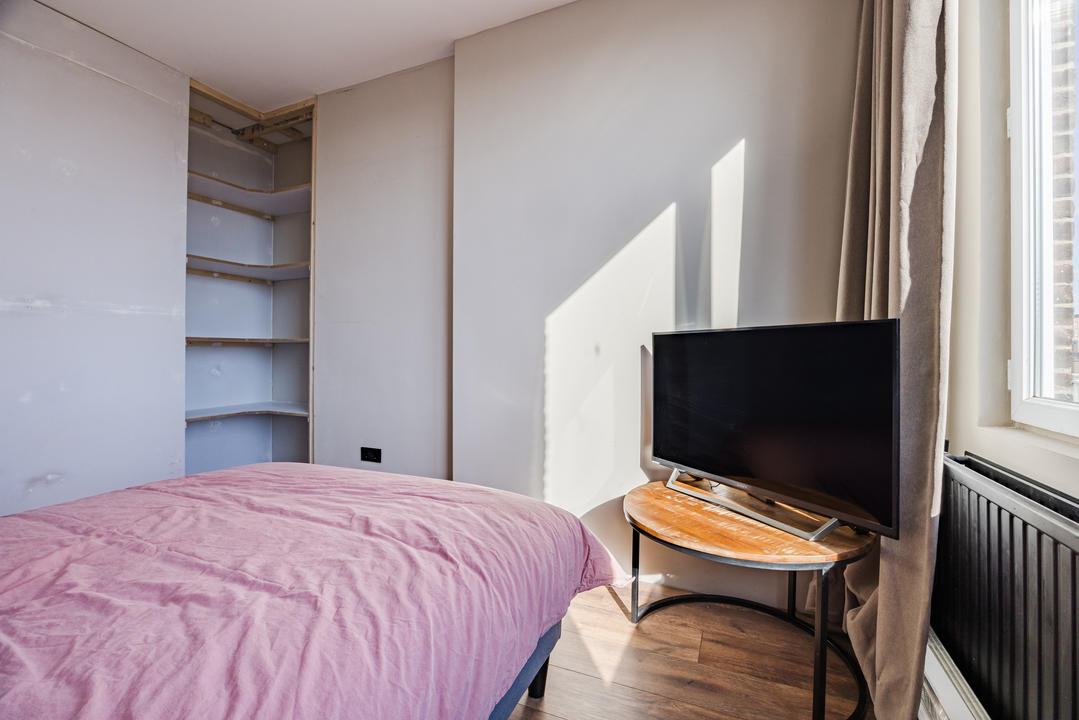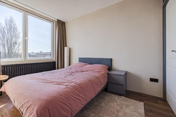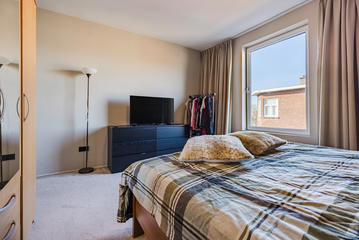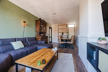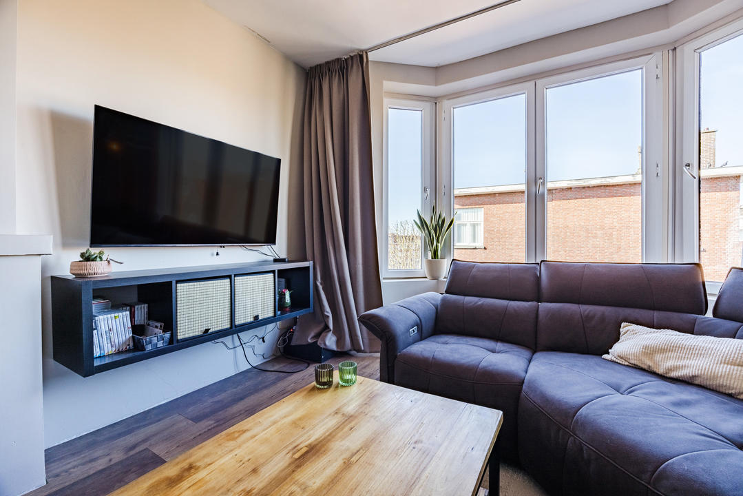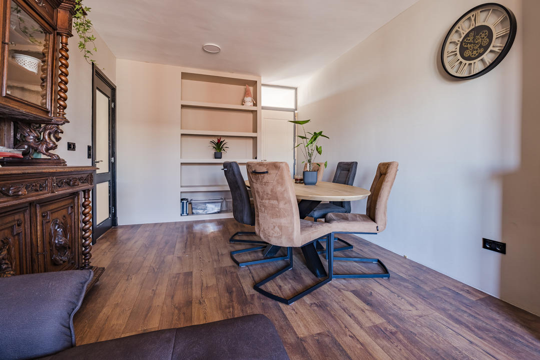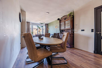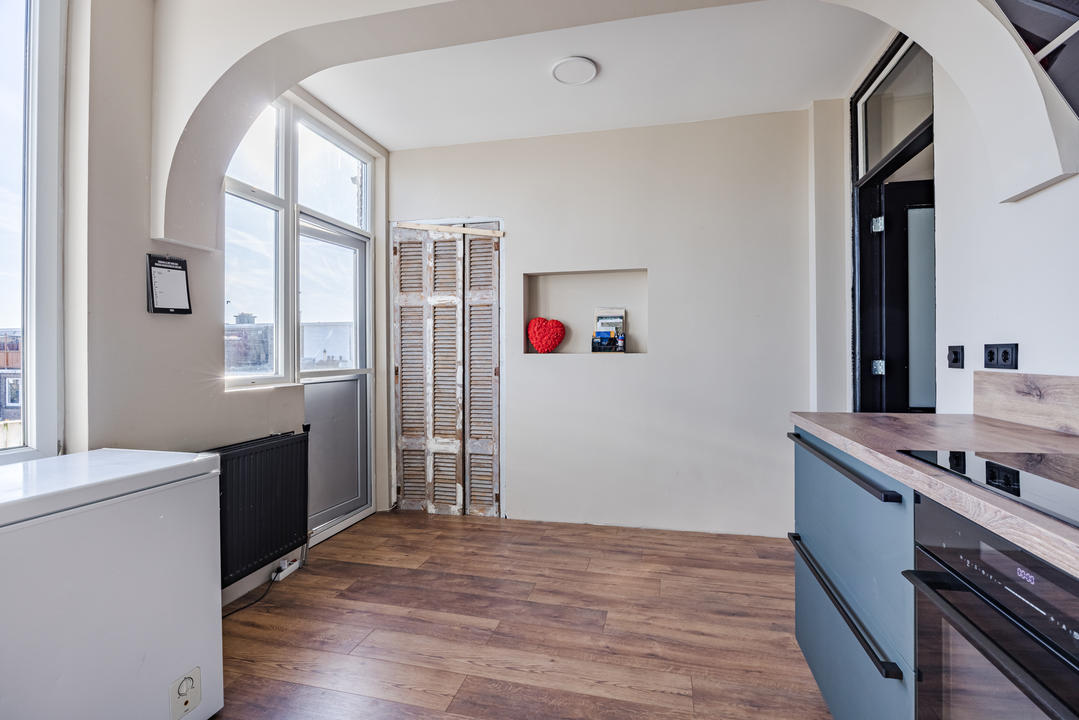 Sfeervolle woonkamer met erker en toegang tot de eerste slaapkamer, gelegen aan de achterzijde. De ruime woonkeuken is ontstaan door het samenvoegen van de voormalige keuken en zijkamer en vormt een heerlijke leefruimte. De keuken beschikt over een modern keukenblok in L-opstelling met inbouwapparatuur, waaronder een 5-pits inductiekookplaat, afzuigkap, combi oven/magnetron, vaatwasser, koelkast en vriezer. Tevens bevindt zich hier een kast met de opstelplaats van de c.v.-combiketel. Vanuit de keuken is er toegang tot het balkon, gelegen op het oosten en voorzien van een balkonkast.
