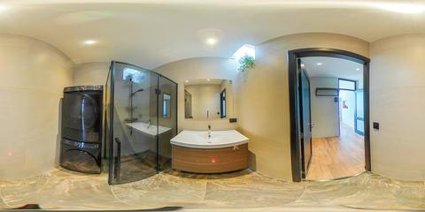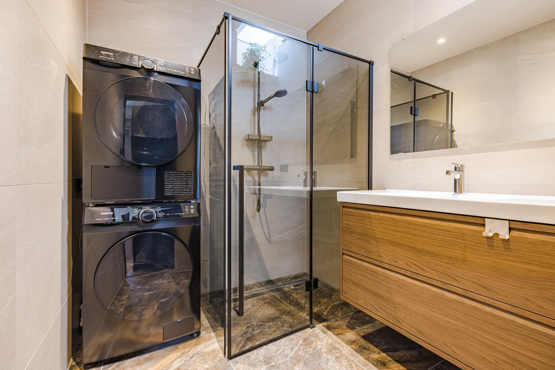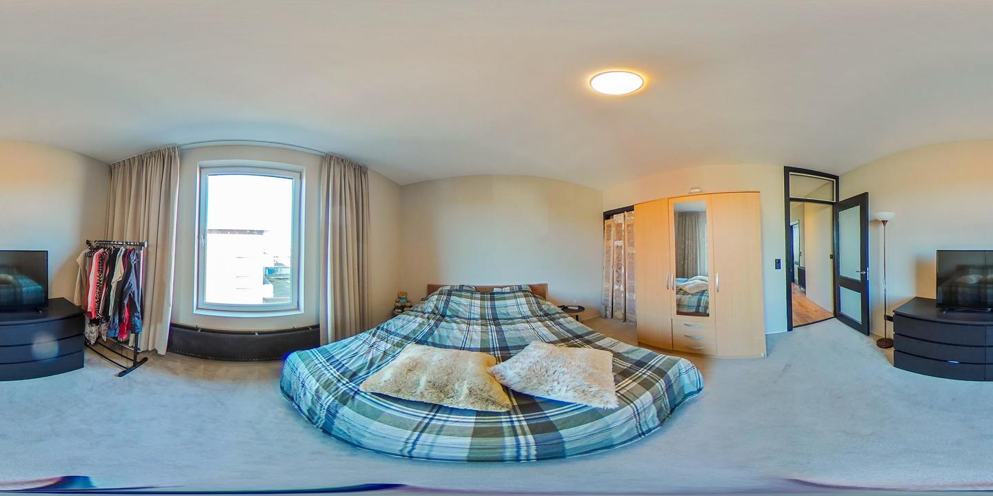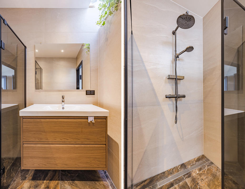 De badkamer is modern uitgevoerd en voorzien van een inloopdouche met regen- en handdouche, glazen douchescherm, wastafelmeubel en aansluitingen voor wasmachine en droger. Aan de voorzijde bevindt zich de tweede slaapkamer met vaste kast.