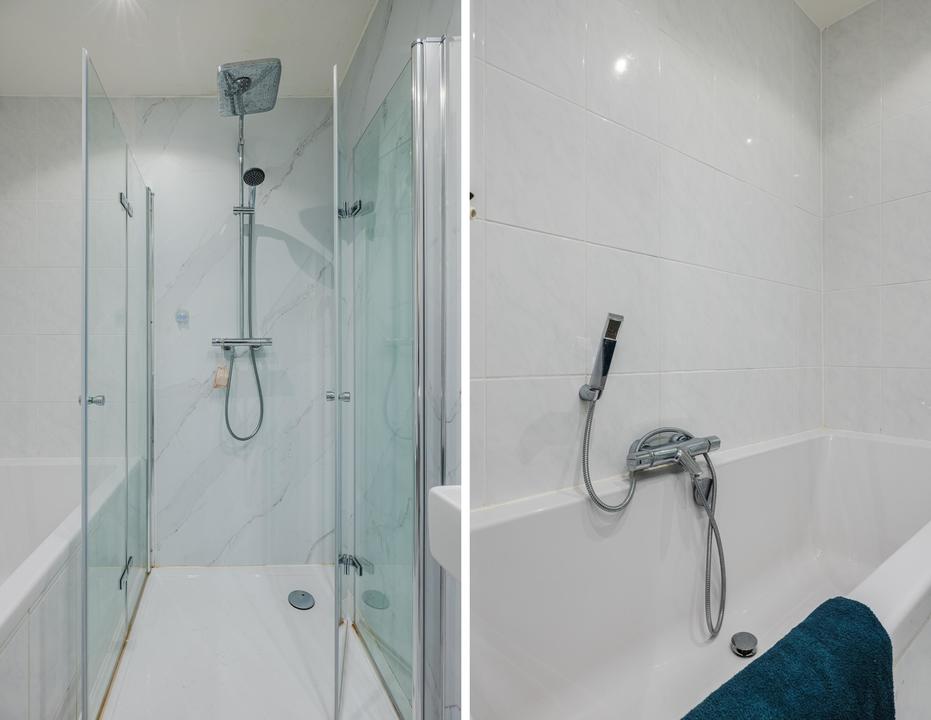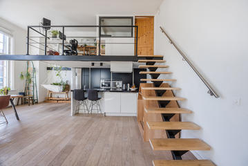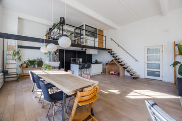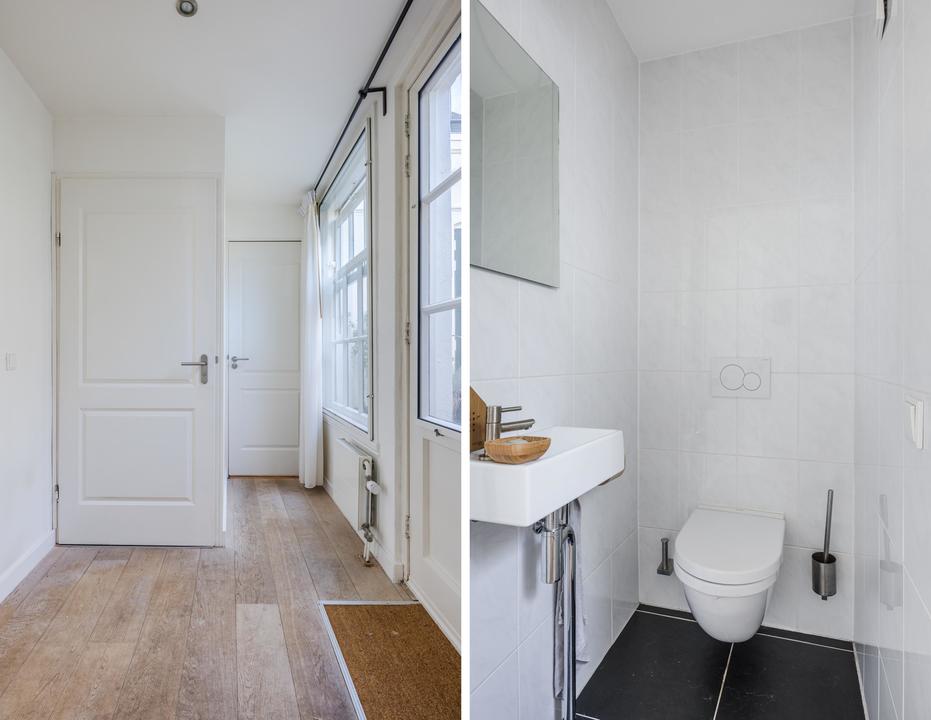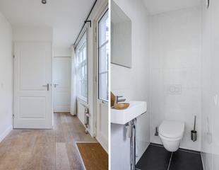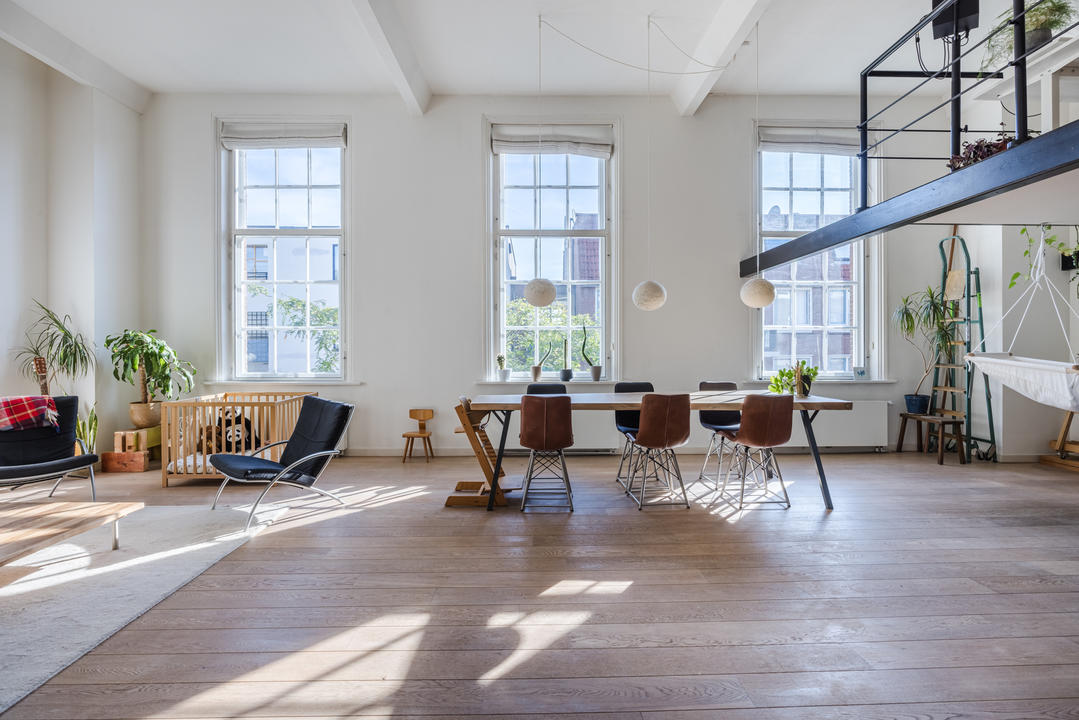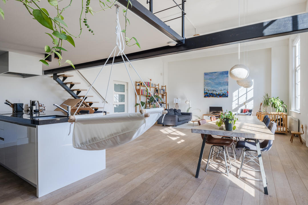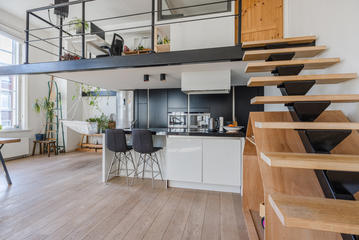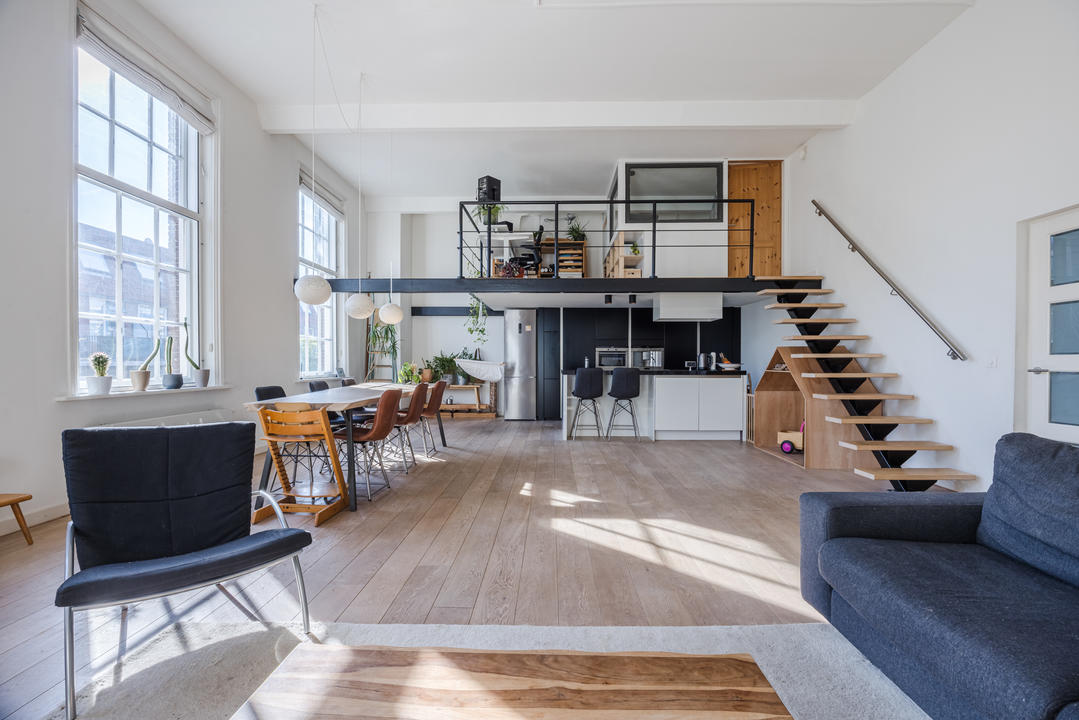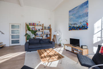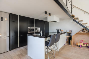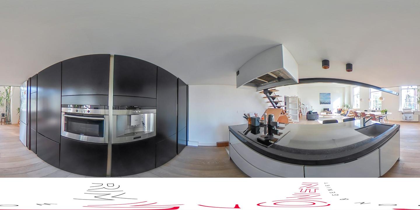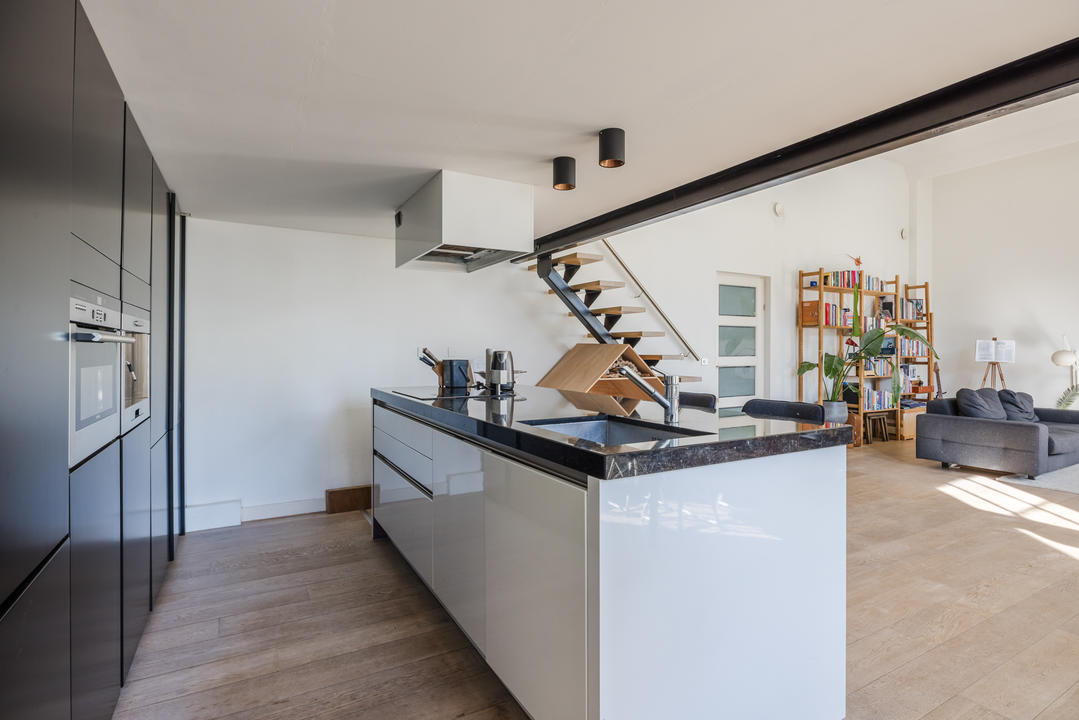 Je komt binnen in een lichte hal met toegang tot de indrukwekkende woonkamer, waar het plafond van maar liefst vier meter hoogte en de grote raampartijen zorgen voor een statige uitstraling en overvloedige lichtinval. De moderne open keuken met kookeiland is uitgerust met diverse inbouwapparatuur, waaronder een oven/magnetron, koffieapparaat, 4-pits inductieplaat en vaatwasser.