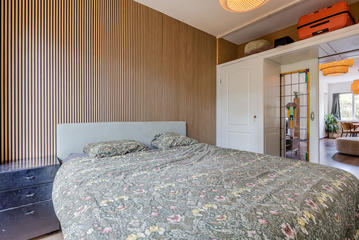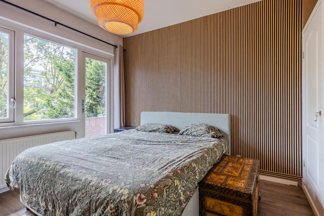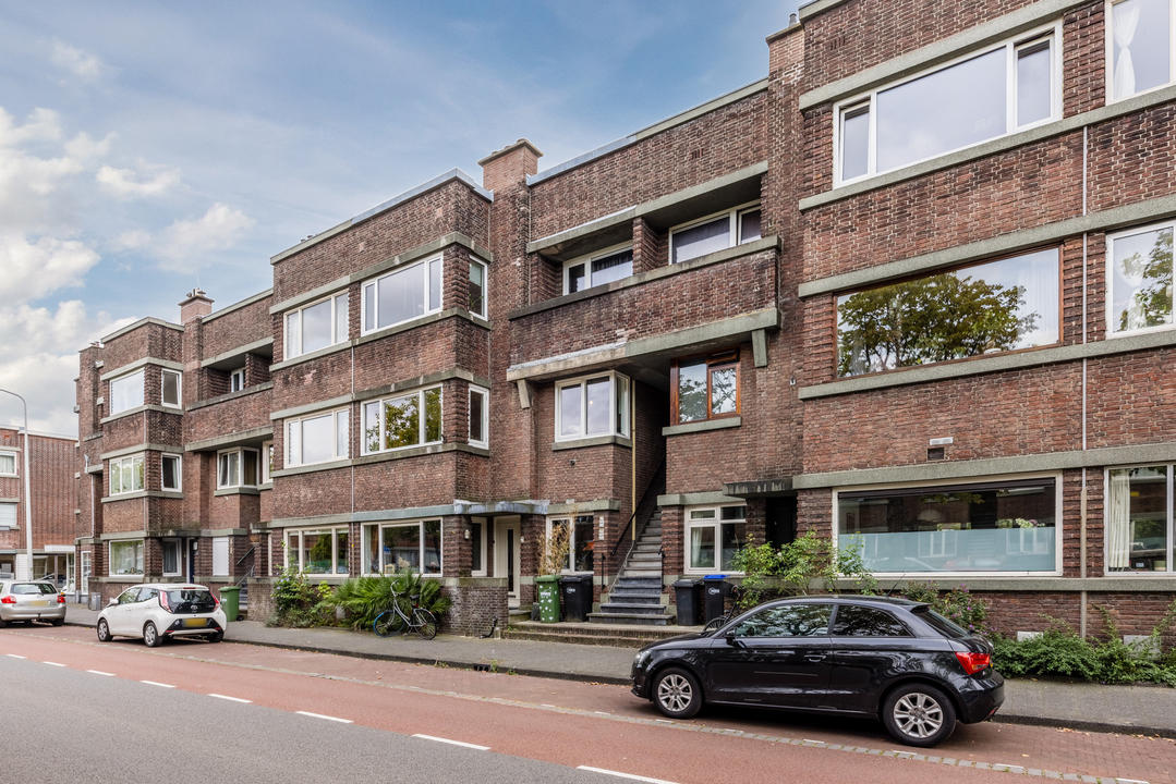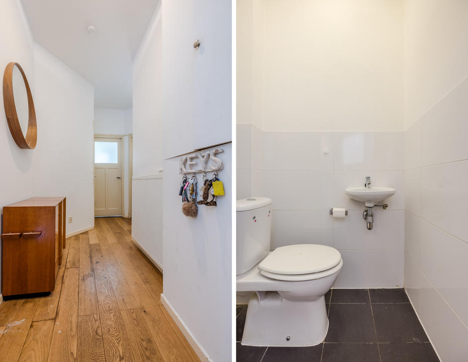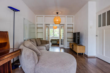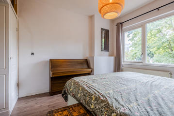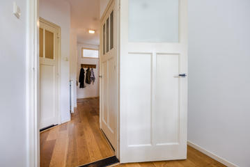 Entree naar de L-vormige hal met bergruimte boven de entree, meterkast en toilet met fontein. De woonkamer en suite beschikt over vaste kasten en schuifdeuren met glas-in-lood. Aan de voorzijde van de kamer en suite is de woonkamer gelegen en heeft een erker en een ruime open keuken aan de voorzijde. De kamer en suite is in 2022 geheel in de bouwstijl van de originele bouwtijd teruggebracht. De keuken in L-opstelling is voorzien van diverse inbouwapparatuur: koelkast, vriezer, groot fornuis met vijf gaspitten en wokbrander, grote oven, afzuigkap, vaatwasser, magnetron en een vaste kast. De achterkamer is momenteel in gebruik als slaapkamer en biedt toegang tot het zonnige balkon op het zuidwesten met balkonkast, waar vrijwel de hele dag zon is. Vanuit de hal is er toegang tot de badkamer met douche, wastafel en aansluiting voor de wasmachine. De tweede slaapkamer is gelegen aan de achterzijde en beschikt over een vaste kast met de opstelplaats van de cv-combiketel en biedt eveneens toegang tot het balkon. De derde slaapkamer is tevens gelegen aan de achterzijde van de woning.