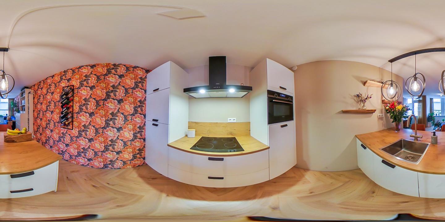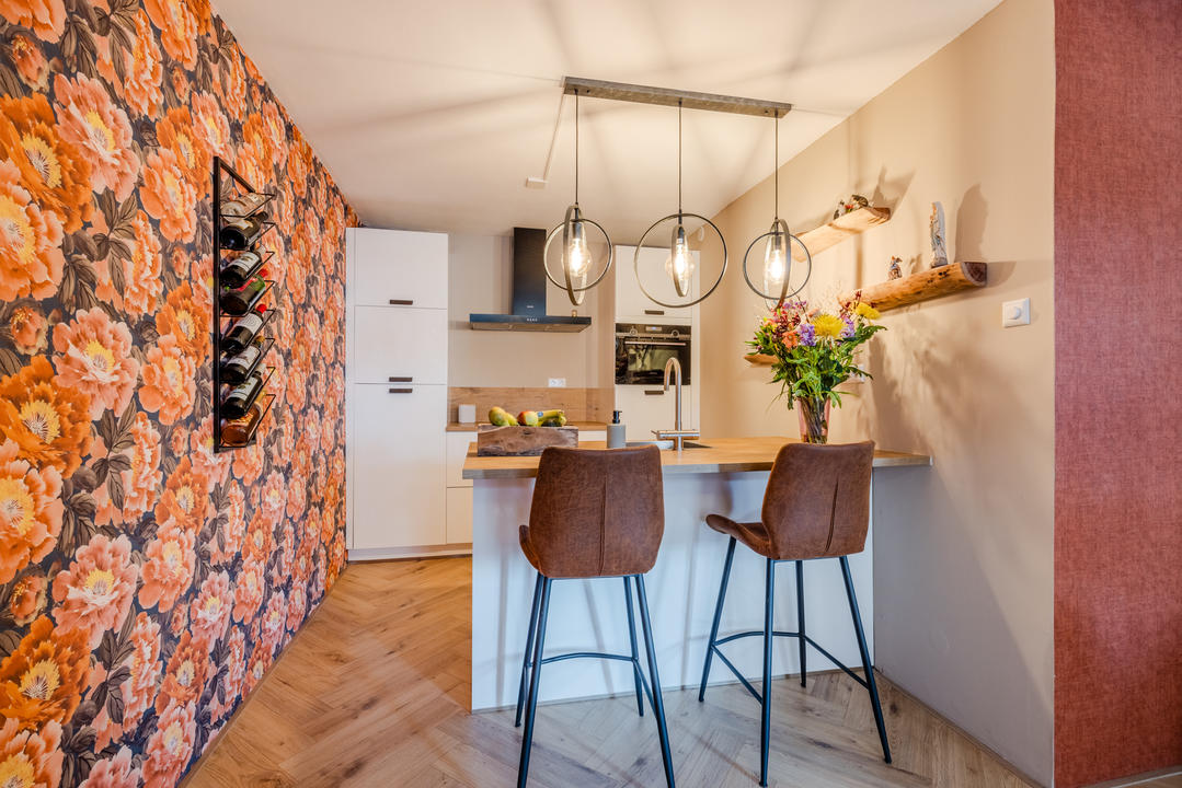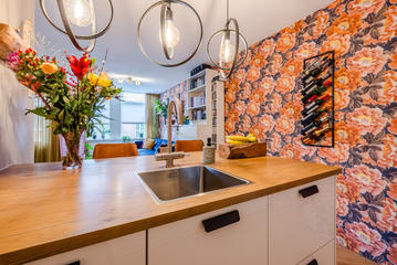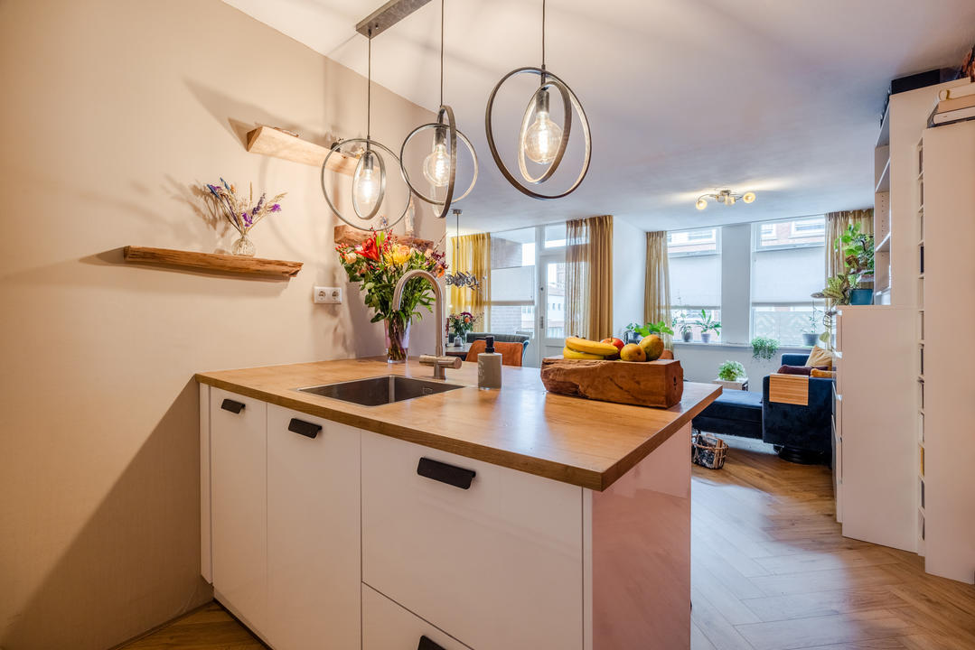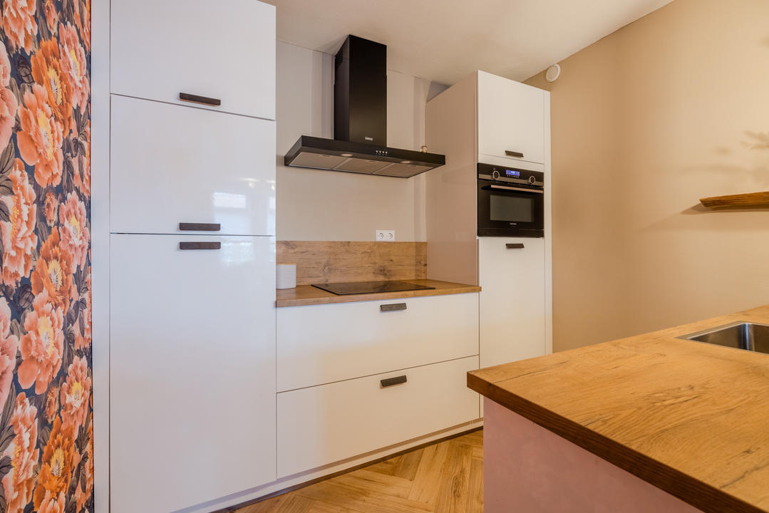 De L-vormige woonkamer is prettig van formaat en biedt toegang tot het balkon. Aansluitend bevindt zich de open keuken, uitgevoerd met een modern keukenblok met eiland met eetbar. De keuken is voorzien van inbouwapparatuur, waaronder een koelkast met vriesvak, 4-pits inductiekookplaat, afzuigkap, stoom-, combioven/magnetron en vaatwasser. Vanuit de woonkamer is er toegang tot het balkon.