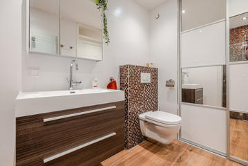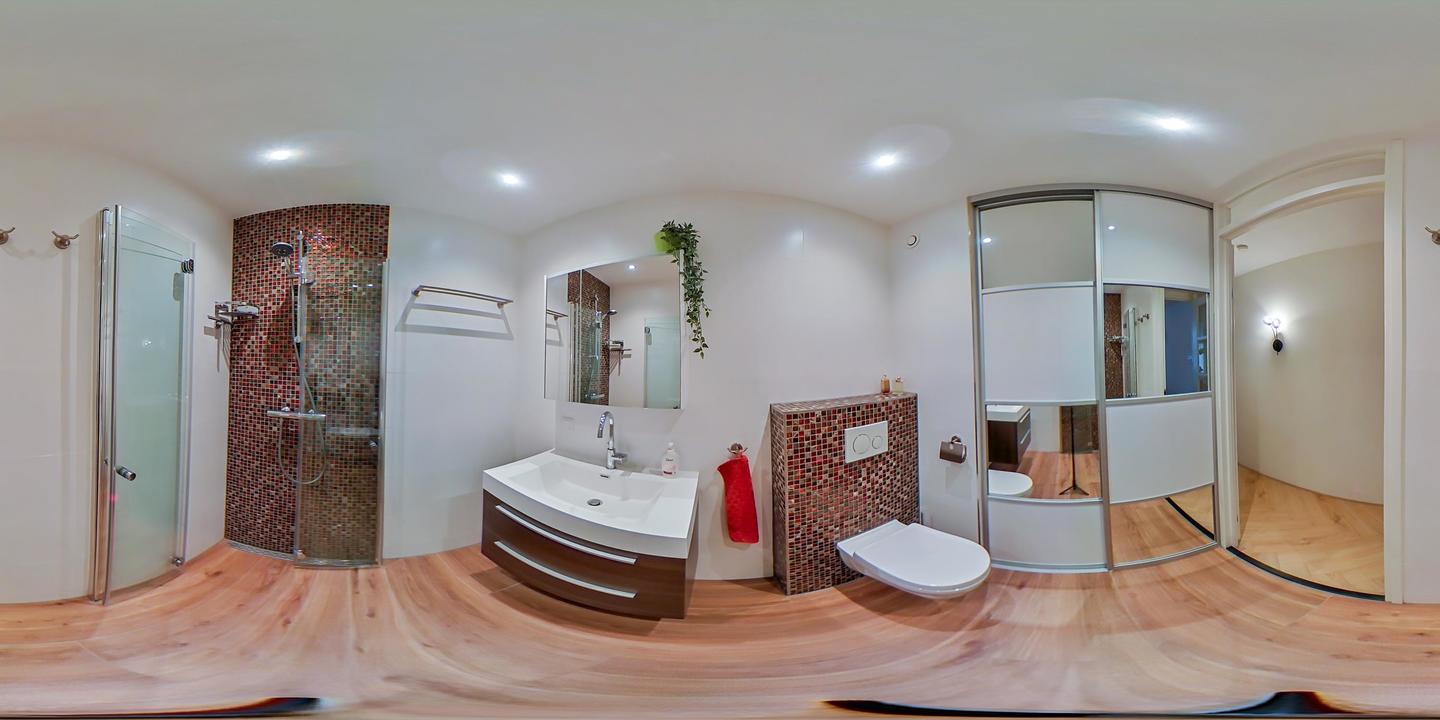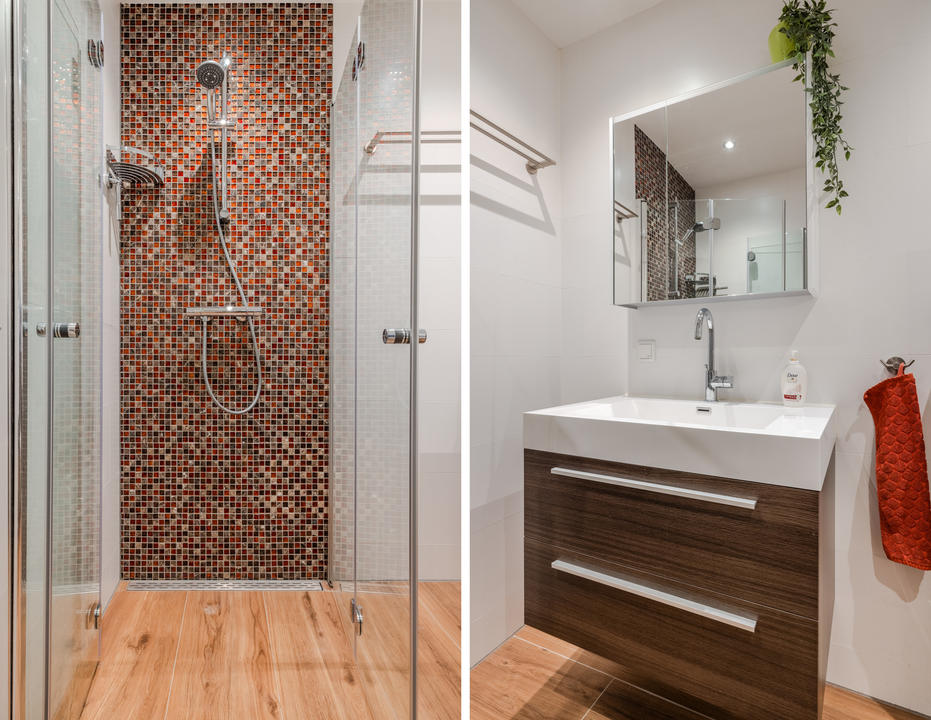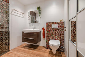 Entree van het appartement in de hal met meterkast. Vanuit hier is er toegang tot de slaapkamer en de moderne badkamer, welke is uitgevoerd met een inloopdouche voorzien van glazen douchescherm, een wastafel in meubel, een vrijhangend toilet en een vaste kast met wasmachineaansluiting en de opstelplaats van de c.v.-combiketel.