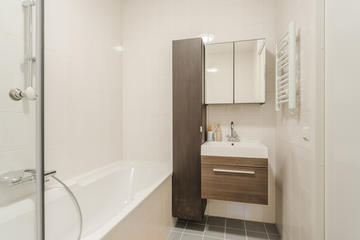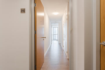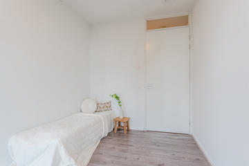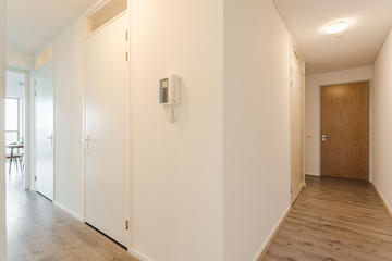 Via de afgesloten centrale entree met lift wordt de 18e verdieping bereikt. Vanaf de corridor toegang tot het appartement. De L-vormige hal beschikt over een garderobenis en een vaste kast met de unit voor stadsverwarming en de meterkast. Er zijn twee slaapkamers, waarvan één met een karakteristieke erker, Frans balkon en beide met weids uitzicht richting Rotterdam. De badkamer is voorzien van een ligbad, inloopdouche en wastafelmeubel. Daarnaast is er een separaat toilet met fontein.
