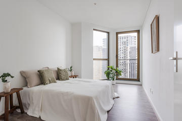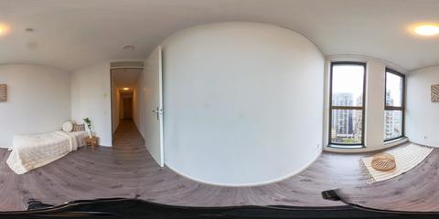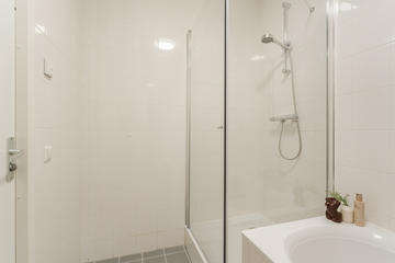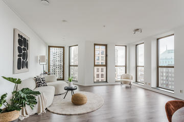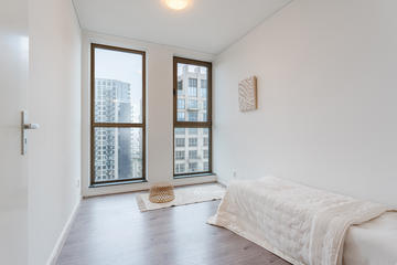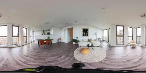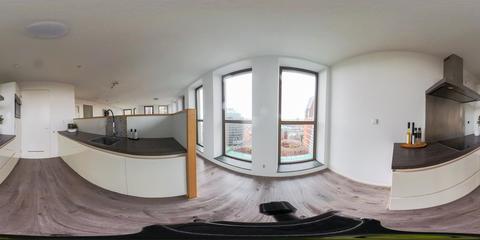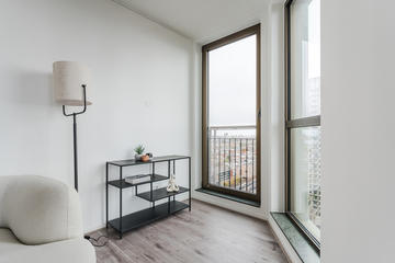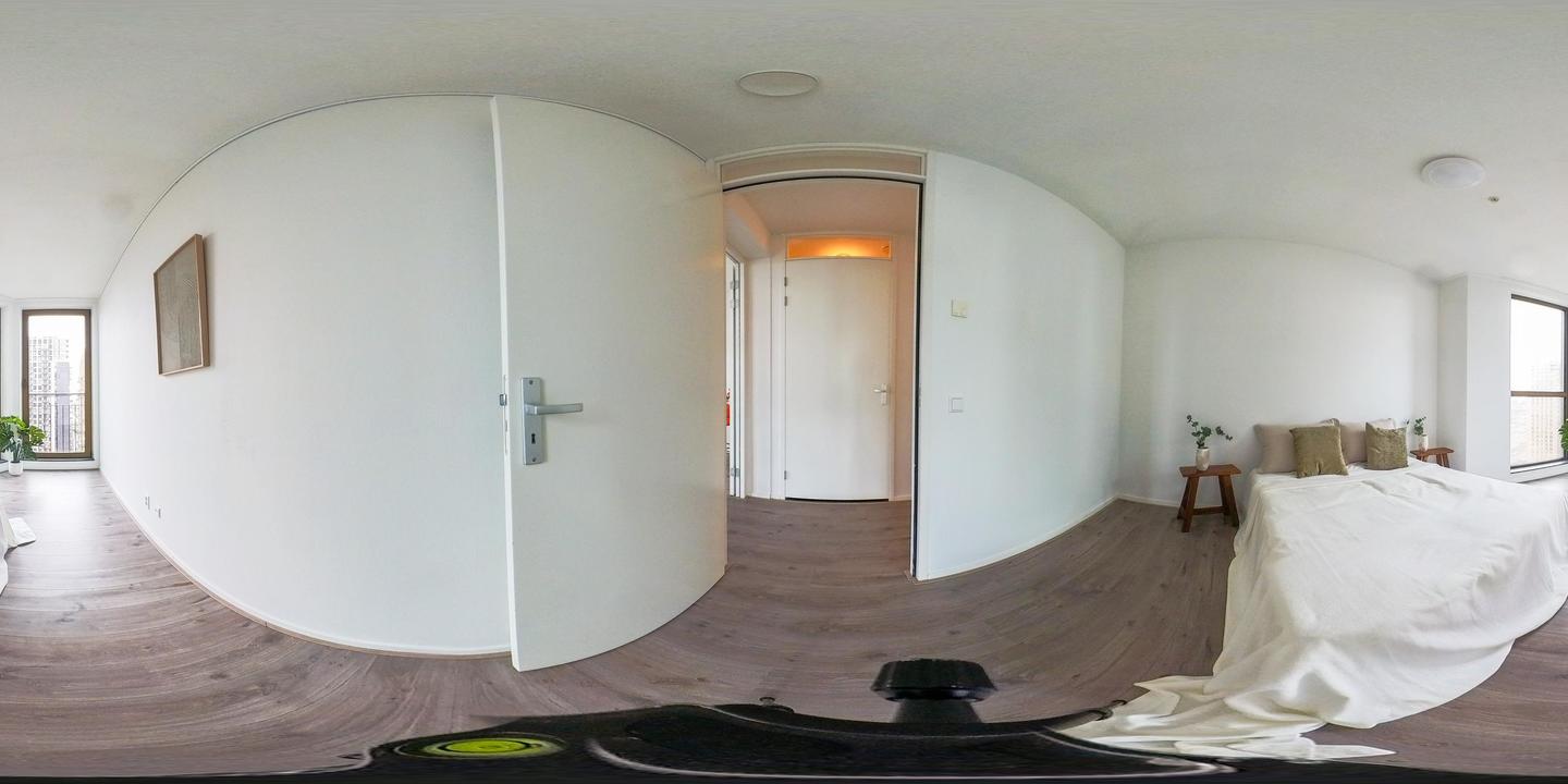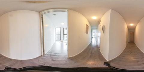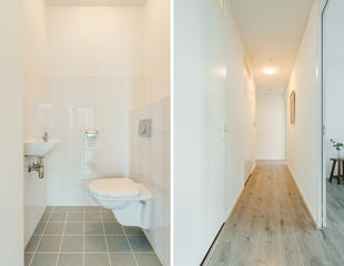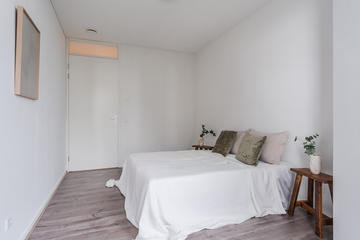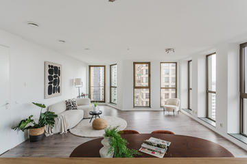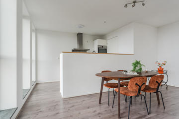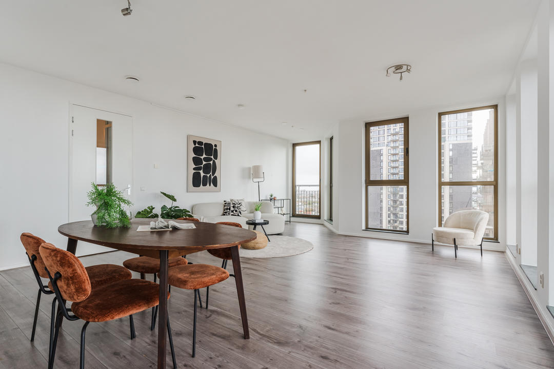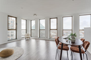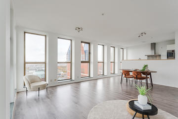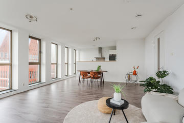 Het appartement is volledig voorzien van een laminaatvloer en raampartijen van vloer tot plafond, waardoor overal een zee aan licht en een bijzonder ruimtelijk gevoel ontstaat.