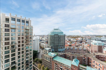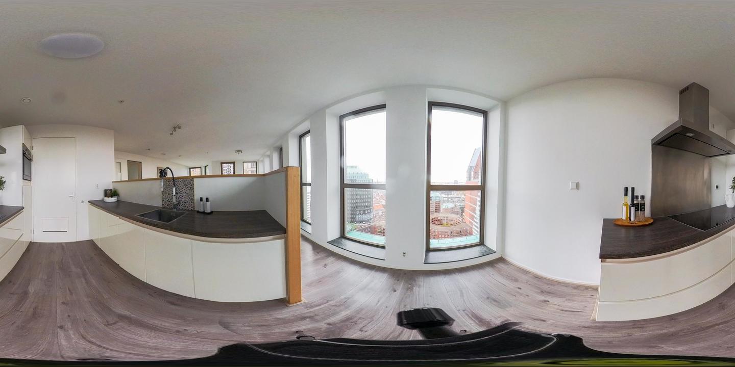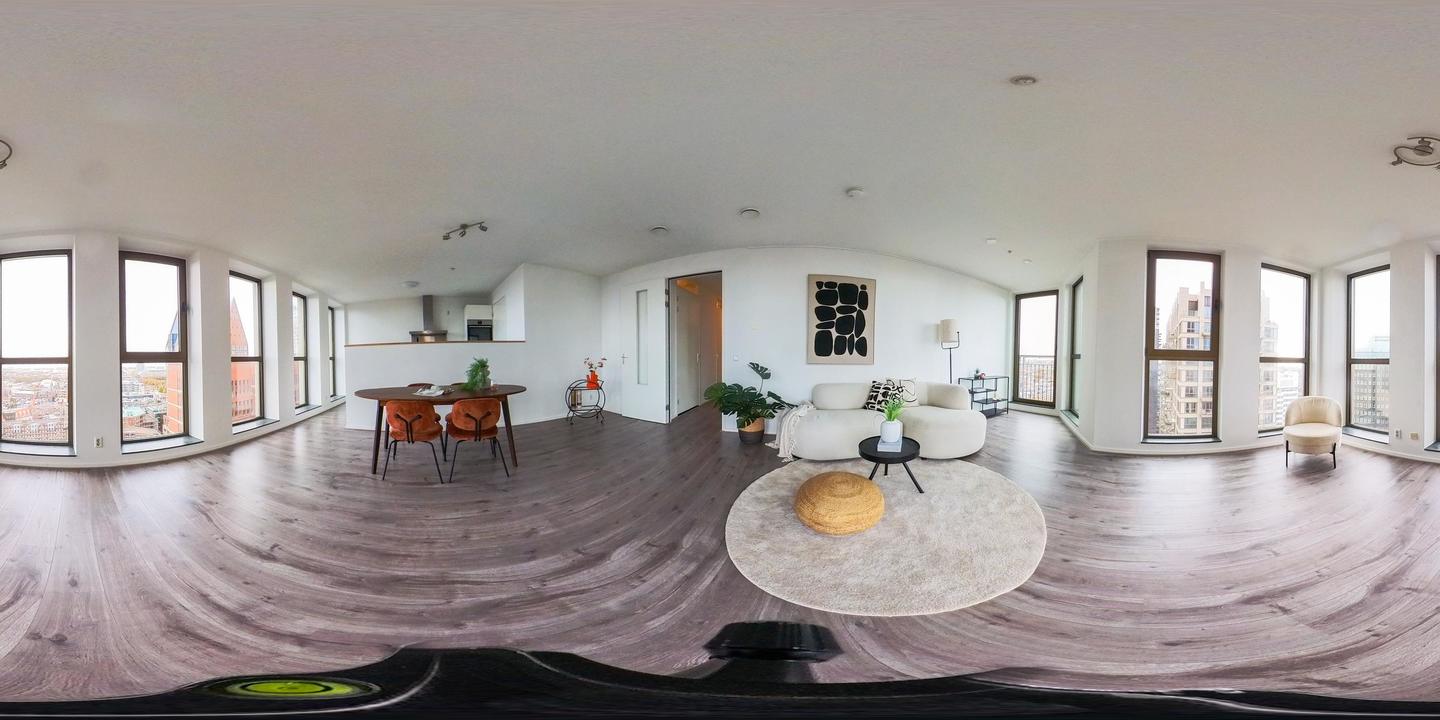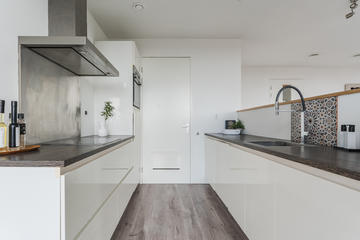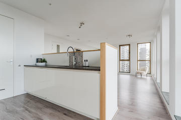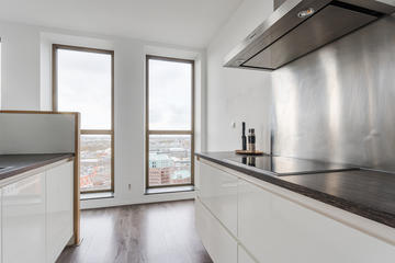 De ruime woonkamer is een ware blikvanger met kamerhoge raampartijen en een adembenemend panoramisch uitzicht over Den Haag tot aan de zee. Zowel overdag als ’s avonds is het uitzicht spectaculair, met een levendig stadsbeeld en schitterende zonsondergangen. De open keuken, met keukenblok aan weerszijde, is voorzien van inbouwapparatuur zoals een vaatwasser, keramische kookplaat, afzuigkap, koelkast en oven. Aangrenzend bevindt zich de praktische bijkeuken met aansluitingen voor wasmachine en droger, de warmteterugwin-installatie en extra bergruimte.