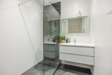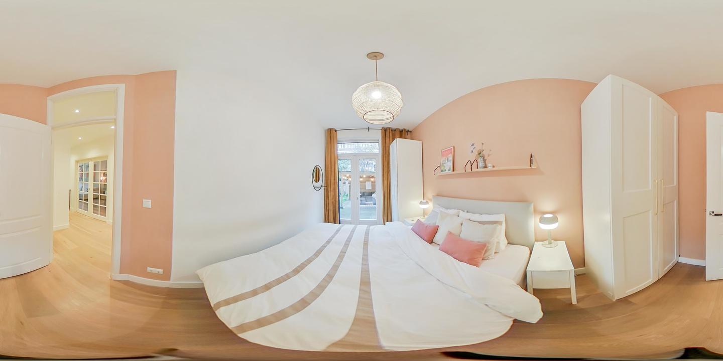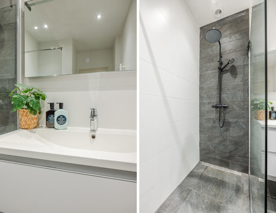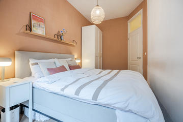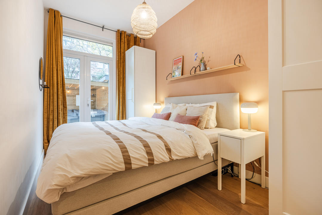 Vanuit de hal is er toegang tot slaapkamer 1 aan de voorzijde met een op maat gemaakte kastenwand waarin tevens de meterkast is opgenomen. De moderne badkamer is voorzien van een inloopdouche, wastafelmeubel, designradiator en mechanische ventilatie. In een aparte kast bevinden zich de aansluitingen voor wasmachine en droger. Het toilet is modern uitgevoerd met een vrijhangend closet, fontein en mechanische ventilatie. Aan de achterzijde bevinden zich de tweede slaapkamer met openslaande deuren naar de tuin en slaapkamer drie, eveneens met toegang tot de tuin en voorzien van een vaste kast met opstelplaats van de c.v.-ketel.