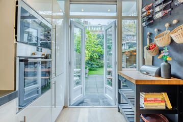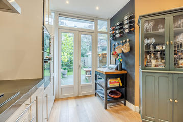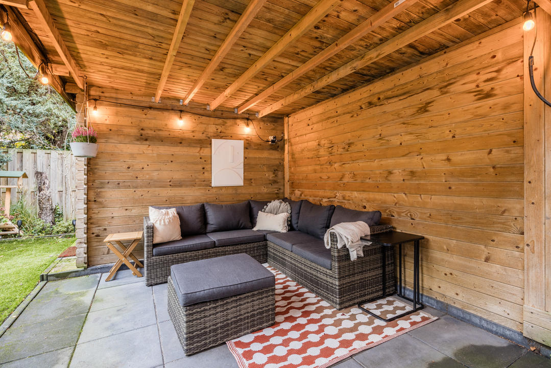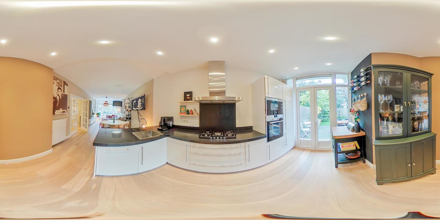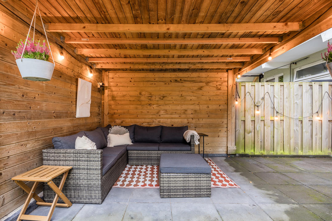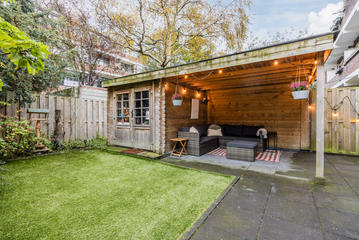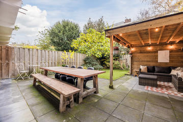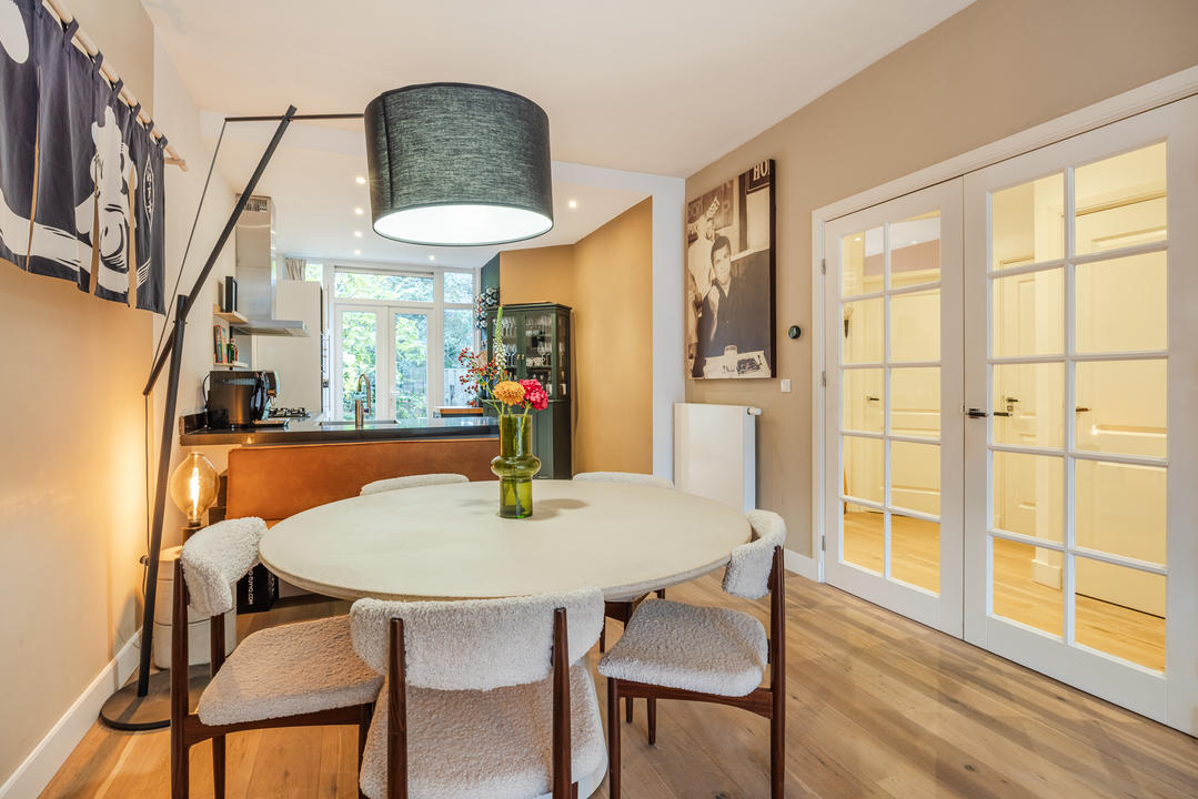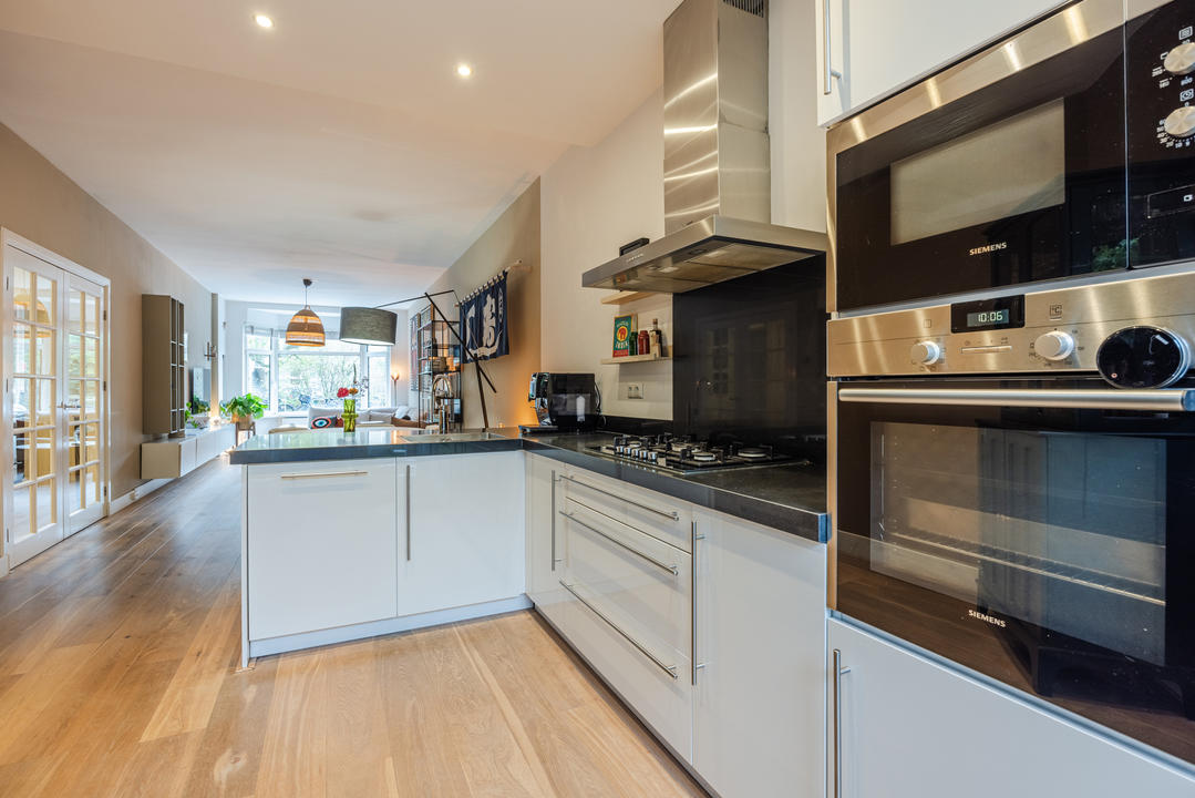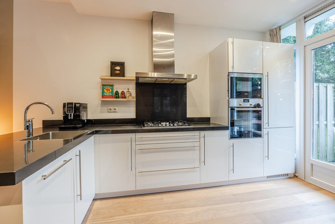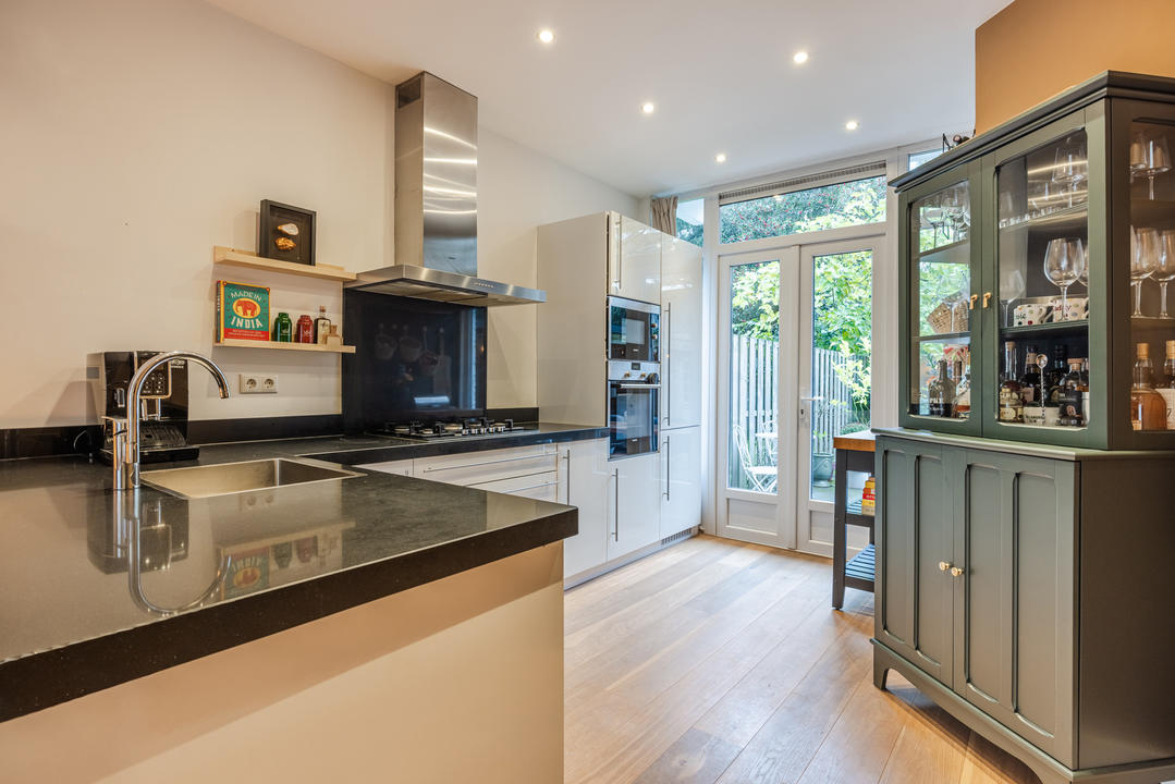 Entree, vestibule en hal met dubbele deuren naar de lichte en sfeervolle woonkamer met erker aan de voorzijde en open keuken aan de achterzijde met keukenblok in L-opstelling is modern uitgevoerd en voorzien van diverse inbouwapparatuur, waaronder een 5-pits gaskookplaat met wokbrander, afzuigkap, oven, magnetron, vaatwasser, koelkast en vriezer. Vanuit de woonkamer geven openslaande deuren toegang tot de fraai aangelegde achtertuin, gelegen op het noordoosten met in de zomer zon van circa 09:00 tot 19:00 uur, voorzien van een gezellige overkapping en houten berging.