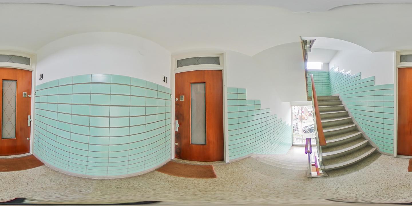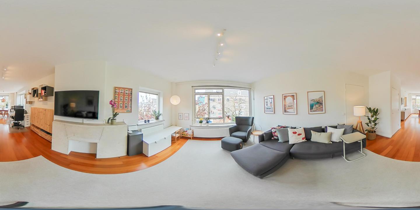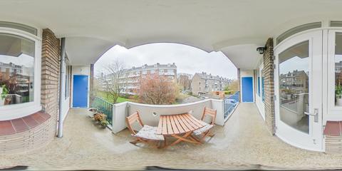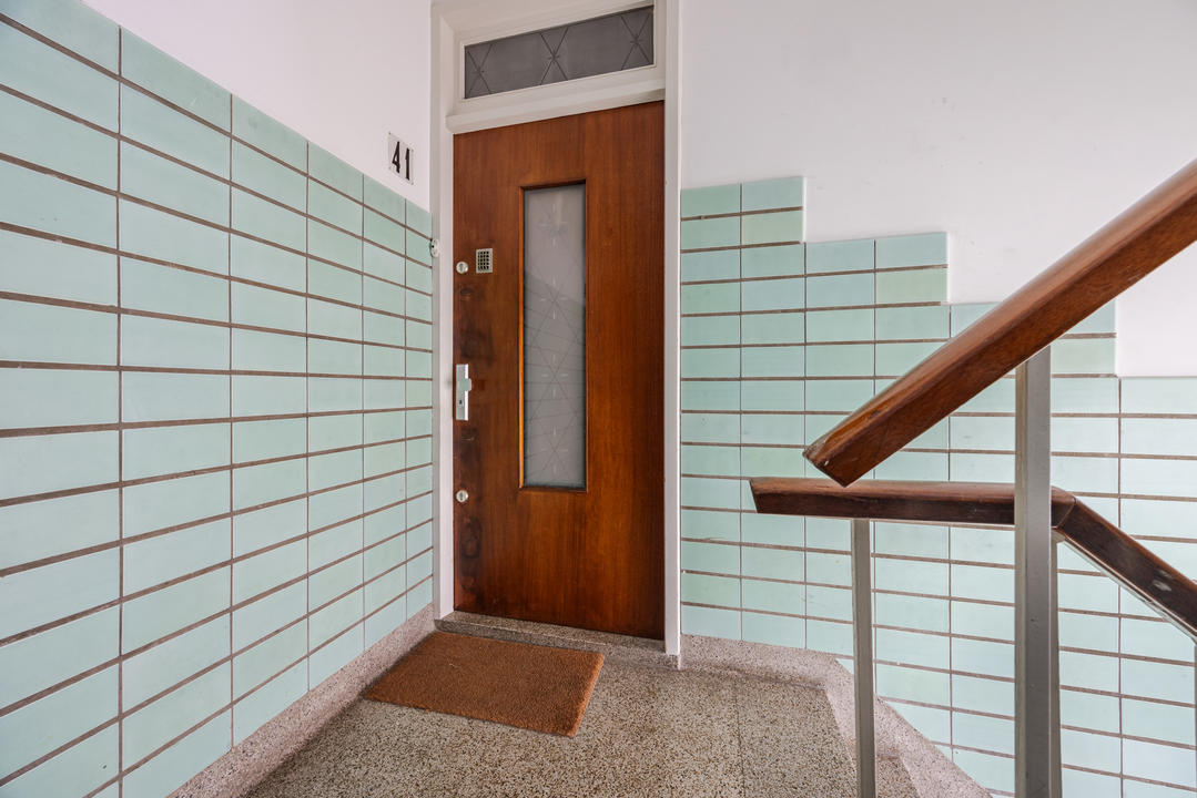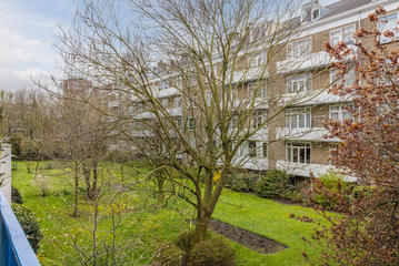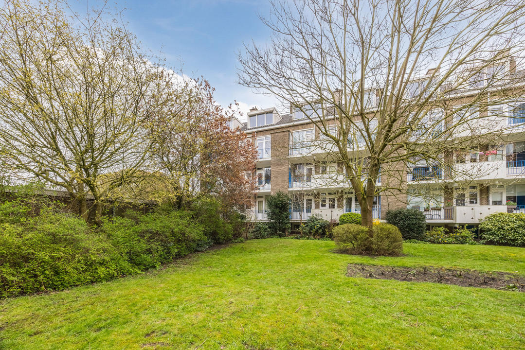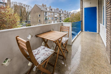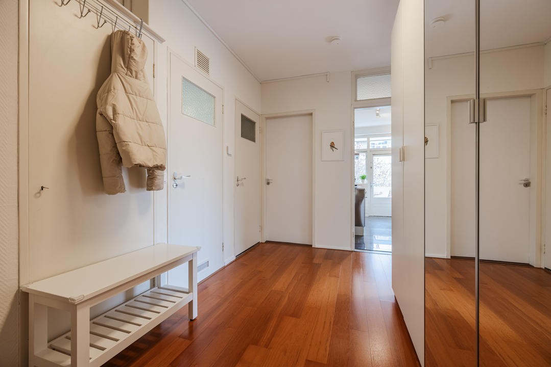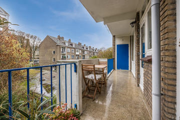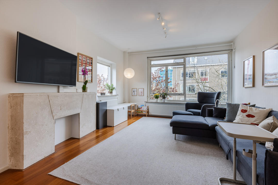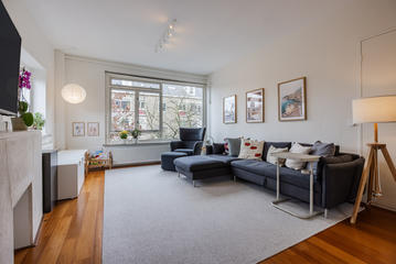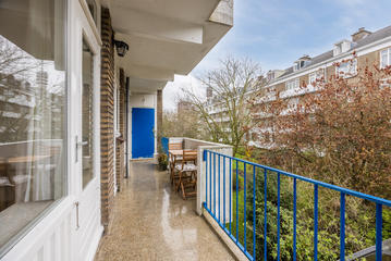 Gesloten portiek met trap naar de 1e verdieping. Entree van het appartement. Hal met meterkast en vaste kast. De woonkamer strekt zich uit over de volle lengte van de woning en is dankzij de hoekligging bijzonder licht, met twee extra ramen in de zijgevel. Aan de voorzijde bevindt zich de originele schouw en vaste kasten, terwijl aan de achterzijde toegang is tot het royale balkon over de gehele breedte, met een extra breed middengedeelte, twee balkonkasten en een gunstige ligging op het westen met zicht op de gemeenschappelijke tuin.