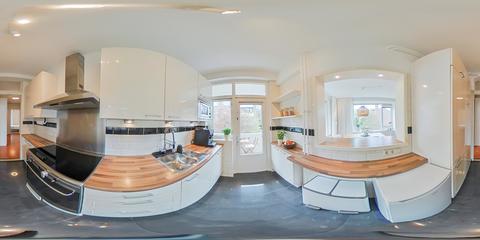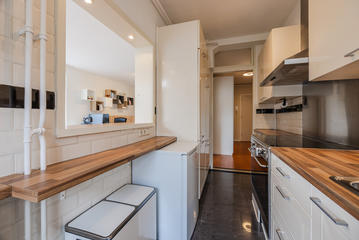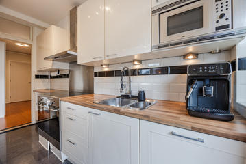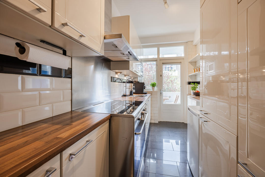 De keuken staat in open verbinding met de woonkamer en is opgesteld aan twee zijden, voorzien van een kast met opstelplaats van de c.v.-combiketel en diverse inbouwapparatuur, waaronder een koelkast, vriezer, groot fornuis met elektrische oven en inductiekookplaat, afzuigkap en vaatwasser. Vanuit de keuken is eveneens het balkon bereikbaar.