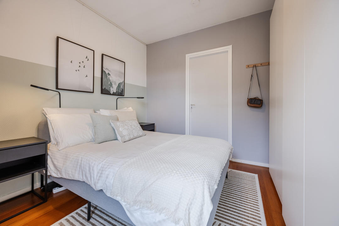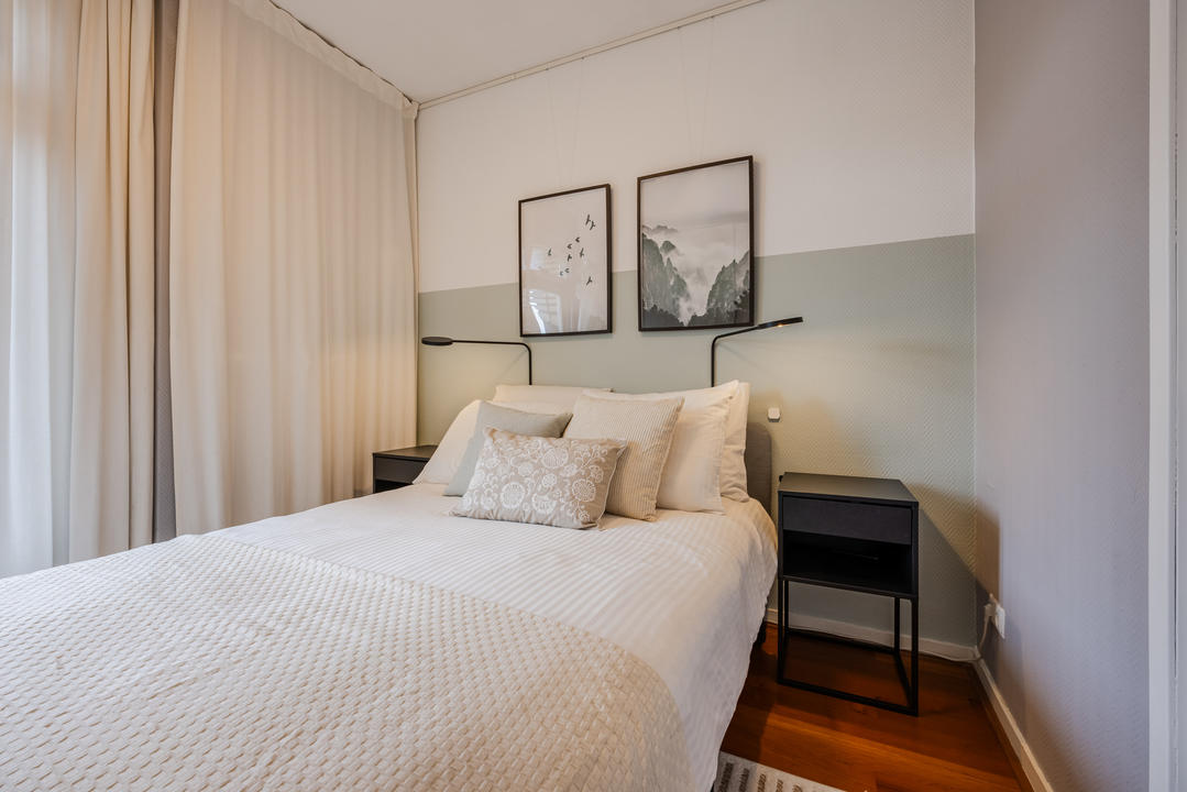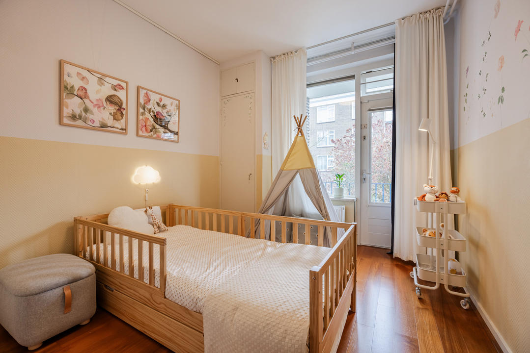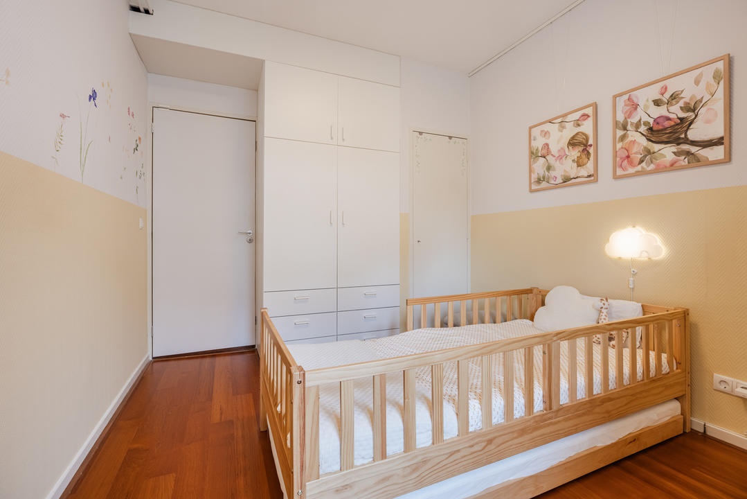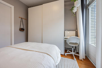 Aan de voorzijde ligt slaapkamer 1 met openslaande deuren naar een balkonnetje. De badkamer is voorzien van een douche, wastafelmeubel, designradiator en mechanische ventilatie. Separaat toilet met vrijhangend closet. Slaapkamer 2 bevindt zich aan de achterzijde en beschikt over twee vaste kasten, een op maat gemaakte kastenwand en toegang tot het balkon.