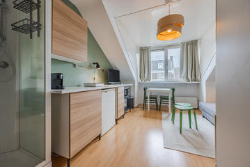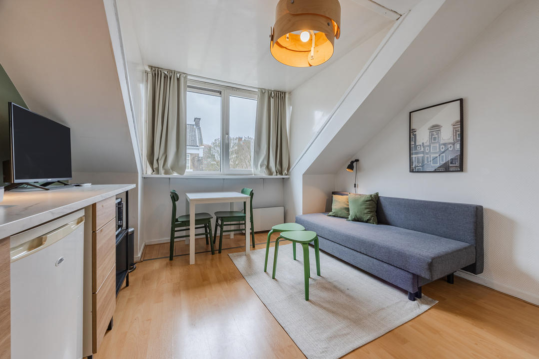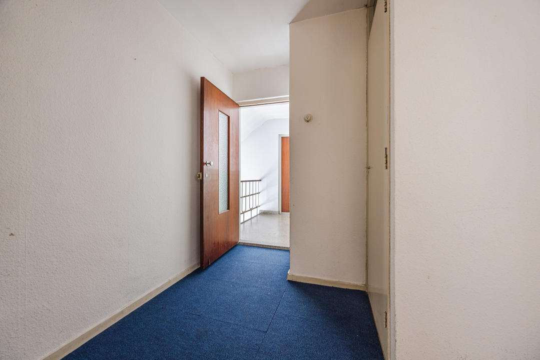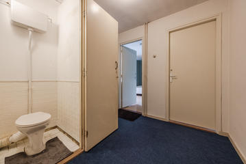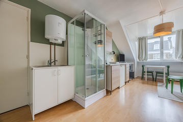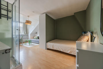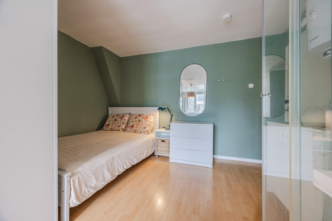 Via het portiek is de zolderverdieping bereikbaar, waar zich een extra kamer bevindt. Deze ruimte is toegankelijk via een gemeenschappelijke hal (gedeeld met één ander appartement) met een gemeenschappelijk toilet en biedt een kamer met dakkapel aan de achterzijde, voorzien van een douche (warm water via elektrische boiler), wastafel en elektrische verwarming. Ideaal te gebruiken als werk-, logeer- of studeerkamer.