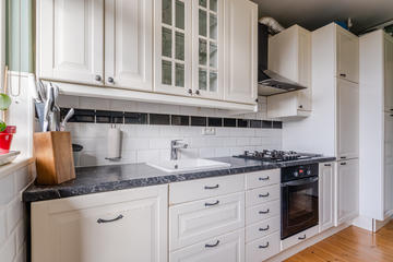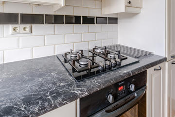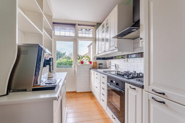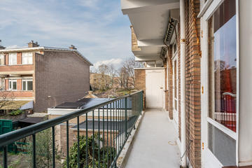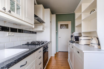 Aan de achterzijde van het appartement is de keuken gesitueerd. De keuken beschikt over een vaste kast met de opstelplaats van de cv-ketel en is uitgerust met diverse inbouwapparatuur, waaronder een koelkast, vriezer, 4-pits gaskookplaat, afzuigkap en oven. Vanuit de keuken is er toegang tot het balkon, voorzien van twee balkonkasten en gunstig gelegen op de zon van circa 14:00 tot 20:00 uur in de zomer.