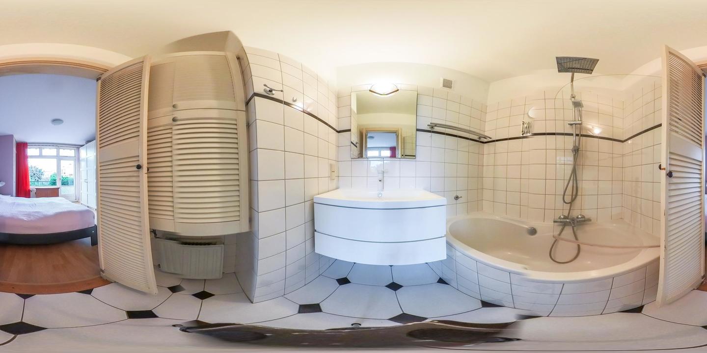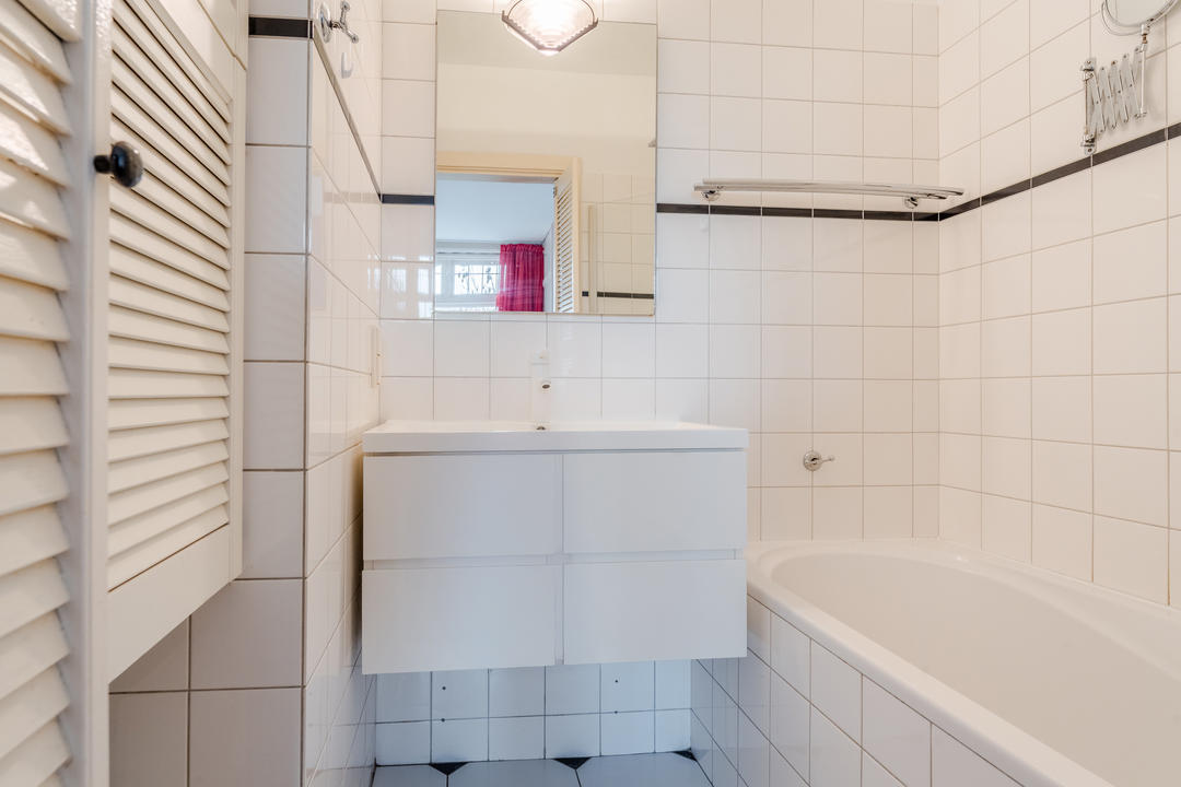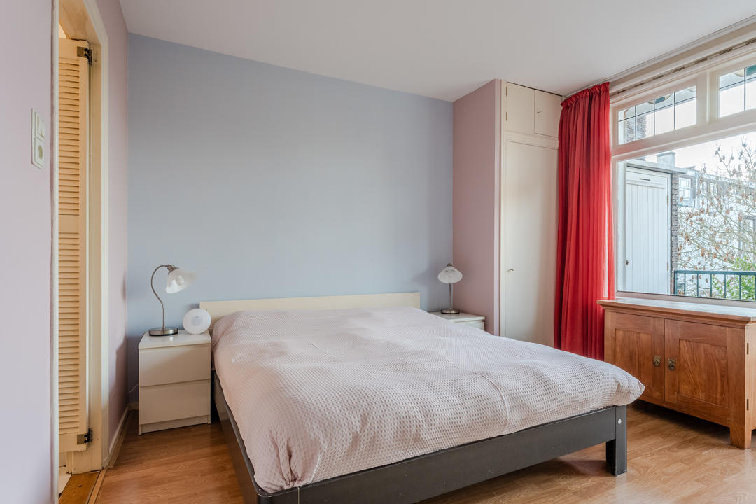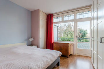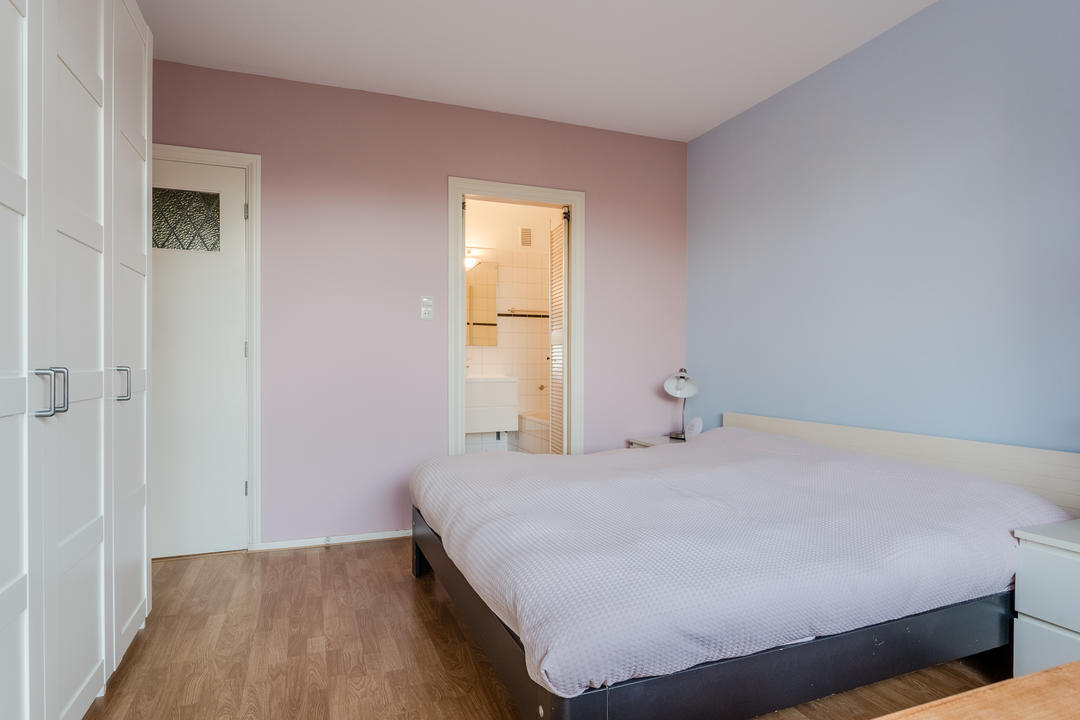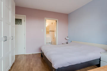 Slaapkamer 1 is eveneens aan de achterzijde gelegen, beschikt over vaste kasten en heeft toegang tot het balkon. Slaapkamer 2 is voorzien van een vaste kast en geeft toegang tot zowel het balkon als de badkamer. De badkamer is uitgevoerd met een bad-/douchecombinatie en een wastafel in meubel. Daarnaast is er een separaat toilet met fontein.