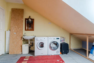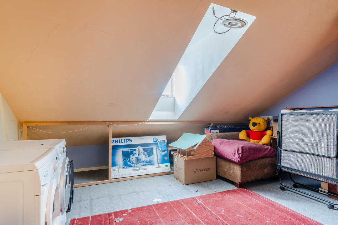 Via het portiek is de zolderkamer (ca. 13m2) bereikbaar. Deze ruimte is voorzien van elektra, water en warmwater middels een close-in boiler, evenals aansluitingen voor wasmachine en droger.