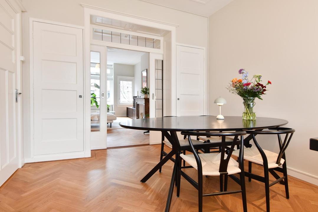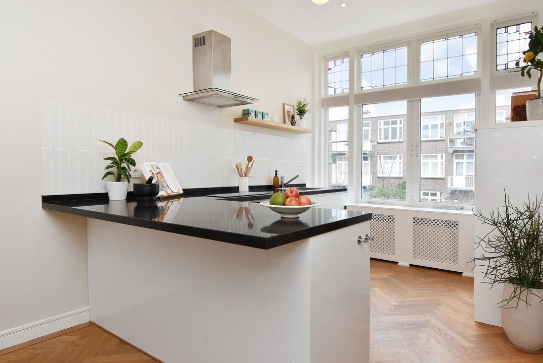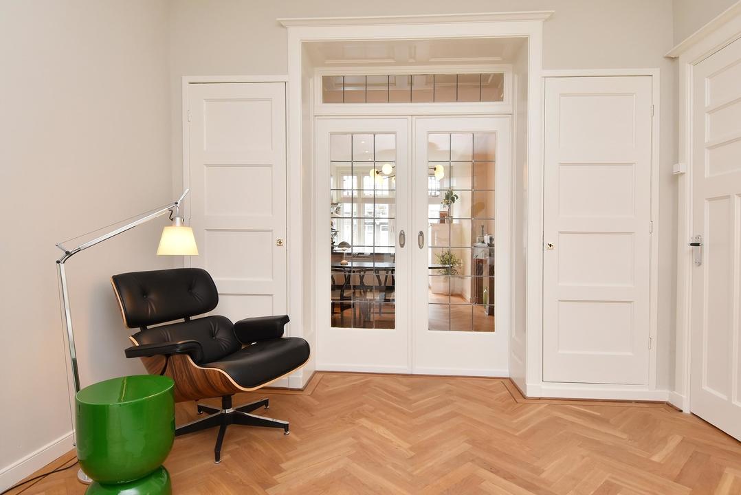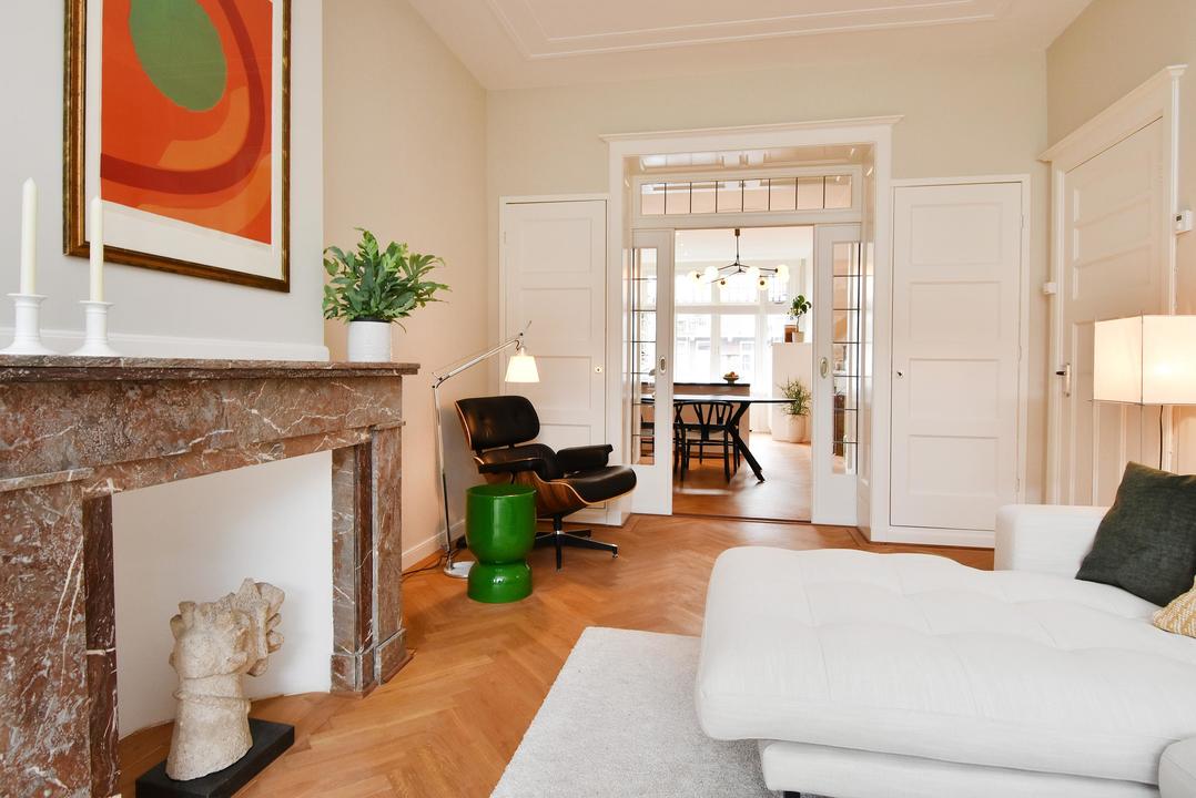 De royale woonkamer en suite vormt het hart van de woning en ademt sfeer en karakter. De originele suiteseparatie met glas-in-lood schuifdeuren en vier vaste kasten is prachtig behouden gebleven. De voorkamer beschikt over een erker, ornamentenplafonds en een originele schouw, wat zorgt voor een stijlvolle en warme uitstraling. In de achterkamer van de en suite is de keuken in L-opstelling gesitueerd. De keuken is voorzien van diverse inbouwapparatuur, waaronder een vaatwasser, 4-pits inductiekookplaat, recirculatieafzuigkap, oven en koelkast met vriesvak. In een aparte kast is de c.v.-combiketel opgesteld. Deze sfeervolle ruimte biedt volop plaats voor een royale eettafel en beschikt eveneens over een originele schouw, wat zorgt voor een charmante en authentieke ambiance tijdens het koken en tafelen.