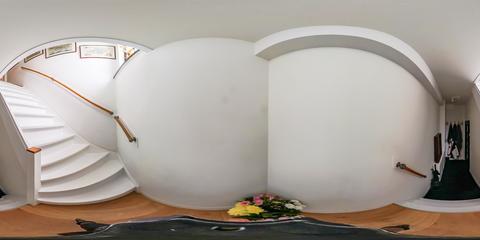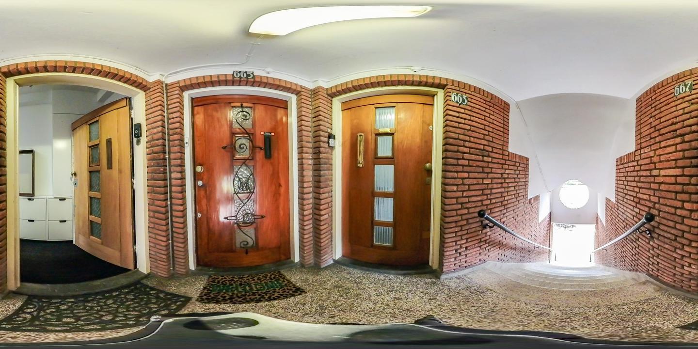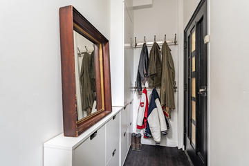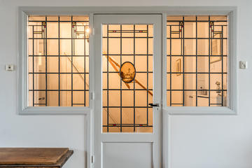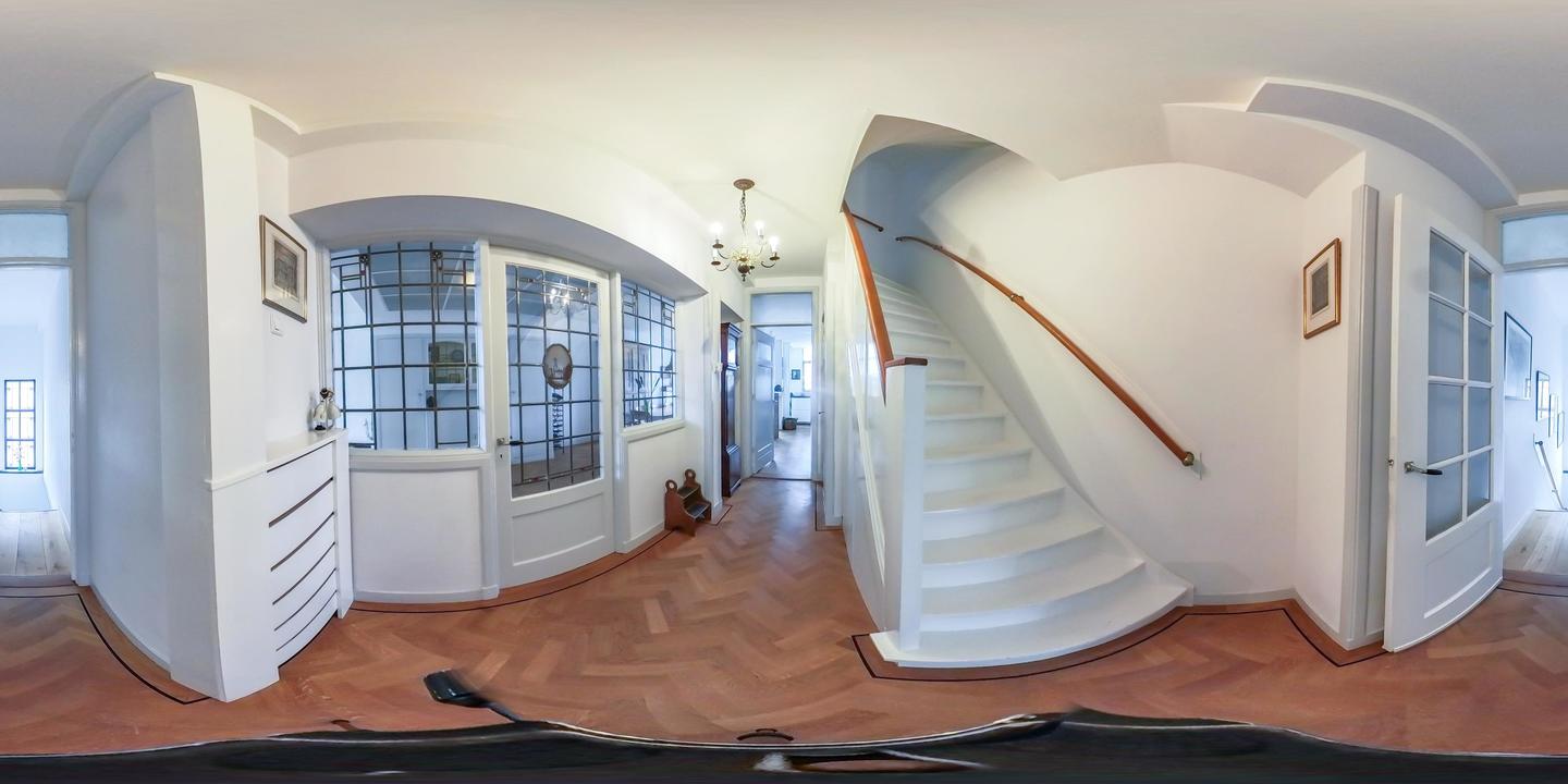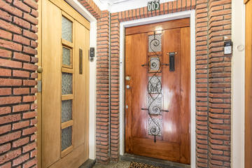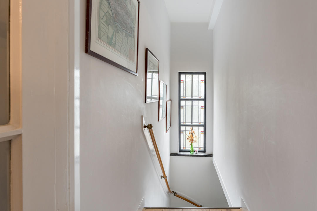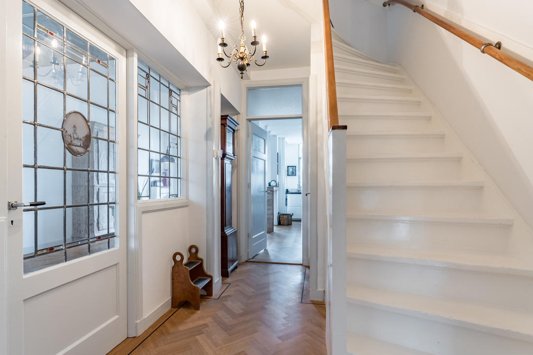 Open portiek met trap naar de eerste verdieping. Entree van de woning met meterkast, garderobe en bordestrap naar de tweede verdieping, waar het fraaie glas-in-loodraam in het trappenhuis direct in het oog springt.