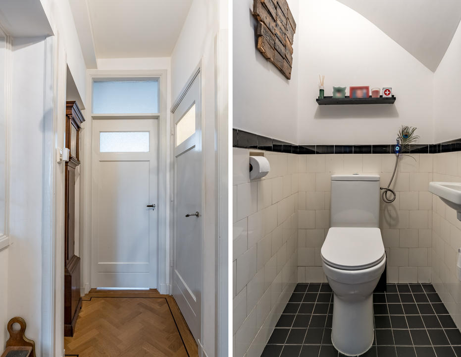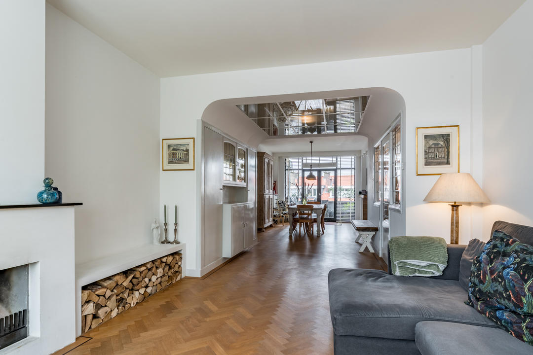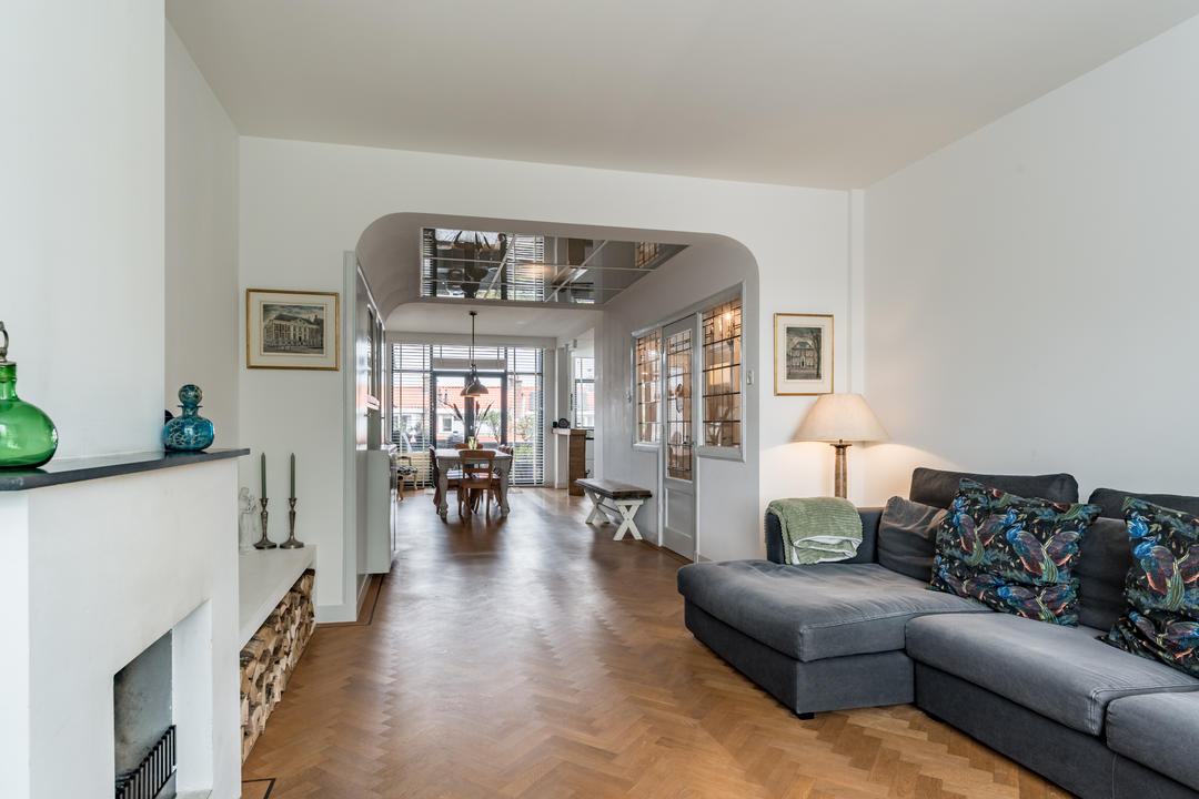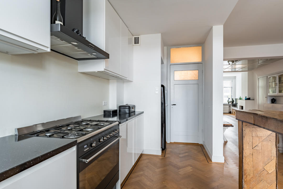 Hal met bergkast onder de trap naar de derde verdieping en een toilet met fontein. Vanuit de hal toegang, via een karakteristiek kozijn en deur met glas-in-loodramen, tot de sfeervolle woonkamer. In het midden bevinden zich de originele vaste kasten, het zitgedeelte aan de voorzijde is extra breed met een open haard. Aan de achterzijde bevindt zich de eetkamer met open keuken met modern keukenblok in L-opstelling, voorzien van een groot fornuis met zes gaspitten en oven, afzuigkap en vaatwasser. Vanuit de eetkamer zijn er openslaande deuren naar het ruime balkon met balkonkast.