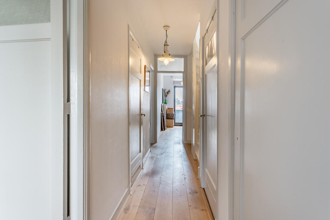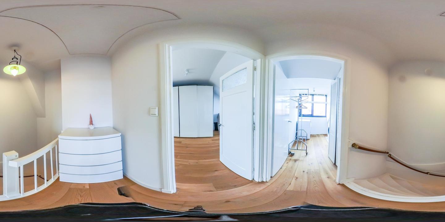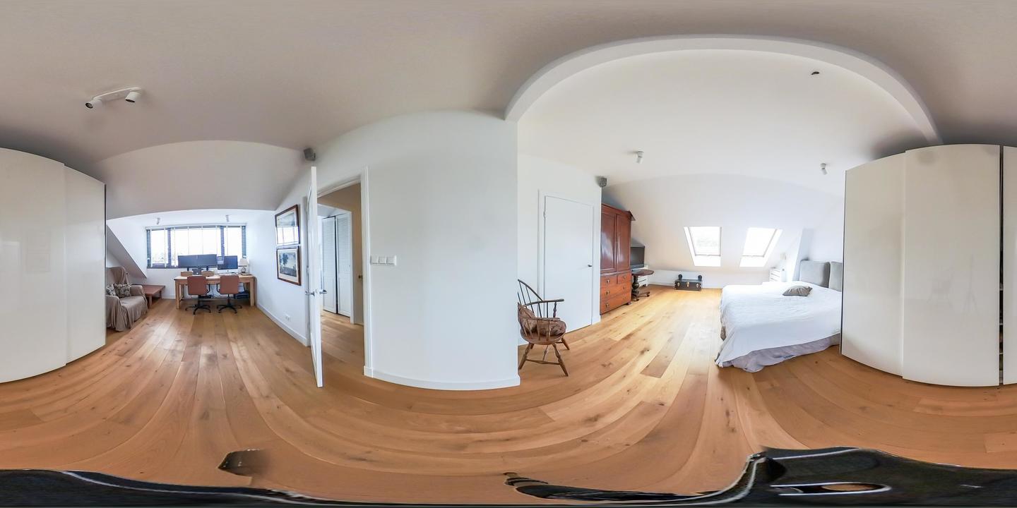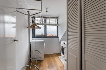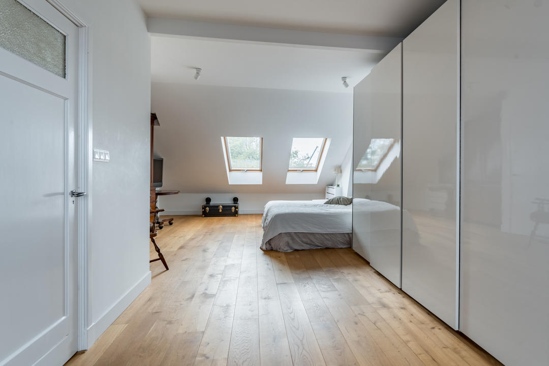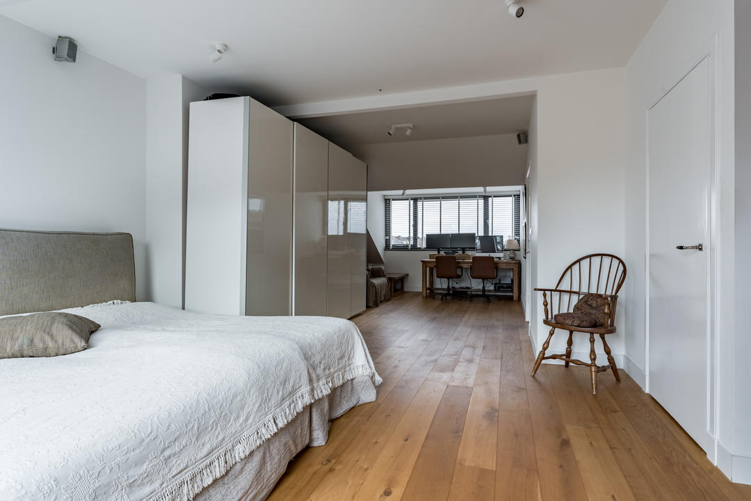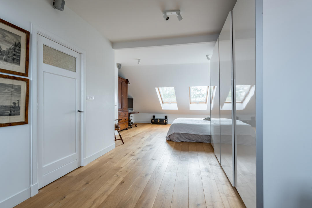 Overloop met toegang tot de waskamer met dakkapel, aansluiting voor wasmachine en droger, en kast met opstelplaats voor de cv-combiketel. Aansluitend een grote multifunctionele ruimte over de volle lengte van de woning, momenteel de master bedroom met een werkplek in de dakkapel, met modern toilet (vrijhangend closet), twee grote Velux dakramen aan de voorzijde en een dakkapel aan de achterzijde met fraai uitzicht richting de skyline van Den Haag. Deze ruimte is eenvoudig te verdelen in twee grote slaapkamers. De gehele verdieping is afgewerkt met een eikenhouten parketvloer.