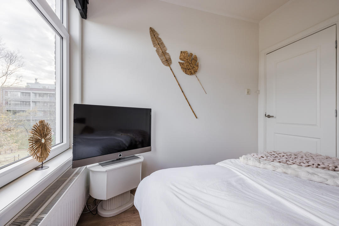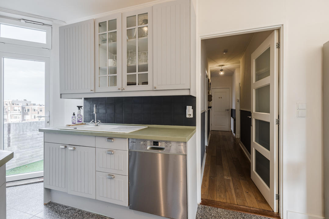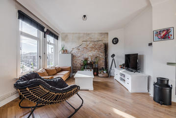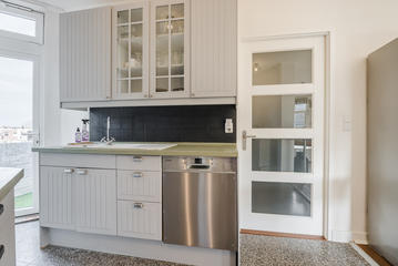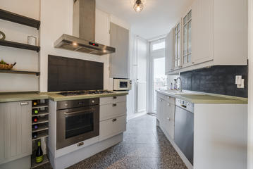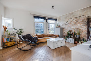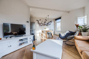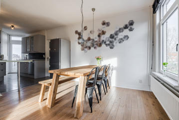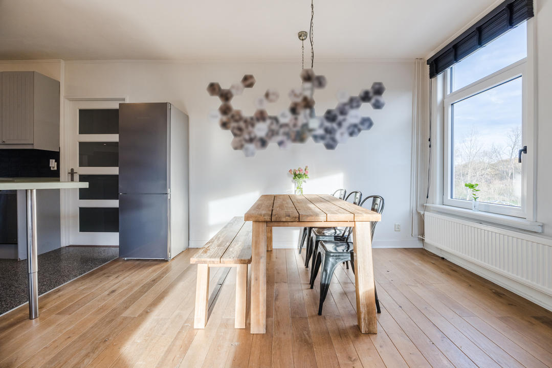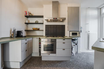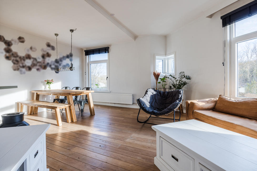 De royale woonkamer strekt zich uit over de breedte van de woning en is hierdoor uitzonderlijk licht, met een vrij uitzicht over de Bosjes van Poot. De halfopen keuken is voorzien van een oven, 5-pits gaskookplaat met wokbrander, een kast met opstelplaats voor de cv-ketel en biedt toegang tot het balkon met zomers avondzon.