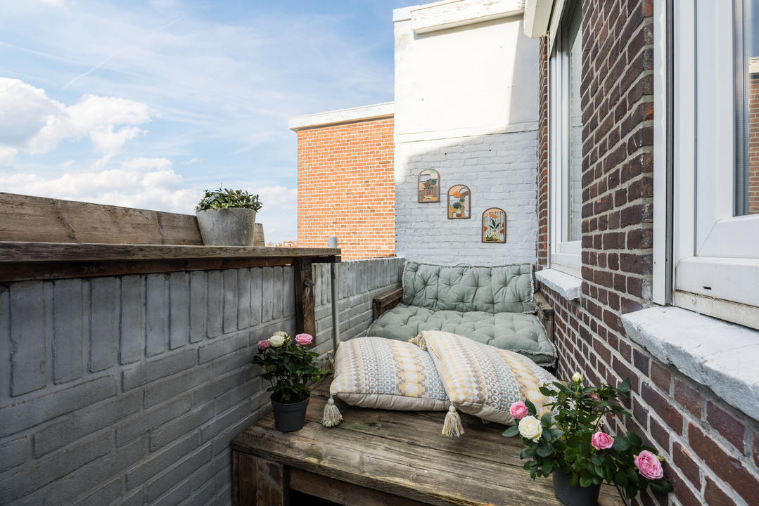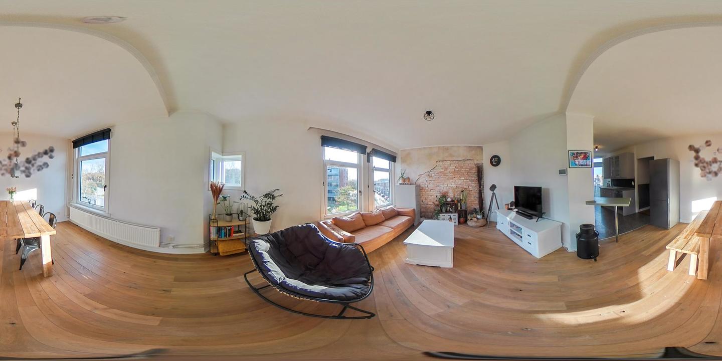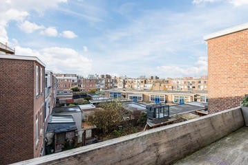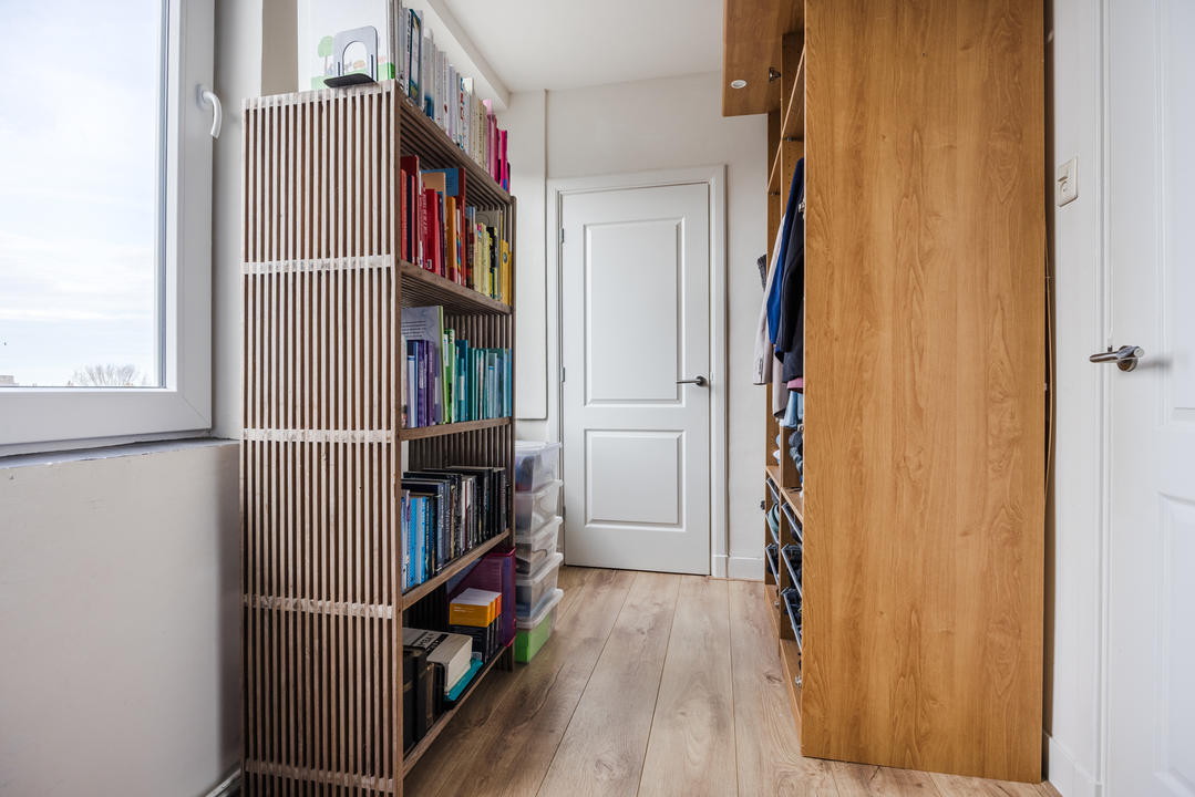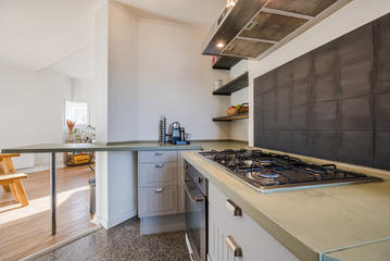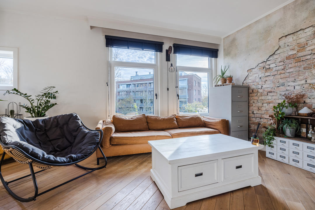 De royale woonkamer strekt zich uit over de breedte van de woning en is hierdoor uitzonderlijk licht, met een vrij uitzicht over de Bosjes van Poot. De halfopen keuken is voorzien van een oven, 5-pits gaskookplaat met wokbrander, een kast met opstelplaats voor de cv-ketel en biedt toegang tot het balkon met zomers avondzon.