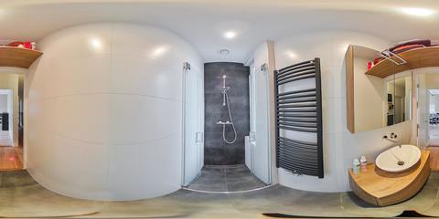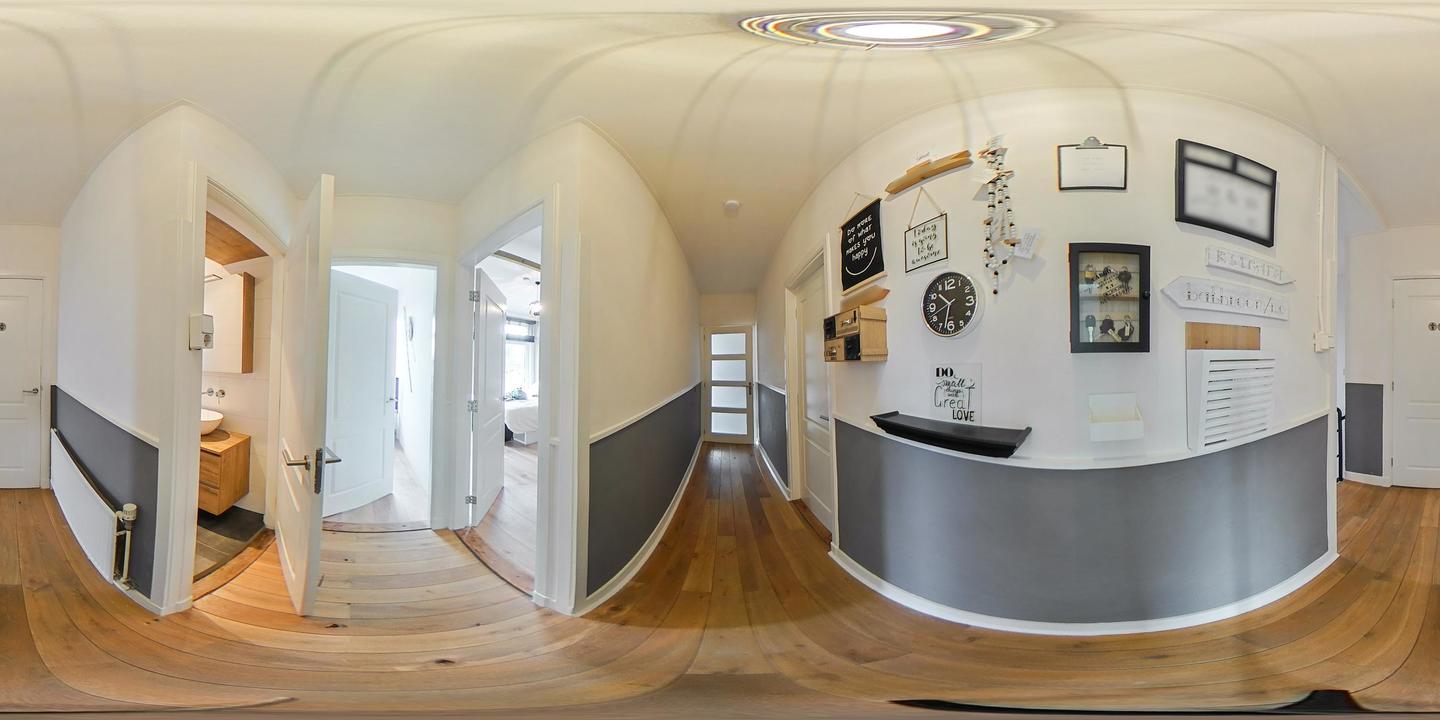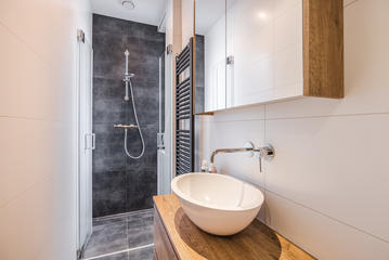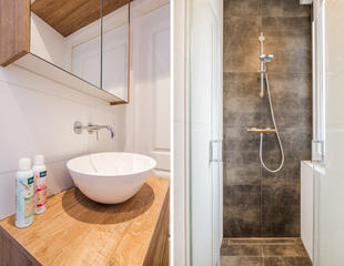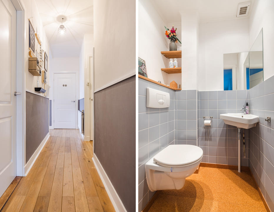 Overloop met toegang tot het moderne toilet met vrijhangend closet en fontein. De badkamer is uitgerust met een inloopdouche, wastafel in meubel en designradiator. Aan de voorzijde bevinden zich twee slaapkamers. De derde slaapkamer ligt aan de achterzijde en beschikt over een vaste kast.