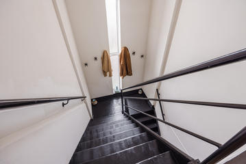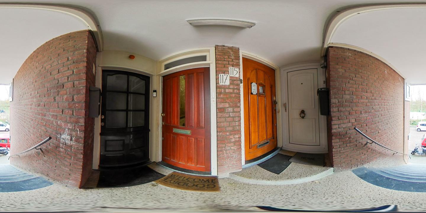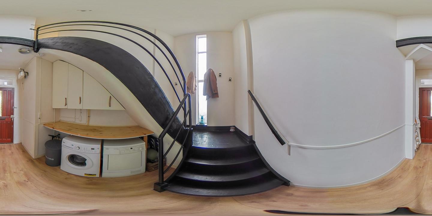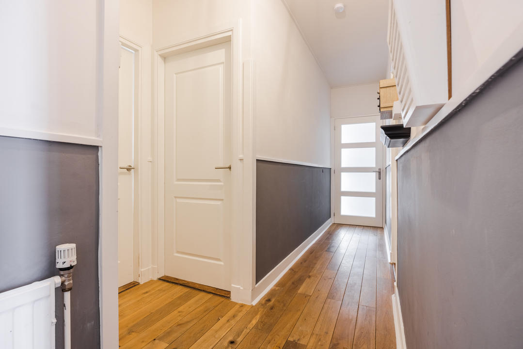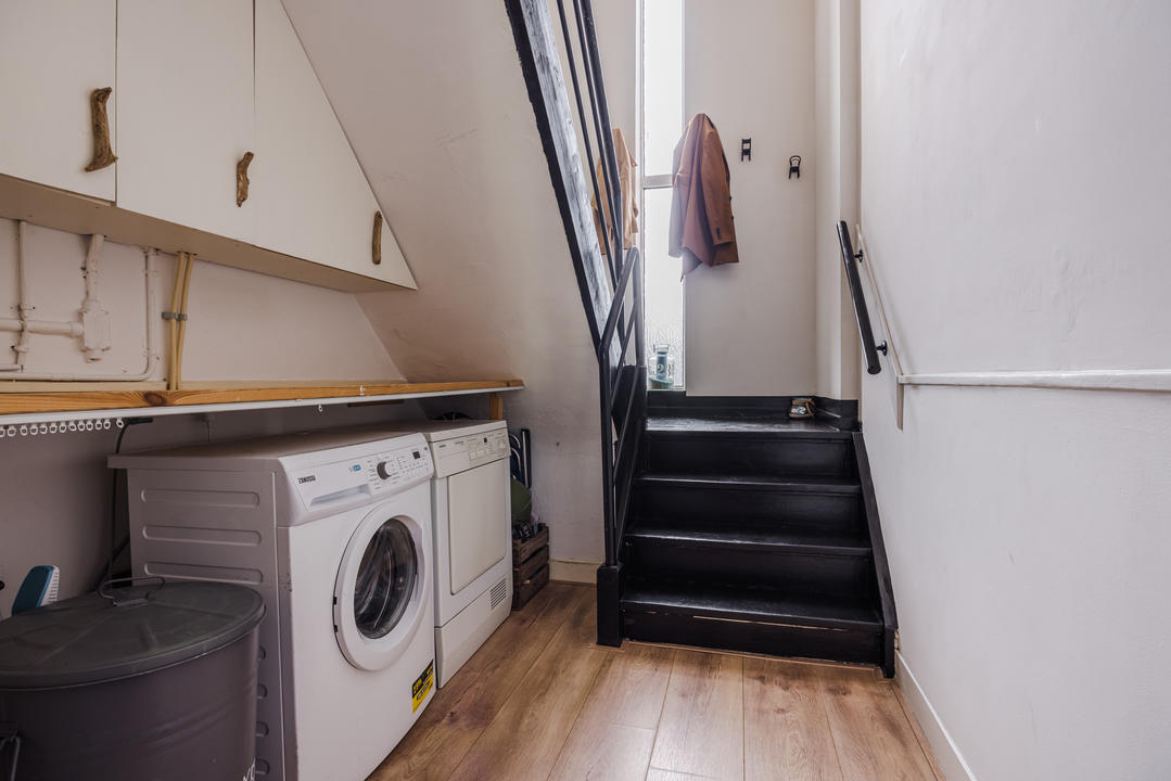 Open portiek met trap naar de 1e verdieping. Entree van het appartement. Hal met bergruimte, wasmachine- en drogeraansluiting, meterkast en bordestrap naar de 2e verdieping.