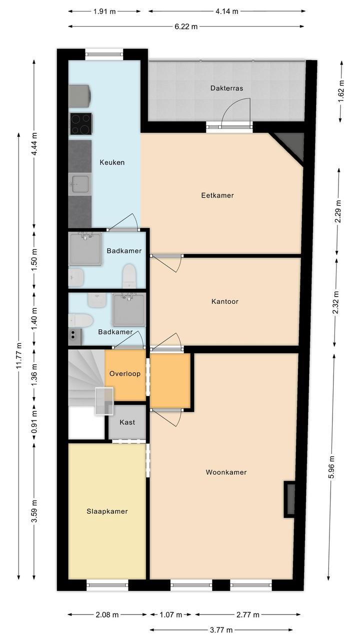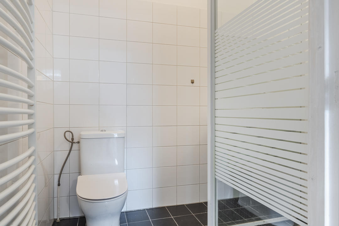 Overloop met daklicht en de 1 badkamer voorzien van toilet, douche, wastafel en de opstelplaats voor de cv-combiketel, eveneens met daklicht. Aan de voorzijde ligt de woonkamer met doorloop naar de voorzijkamer. Vanaf de overloop is er toegang tot een tussenkamer met doorloop naar de ruime woonkeuken. Vanuit de woonkeuken is er toegang tot het balkon en tot de 2e badkamer met een douche, toilet en wastafel.