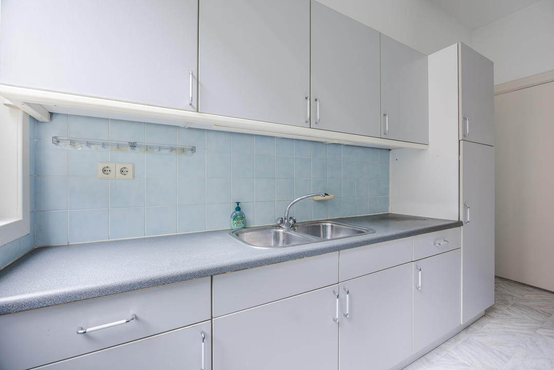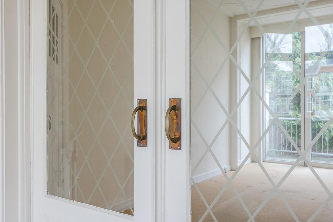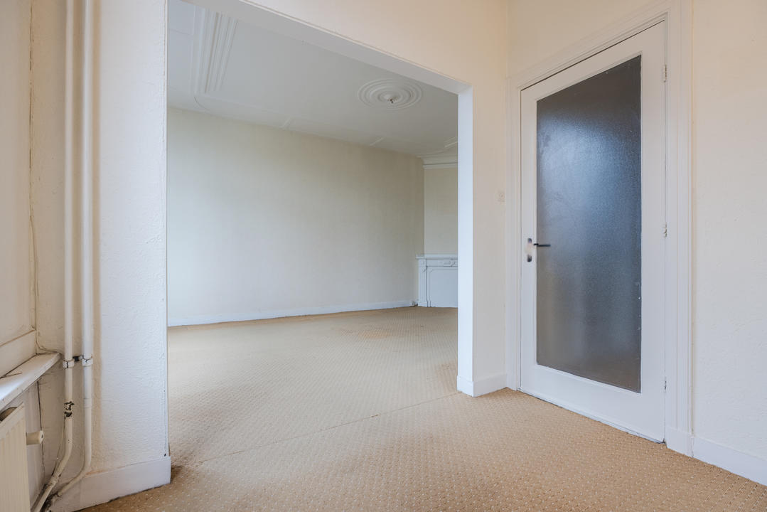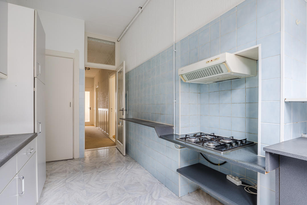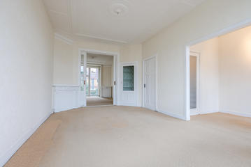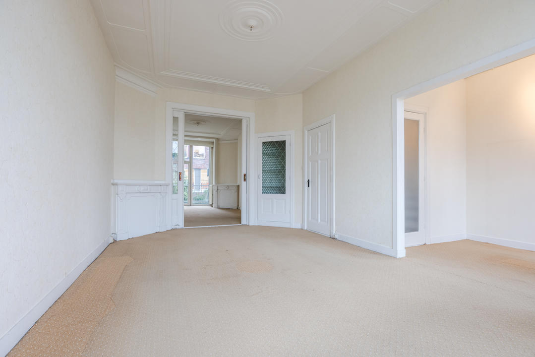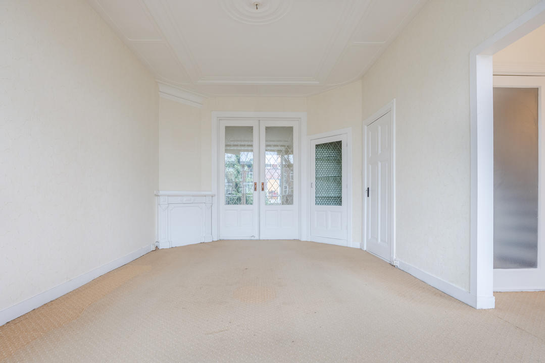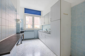 Overloop met een eenvoudig toilet en garderobekast. De royale L-vormige woon-/eetkamer en suite vormt het hart van de woning en biedt met een plafondhoogte van circa 3,19 meter een prettig ruimtelijk gevoel. De voorzijkamer is bij de woonkamer getrokken, maar kan eenvoudig weer worden afgesplitst tot bijvoorbeeld een separate werk- of studeerkamer. De karakteristieke suiteseparatie met schuifdeuren met geslepen glas, drie vaste kasten en de ornamenten plafonds geven de woning veel sfeer en vormen een uitstekende basis voor een eigentijdse modernisering. Aan de achterzijde is er toegang tot het balkon. De dichte keuken bevindt zich aan de achterzijde en is voorzien van een eenvoudig keukenblok, vaste kast en wasmachineaansluiting – ideaal om geheel naar eigen smaak te vernieuwen.