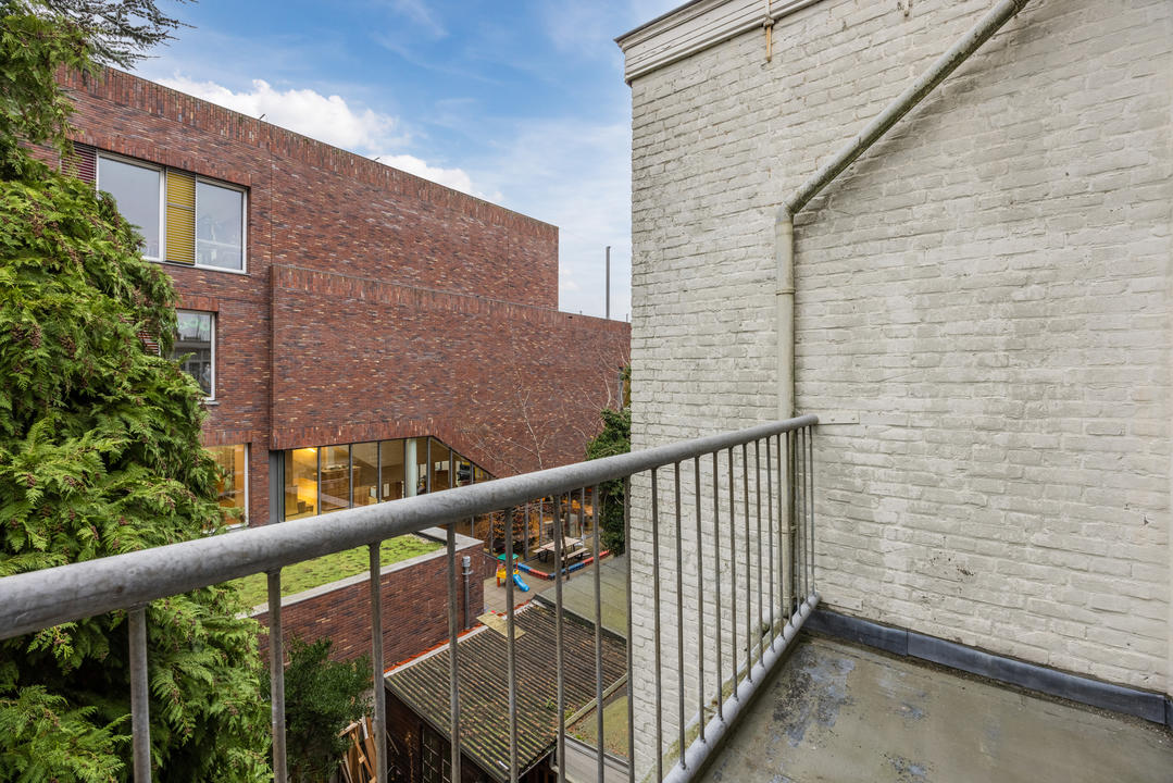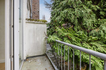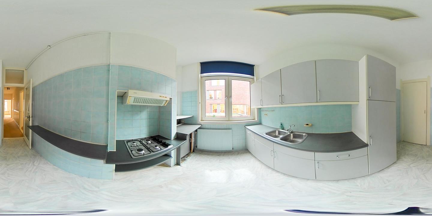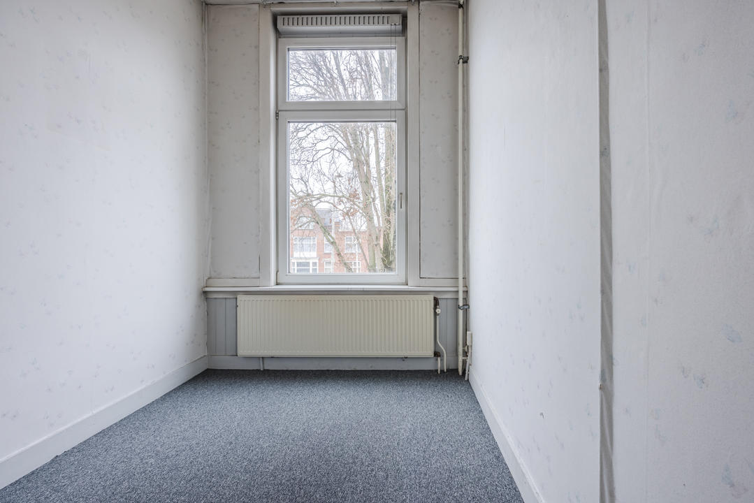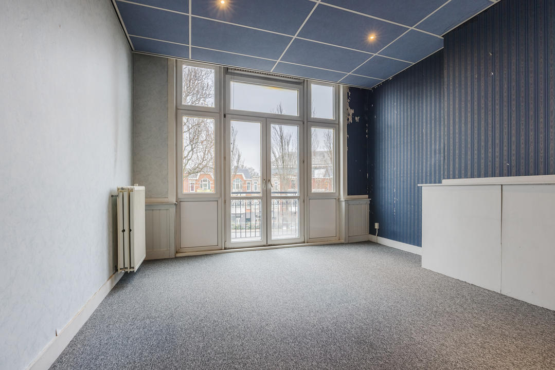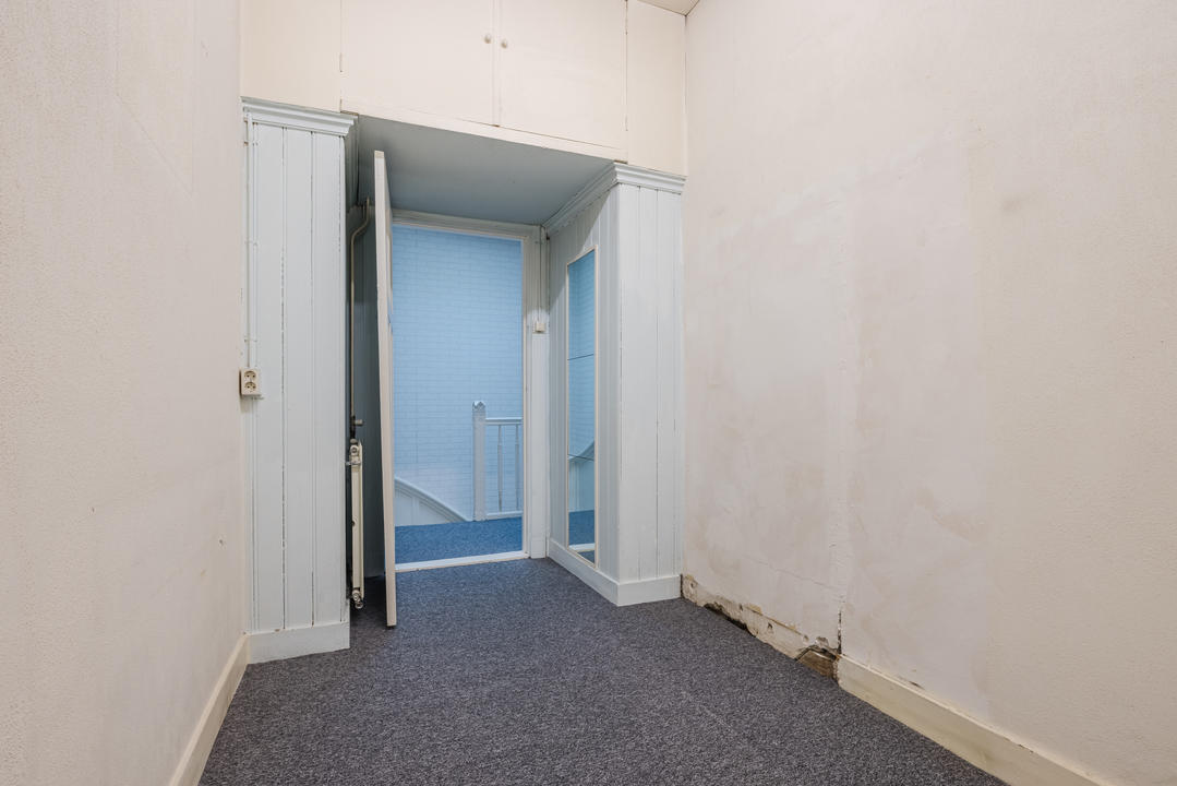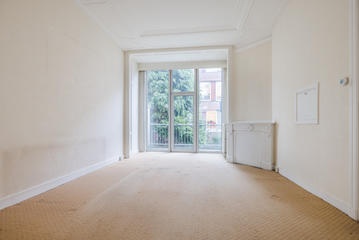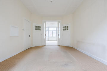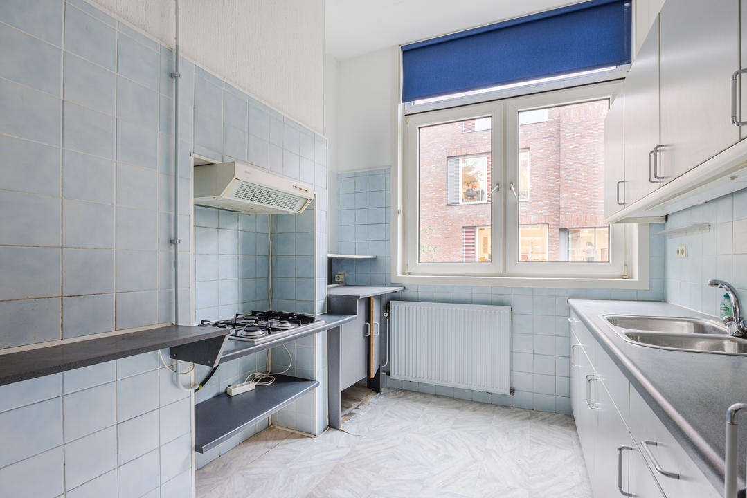 Overloop met een eenvoudig toilet en garderobekast. De royale L-vormige woon-/eetkamer en suite vormt het hart van de woning en biedt met een plafondhoogte van circa 3,19 meter een prettig ruimtelijk gevoel. De voorzijkamer is bij de woonkamer getrokken, maar kan eenvoudig weer worden afgesplitst tot bijvoorbeeld een separate werk- of studeerkamer. De karakteristieke suiteseparatie met schuifdeuren met geslepen glas, drie vaste kasten en de ornamenten plafonds geven de woning veel sfeer en vormen een uitstekende basis voor een eigentijdse modernisering. Aan de achterzijde is er toegang tot het balkon. De dichte keuken bevindt zich aan de achterzijde en is voorzien van een eenvoudig keukenblok, vaste kast en wasmachineaansluiting – ideaal om geheel naar eigen smaak te vernieuwen.
