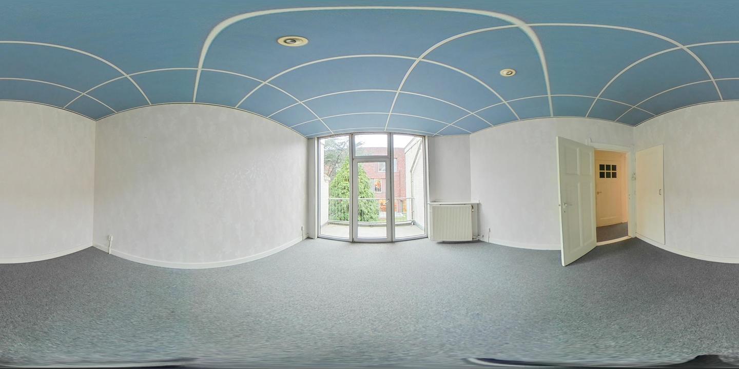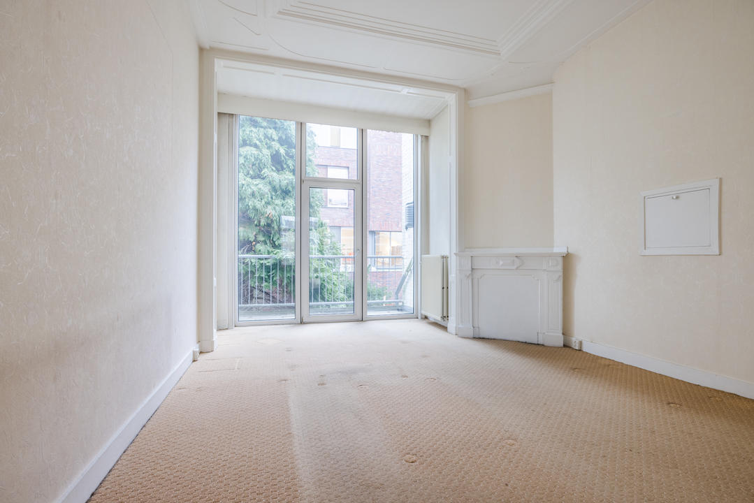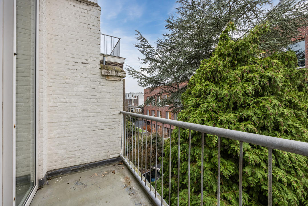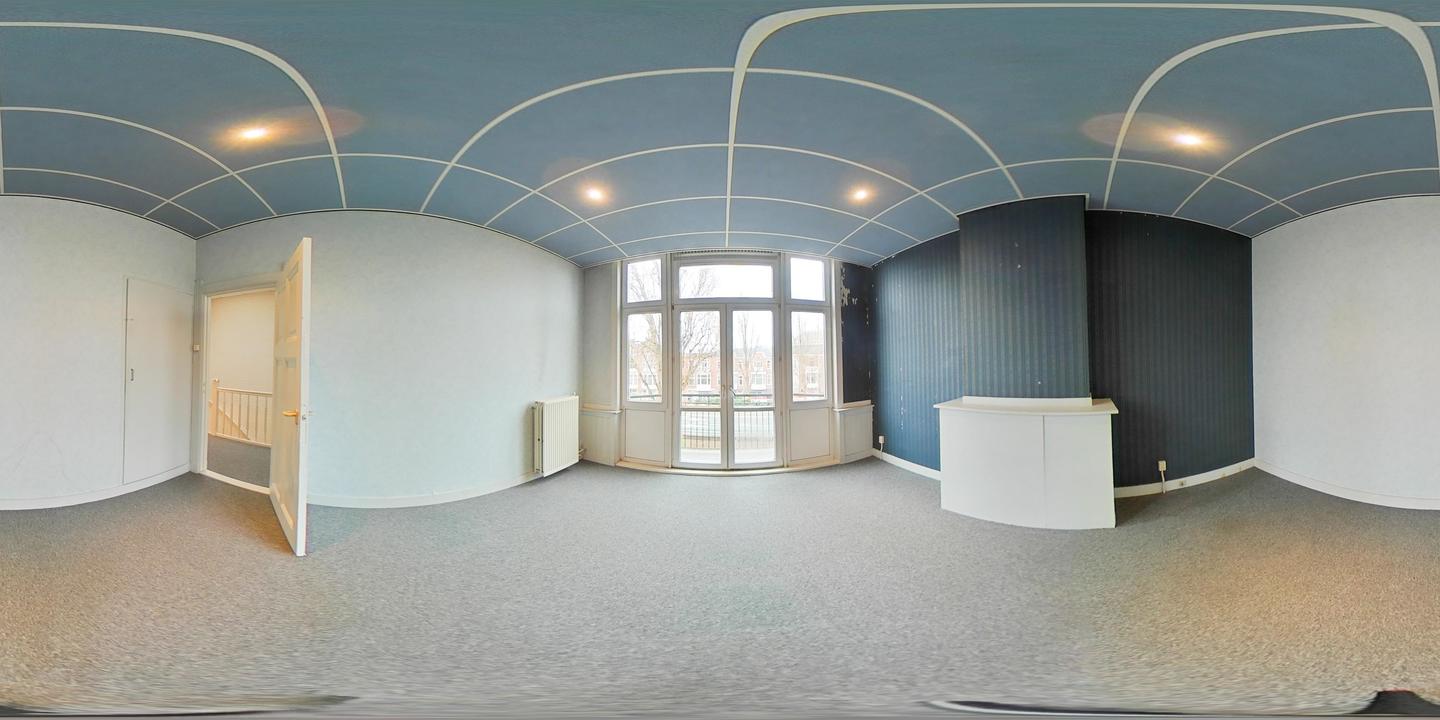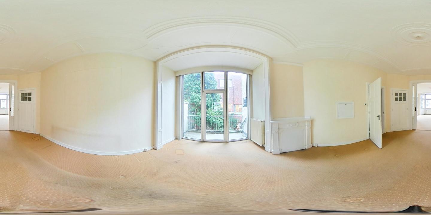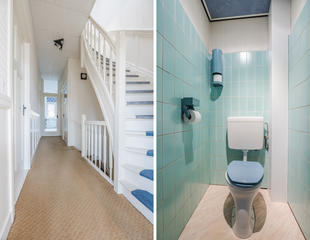 Overloop met een eenvoudig toilet en garderobekast. De royale L-vormige woon-/eetkamer en suite vormt het hart van de woning en biedt met een plafondhoogte van circa 3,19 meter een prettig ruimtelijk gevoel. De voorzijkamer is bij de woonkamer getrokken, maar kan eenvoudig weer worden afgesplitst tot bijvoorbeeld een separate werk- of studeerkamer. De karakteristieke suiteseparatie met schuifdeuren met geslepen glas, drie vaste kasten en de ornamenten plafonds geven de woning veel sfeer en vormen een uitstekende basis voor een eigentijdse modernisering. Aan de achterzijde is er toegang tot het balkon. De dichte keuken bevindt zich aan de achterzijde en is voorzien van een eenvoudig keukenblok, vaste kast en wasmachineaansluiting – ideaal om geheel naar eigen smaak te vernieuwen.