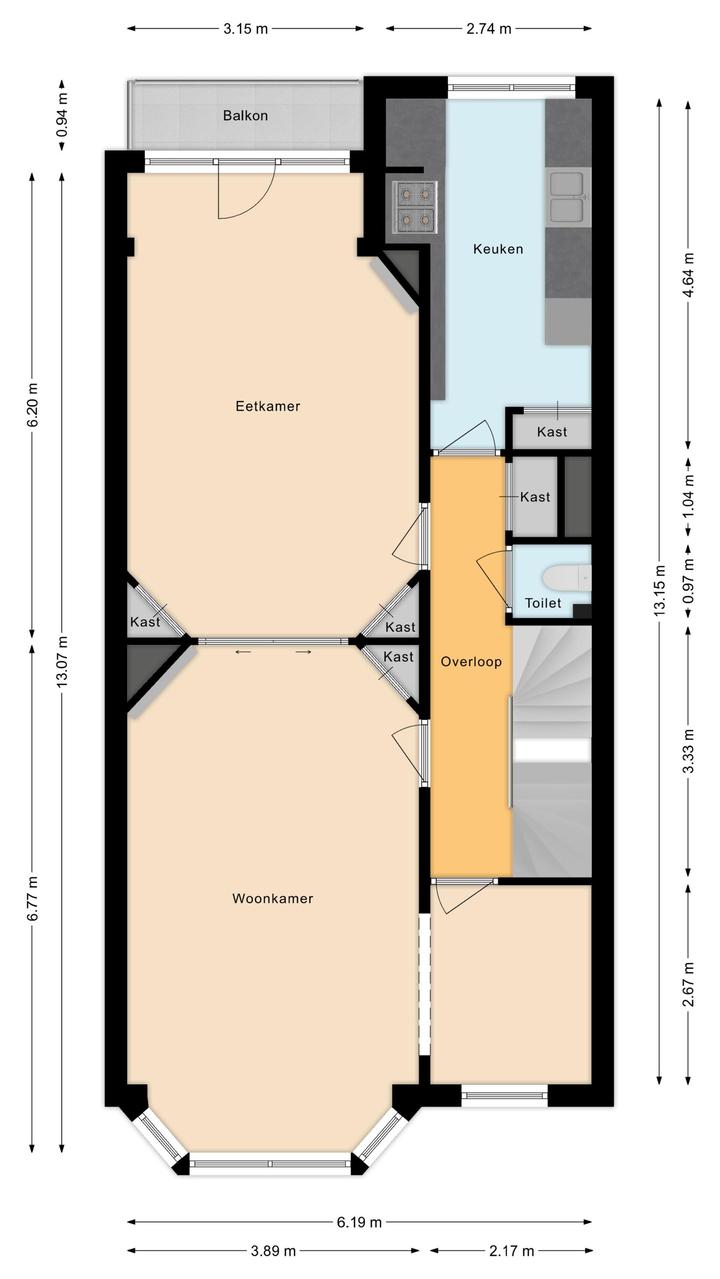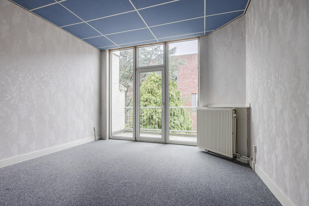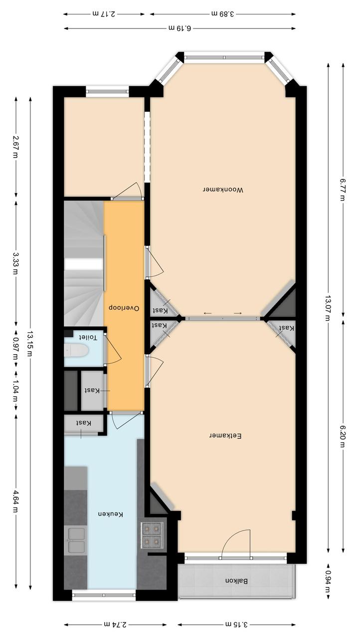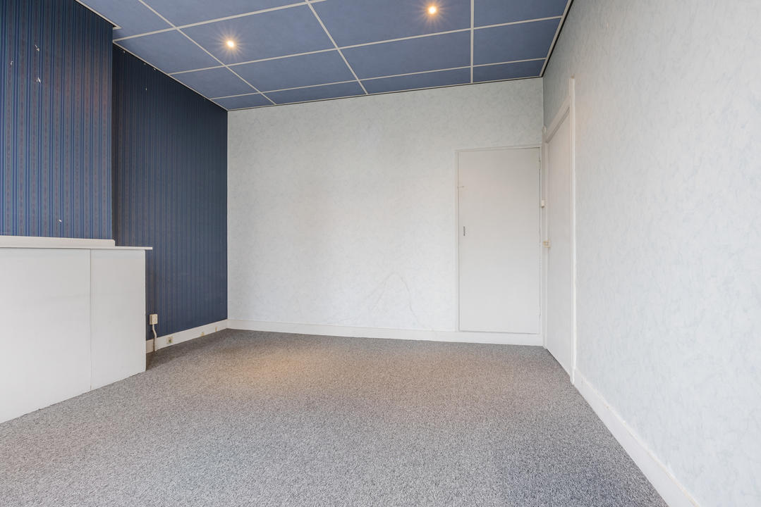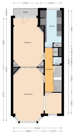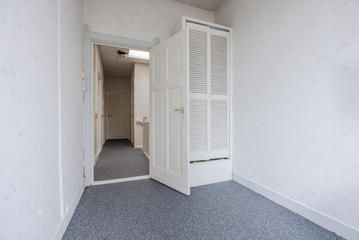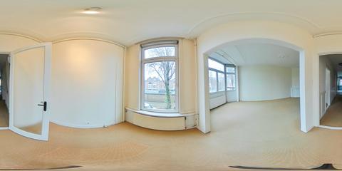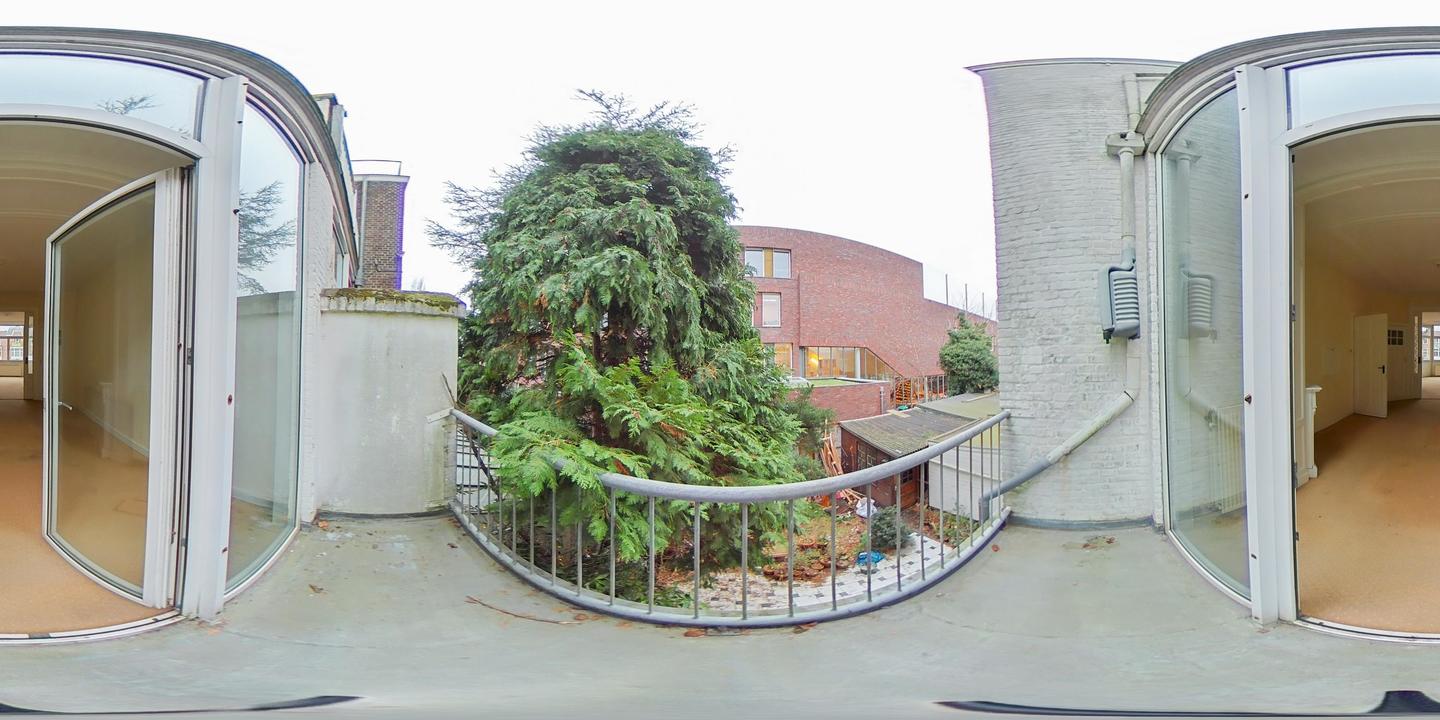 Overloop met een eenvoudig toilet en garderobekast. De royale L-vormige woon-/eetkamer en suite vormt het hart van de woning en biedt met een plafondhoogte van circa 3,19 meter een prettig ruimtelijk gevoel. De voorzijkamer is bij de woonkamer getrokken, maar kan eenvoudig weer worden afgesplitst tot bijvoorbeeld een separate werk- of studeerkamer. De karakteristieke suiteseparatie met schuifdeuren met geslepen glas, drie vaste kasten en de ornamenten plafonds geven de woning veel sfeer en vormen een uitstekende basis voor een eigentijdse modernisering. Aan de achterzijde is er toegang tot het balkon. De dichte keuken bevindt zich aan de achterzijde en is voorzien van een eenvoudig keukenblok, vaste kast en wasmachineaansluiting – ideaal om geheel naar eigen smaak te vernieuwen.