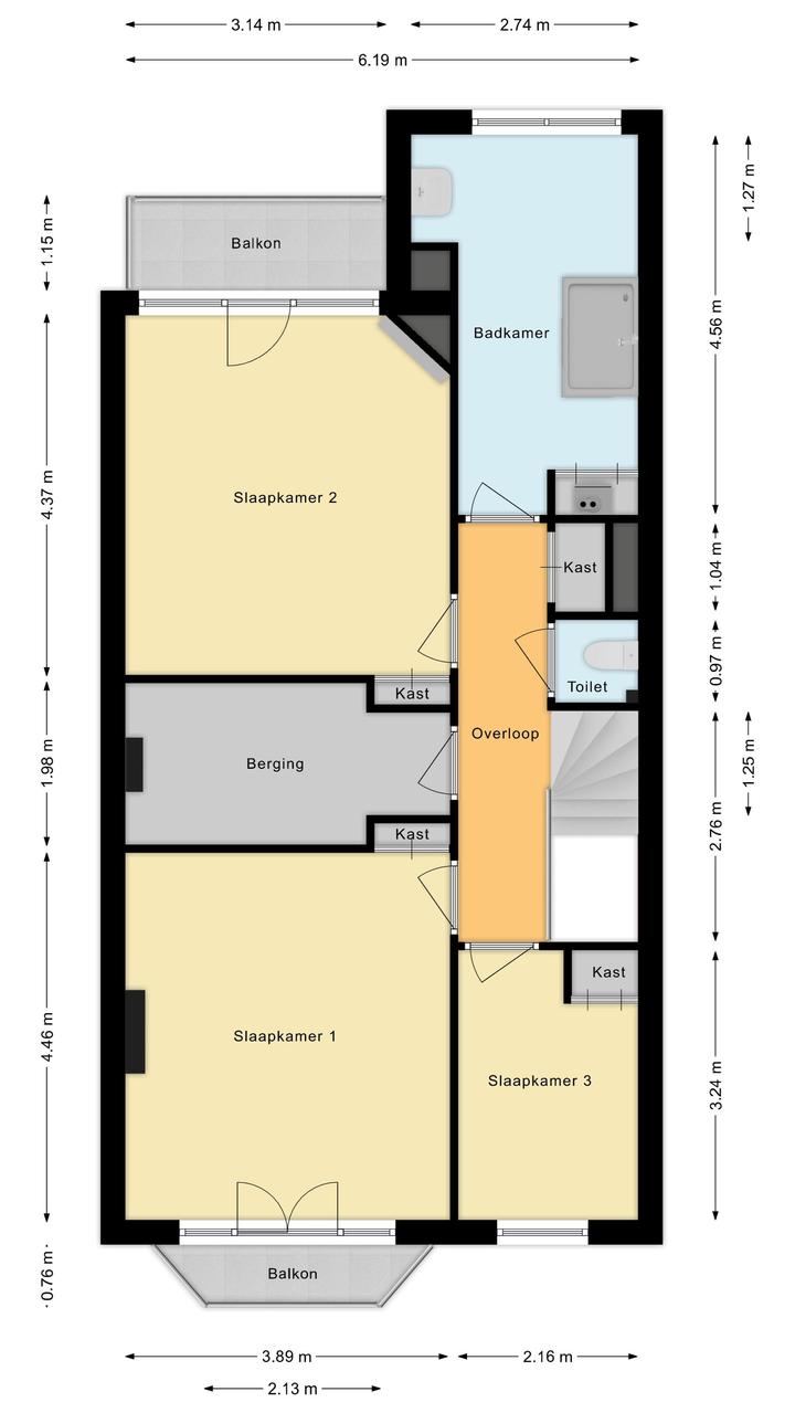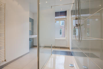 Overloop met toilet en vaste kast. Aan de voorzijde bevindt zich de voorzijkamer met vaste kast en een ruime slaapkamer met vaste kast en openslaande deuren naar het balkon aan de voorzijde. Aan de achterzijde ligt de derde slaapkamer eveneens voorzien van een vaste kast en toegang tot het balkon aan de achterzijde. De zeer ruime badkamer aan de achterzijde beschikt over een douche, wastafel en een vaste kast met de opstelplaats van de cv-ketel.